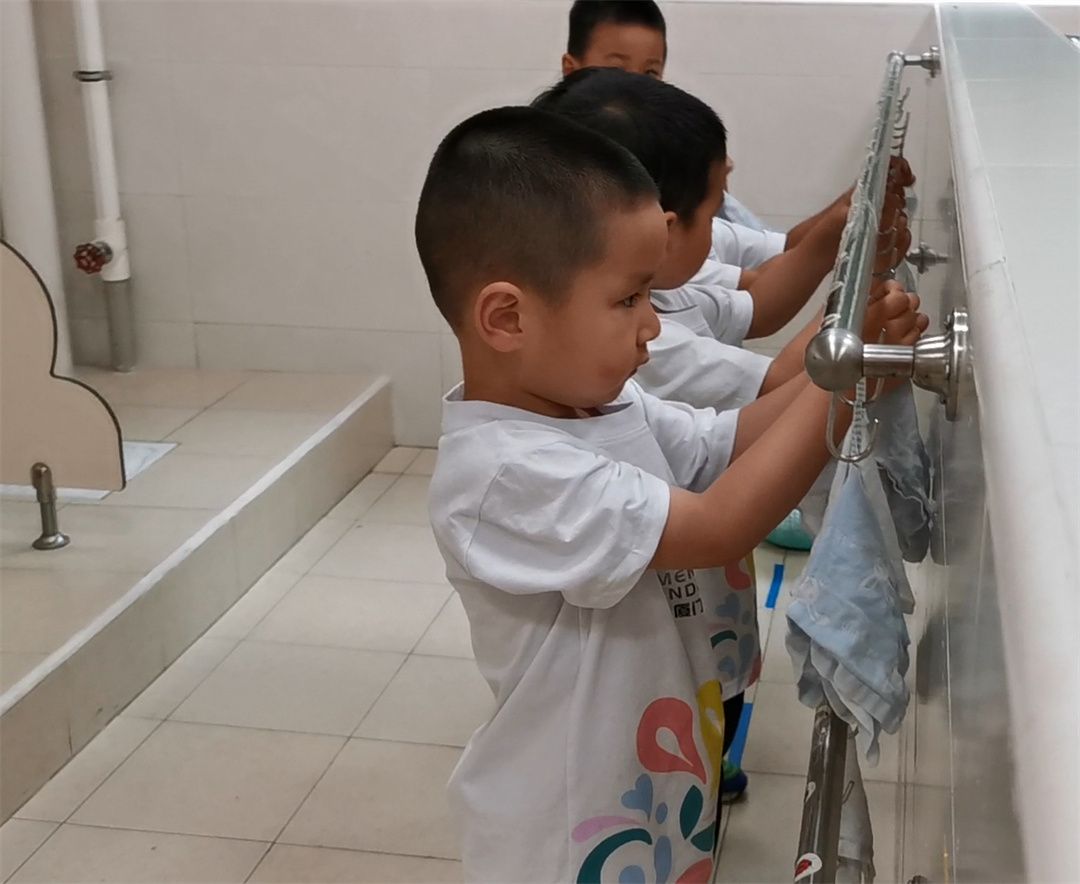 小朋友进入班级已经养成良好的生活习惯,进入盥洗室里洗手,挂毛巾、再把杯子放在架子上。
