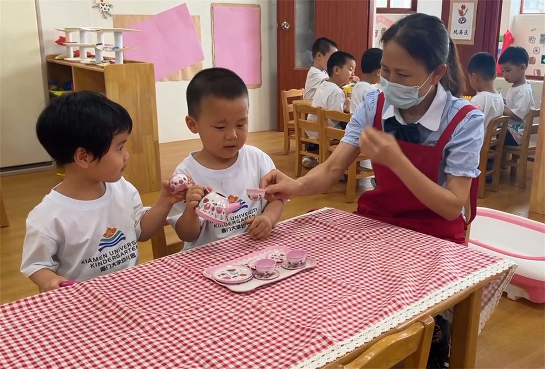 在家庭区小朋友邀约尹老师喝下午茶呢!