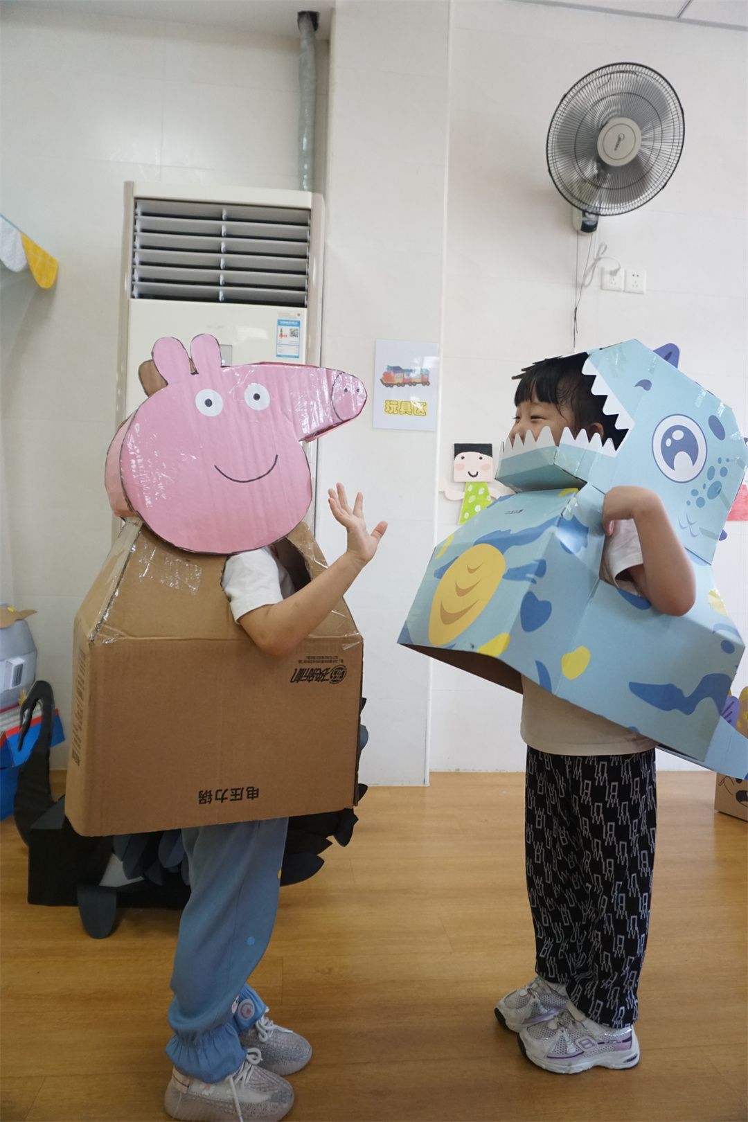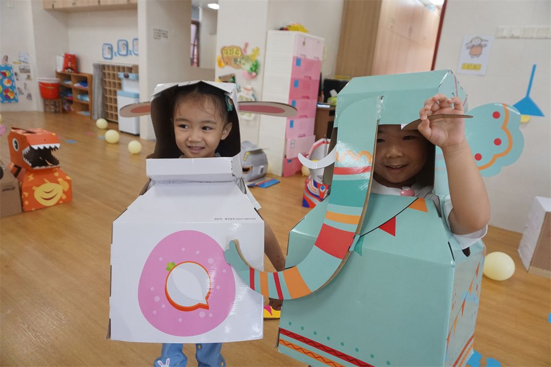 欢迎来到纸箱世界!纸箱世界里有我们最喜欢的各种纸箱头饰、盔甲、动物服饰等,我们在老师的帮助下选择自己喜欢的角色进行装扮,大恐龙、蜘蛛侠、奥特曼、飞行员……
