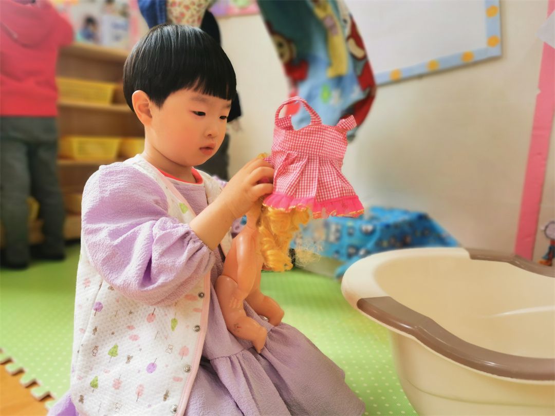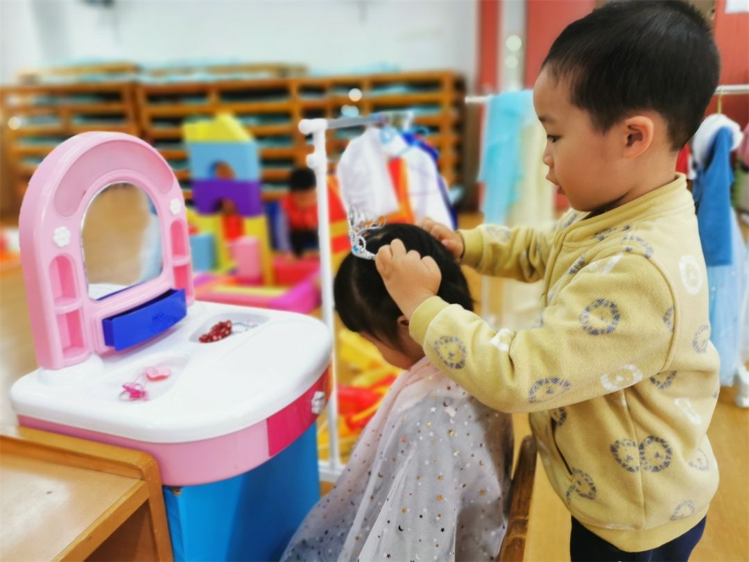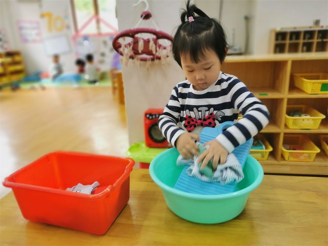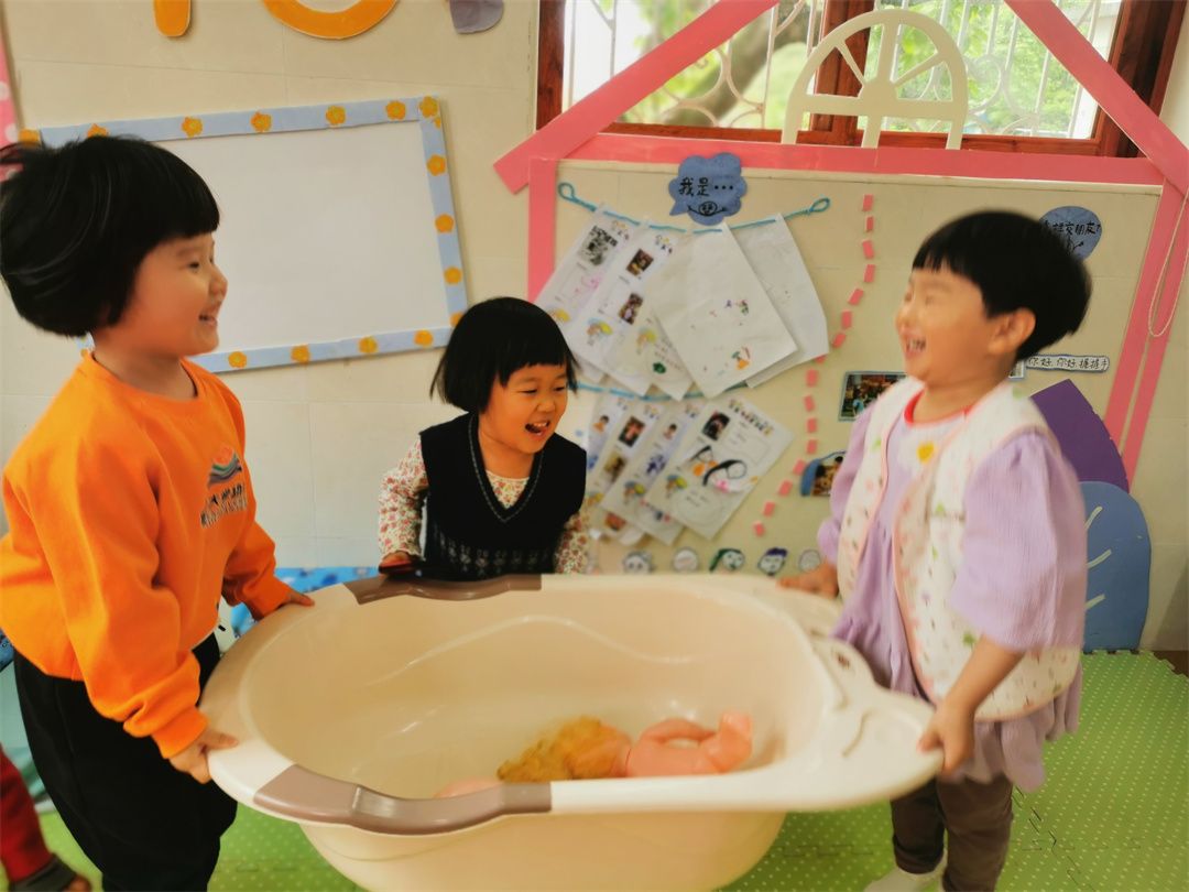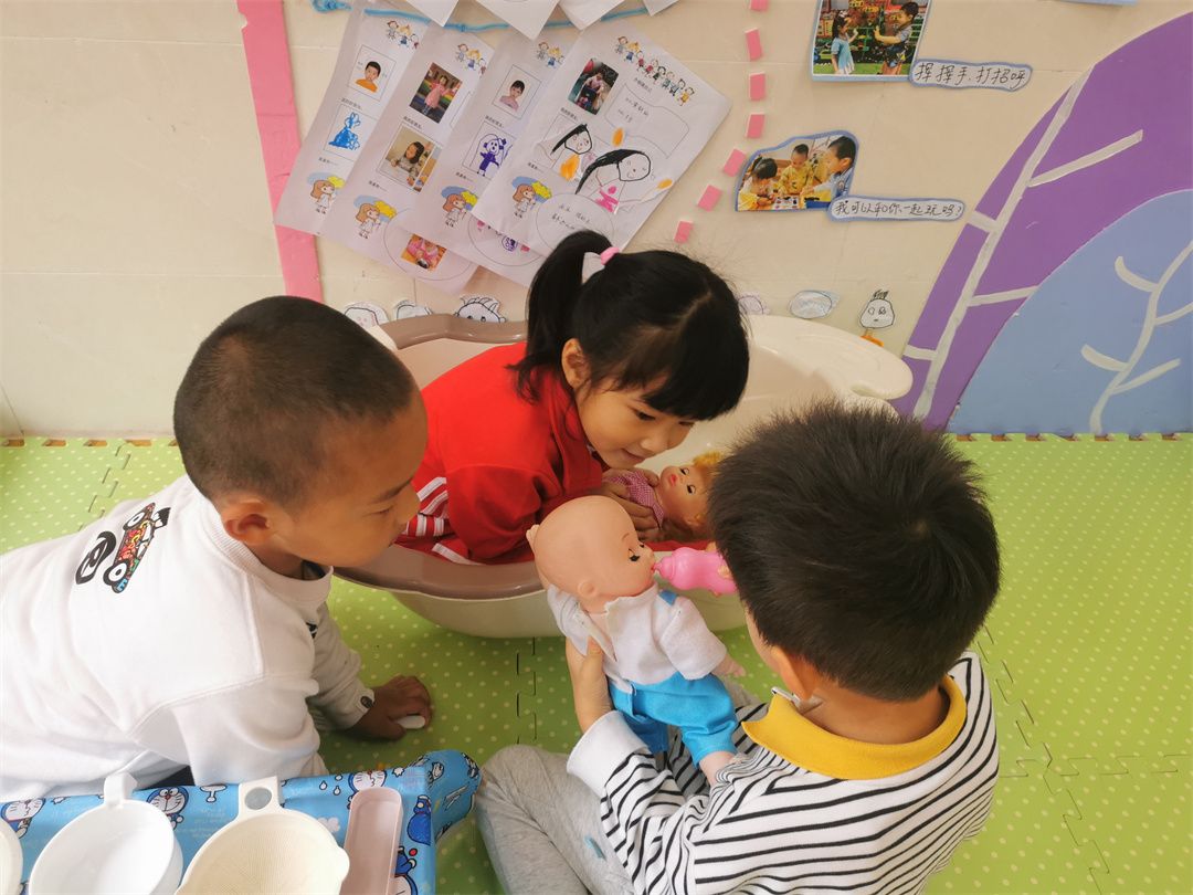 家庭区中他们扮演着各种角色,“爸爸”做饭、“姐姐”熨衣服、“妈妈奶奶”给“宝宝”洗澡等等……;积木区中他们往往十分忙碌,因为他们的双手和头脑始终处于积极的状态,造型各异的模型车辆、小房子……促使孩子们乐此不疲地在自己的小天地里畅游;表演区中“小演员”们有模有样,尽情展现自己的才能;还有图书区认真看书的样子,艺术区中画画、玩泥、剪纸等等,他们对自己动手做出来的作品产生了极大的满足感……