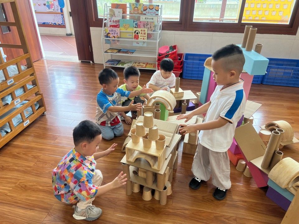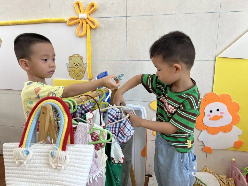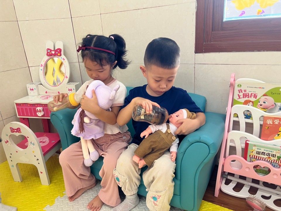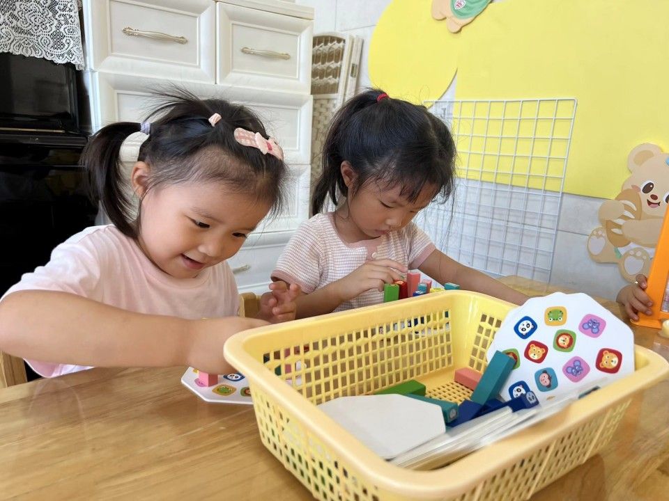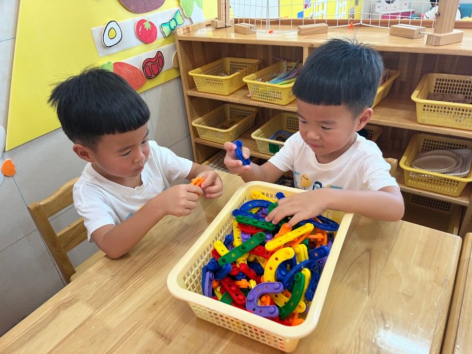 区域活动一开启,教室立刻成了热闹的 “小天地”:建构区的 “小小建筑师” 正专注地搭起城堡;美工区的 “小画家” 握着彩笔,在画纸上涂出色彩斑斓的奇思妙想;娃娃家里,“小爸爸” 轻拍 “宝宝” 的背,“小妈妈” 仔细整理小被子,有模有样的照顾中,藏着对 “责任” 的初体验。宝贝们在搭积木、过家家的互动中 “玩中学”,把知识藏进笑声里;
