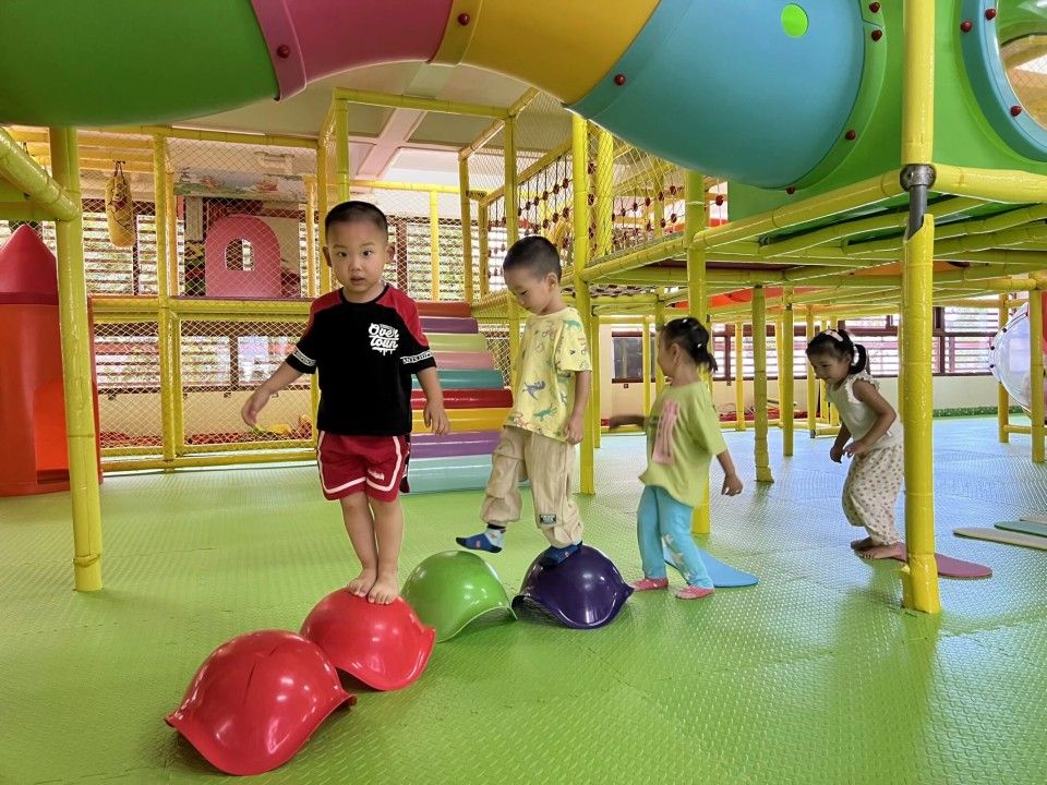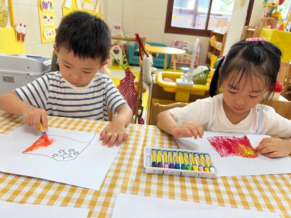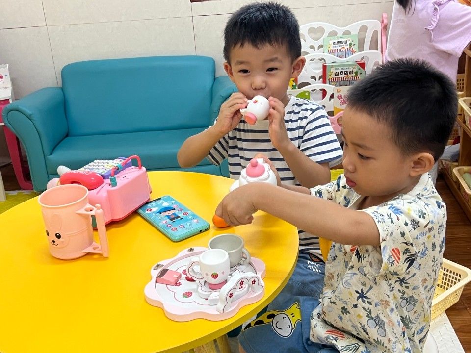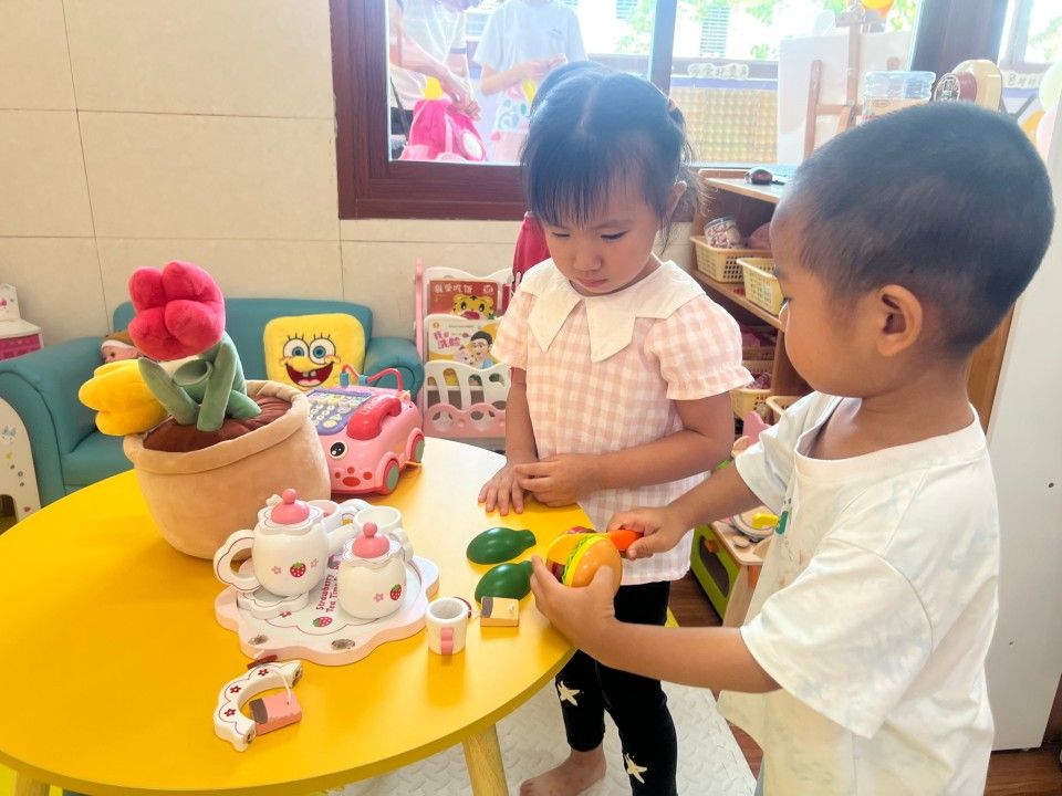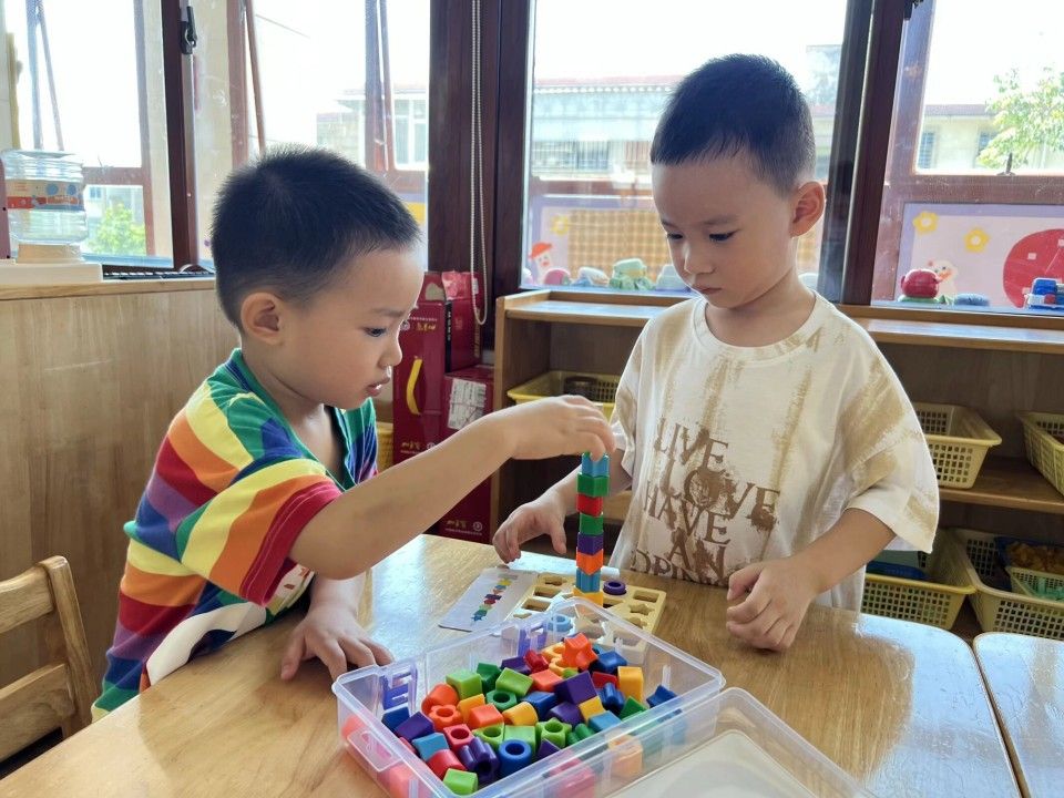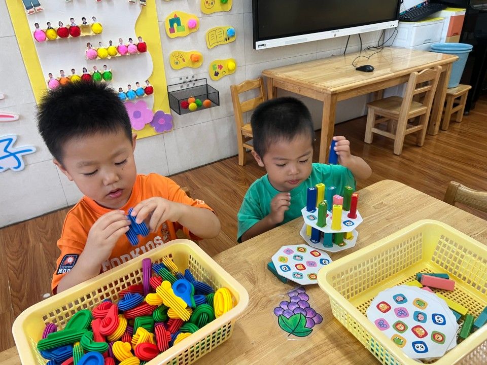 区域活动一开启,教室立刻成了热闹的 “小天地”:建构区的 “小小建筑师” 正专注地搭起城堡;美工区的 “小画家” 握着彩笔,在画纸上涂出色彩斑斓的奇思妙想;娃娃家里,“小爸爸” 轻拍 “宝宝” 的背,“小妈妈” 仔细整理小被子,有模有样的照顾中,藏着对 “责任” 的初体验。宝贝们在搭积木、过家家的互动中 “玩中学”,把知识藏进笑声里;