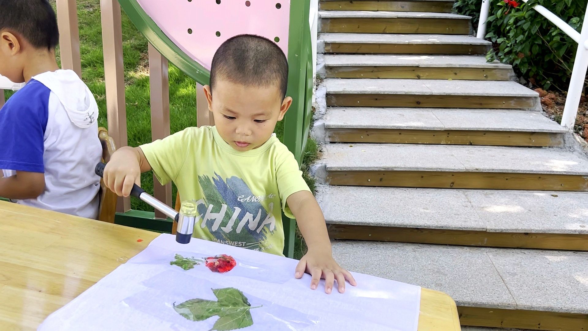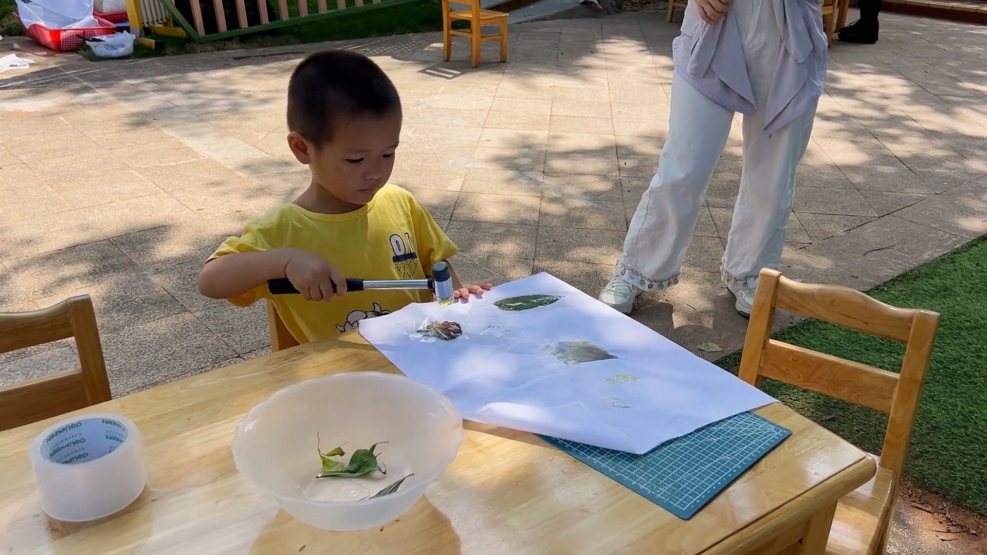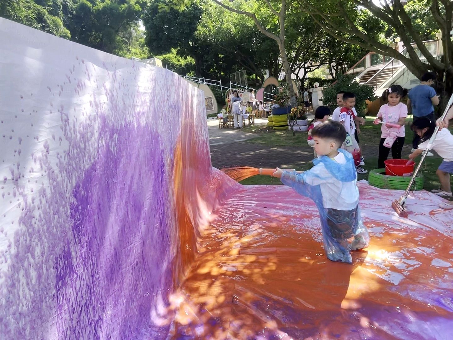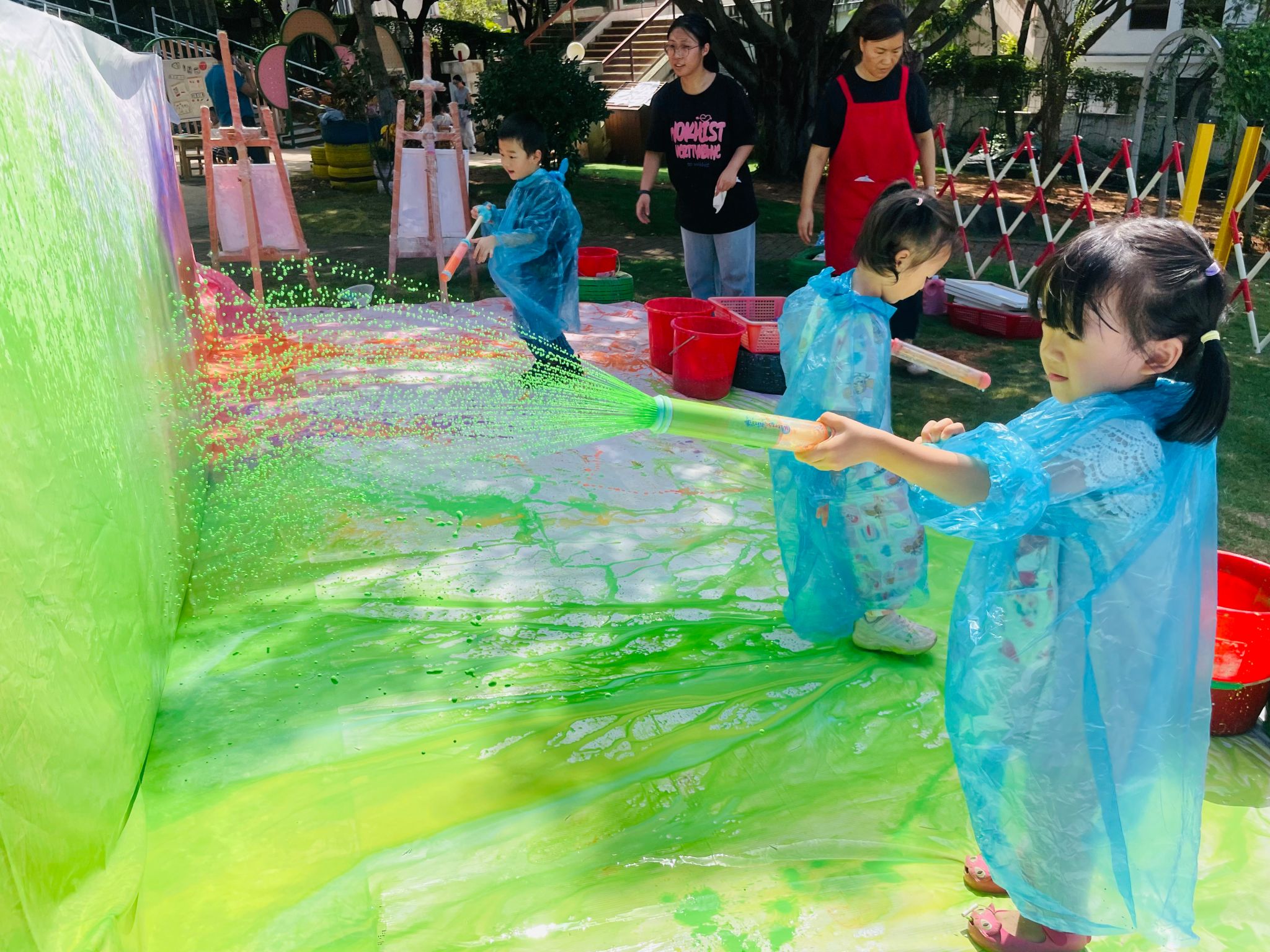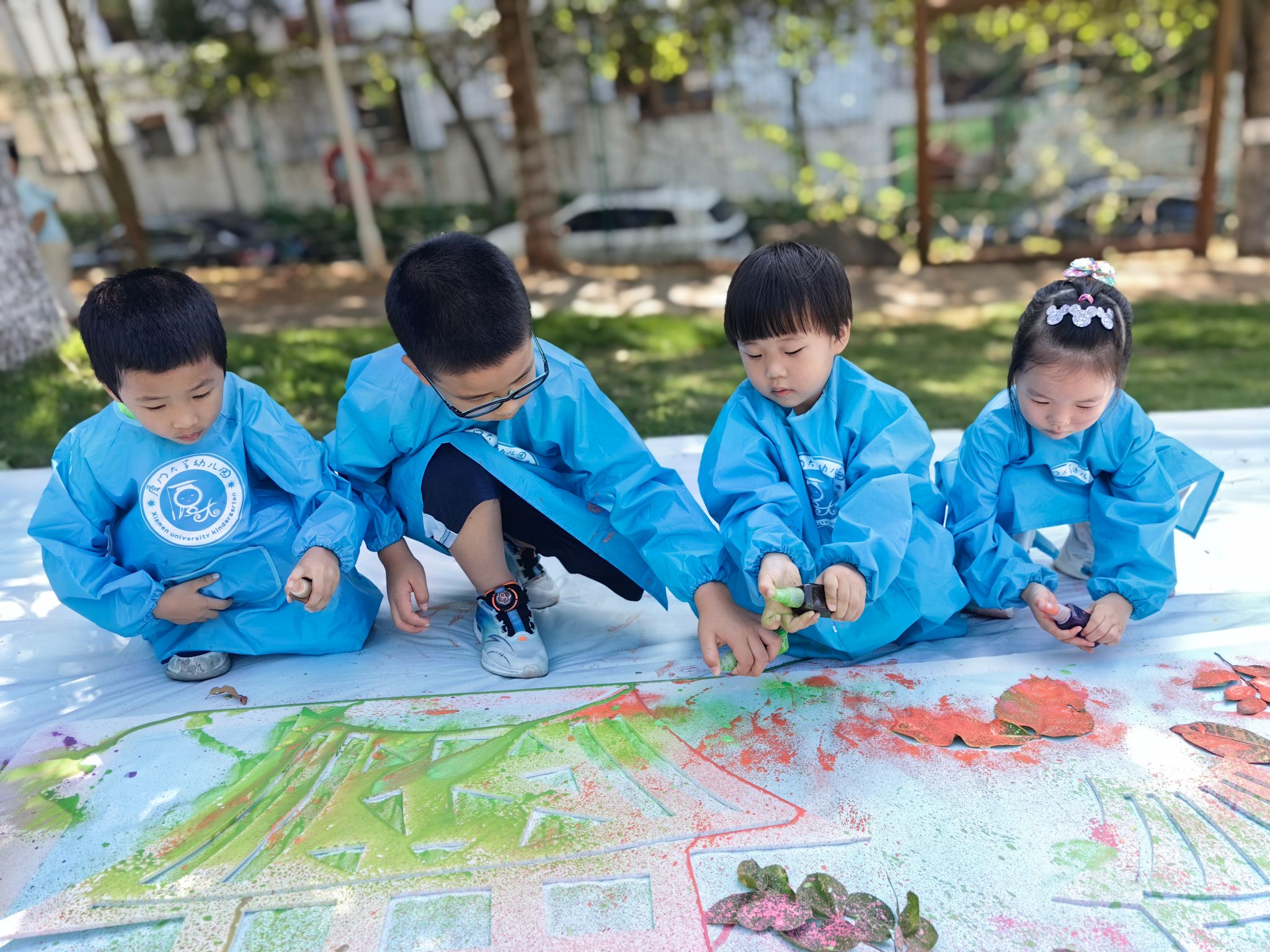 在“色彩日”活动中,整个幼儿园变成了色彩的海洋,一起玩转颜色。水枪吸上颜料喷洒在布上,自由创作;用小锤子捶打树叶,发现树叶也能有不同的色彩。色彩在指尖舞动,一幅幅充满想象力的作品诞生了。孩子们在游戏与艺术中,感受了色彩的魅力。