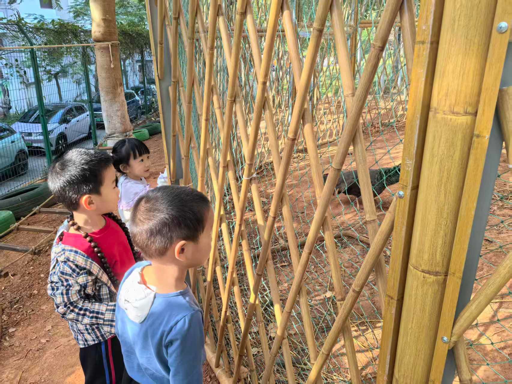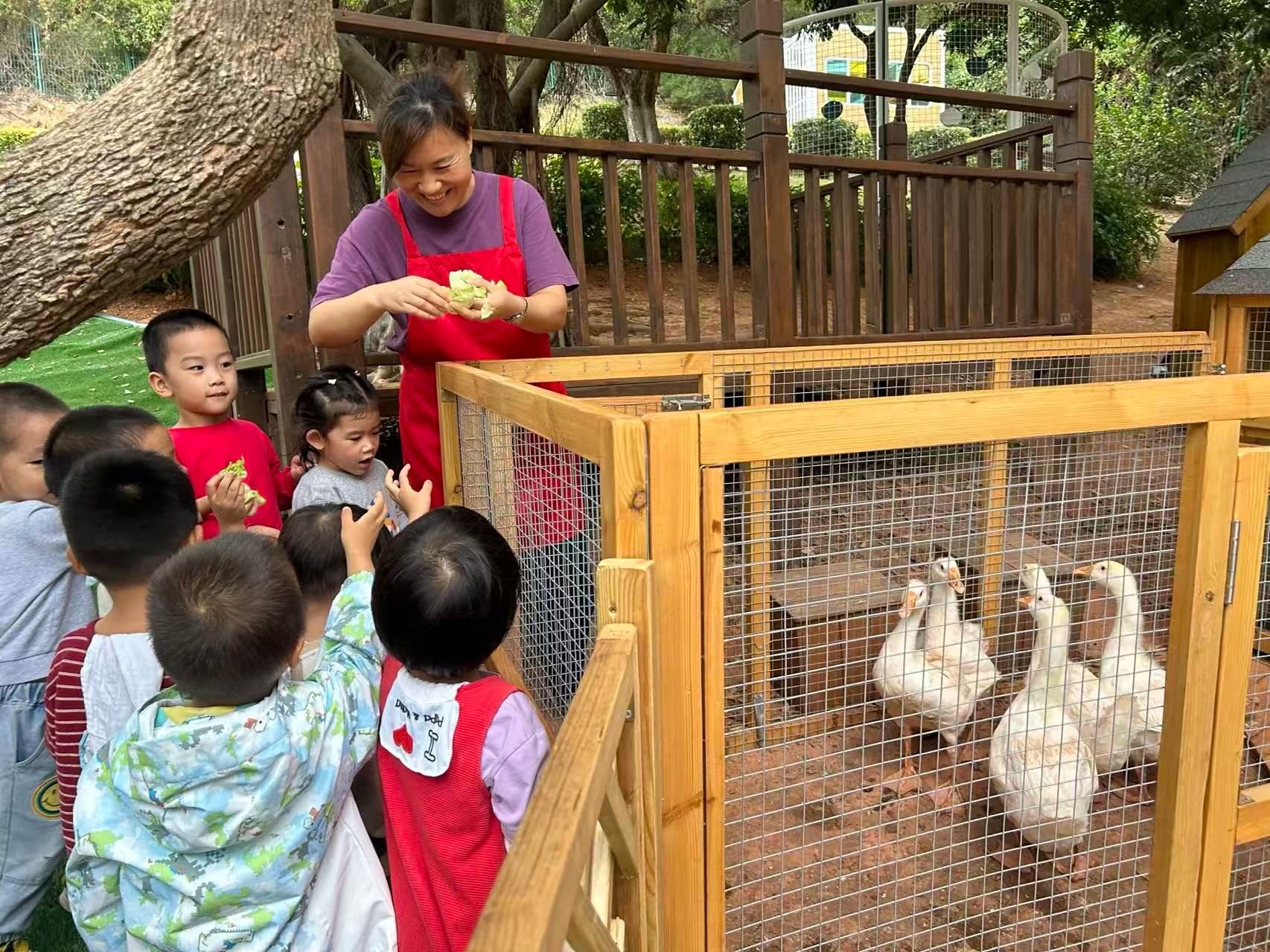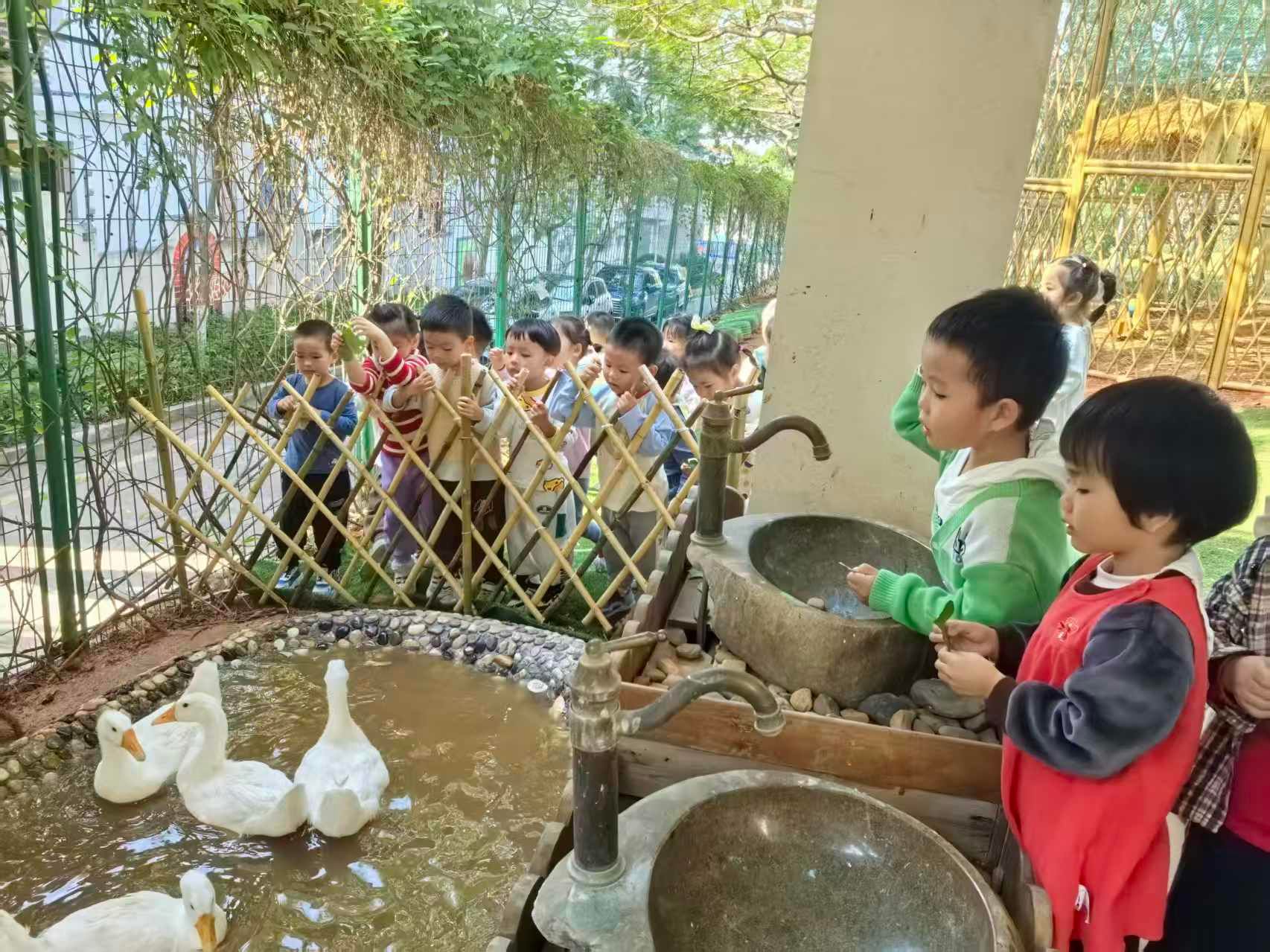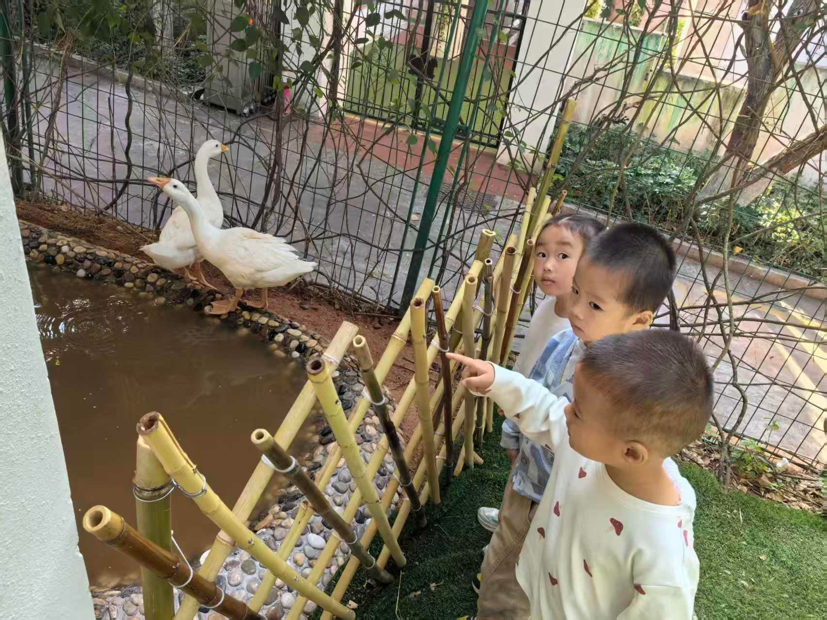 “哇!是孔雀和小松鼠呀!”孩子们排着整齐的队伍,兴奋地走进萌动乐园。看到拖着华丽长尾羽的孔雀、蹦跳灵动的机灵松鼠,还有小水塘里悠闲游弋的白鹅,宝贝们满眼都是藏不住的惊喜。在老师引导下,大家轻轻挥手与萌宠问好,小心翼翼地给白鹅投喂食物,认真寻找松鼠的踪迹,小声念叨着“孔雀羽毛真好看”“小松鼠尾巴好蓬松”,稚嫩的话语里满是对小动物的纯粹喜爱。