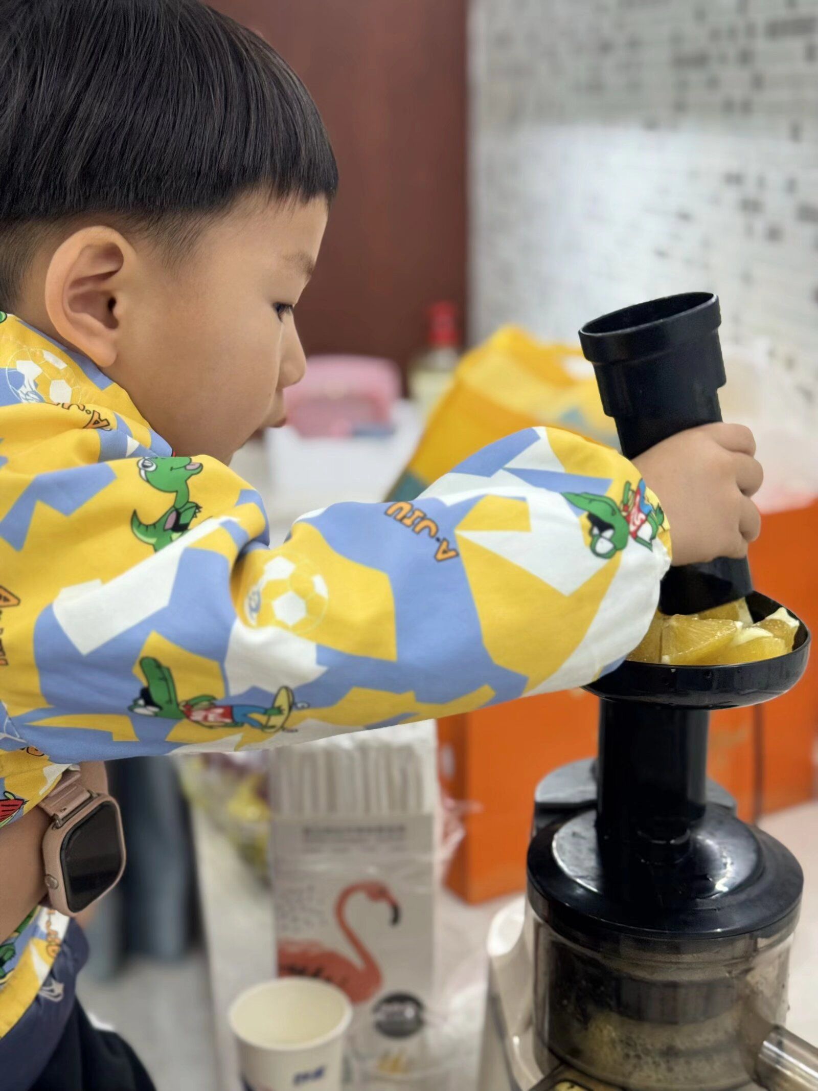 随后,最令人期待的亲子水果美食DIY环节正式开启。活动区域划分了水果拼盘组、水果沙拉组、水果榨汁组,欢快的背景音乐萦绕耳畔,为创作增添了不少活力。宝贝们在家长的陪伴下,有序分组参与制作。家长们耐心协助宝贝们清洗水果、使用儿童安全刀具,宝贝们则专注地摆弄着食材,小手灵活地切着软软的水果、认真地摆放造型、小心翼翼地搅拌沙拉酱,每一个动作都充满了认真。有的家庭合力打造出创意造型的水果拼盘,有的搭配出酸甜可口的水果沙拉,还有的忙着榨制新鲜营养的果汁,现场笑声不断,亲子间的默契在指尖流转,温馨的画面定格在每一个瞬间。