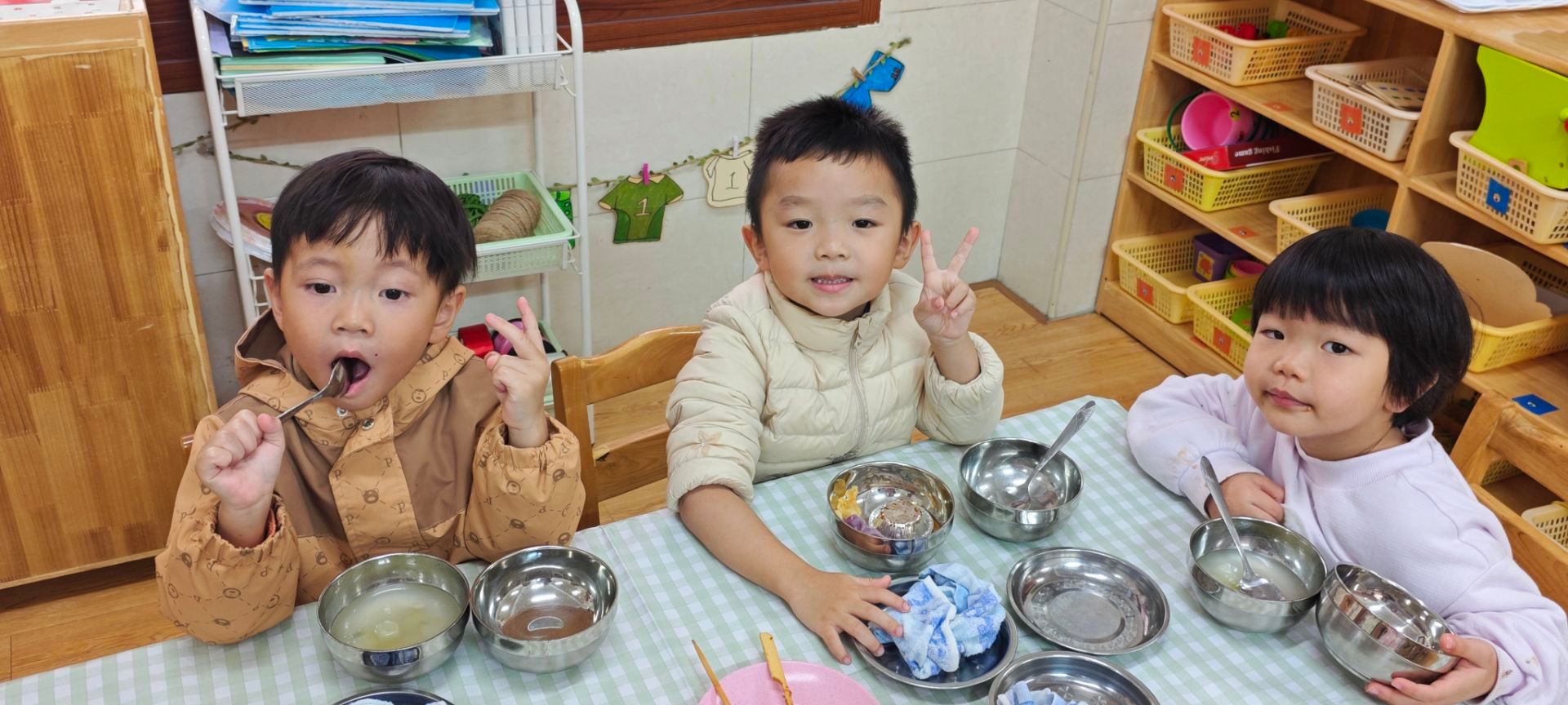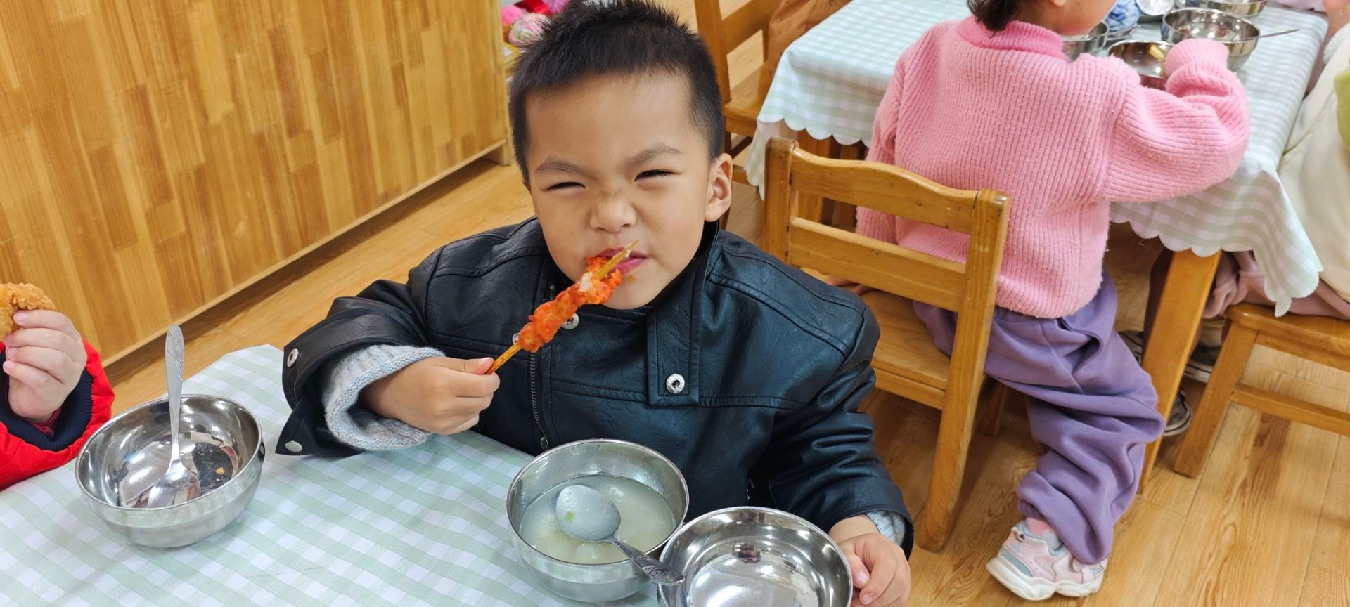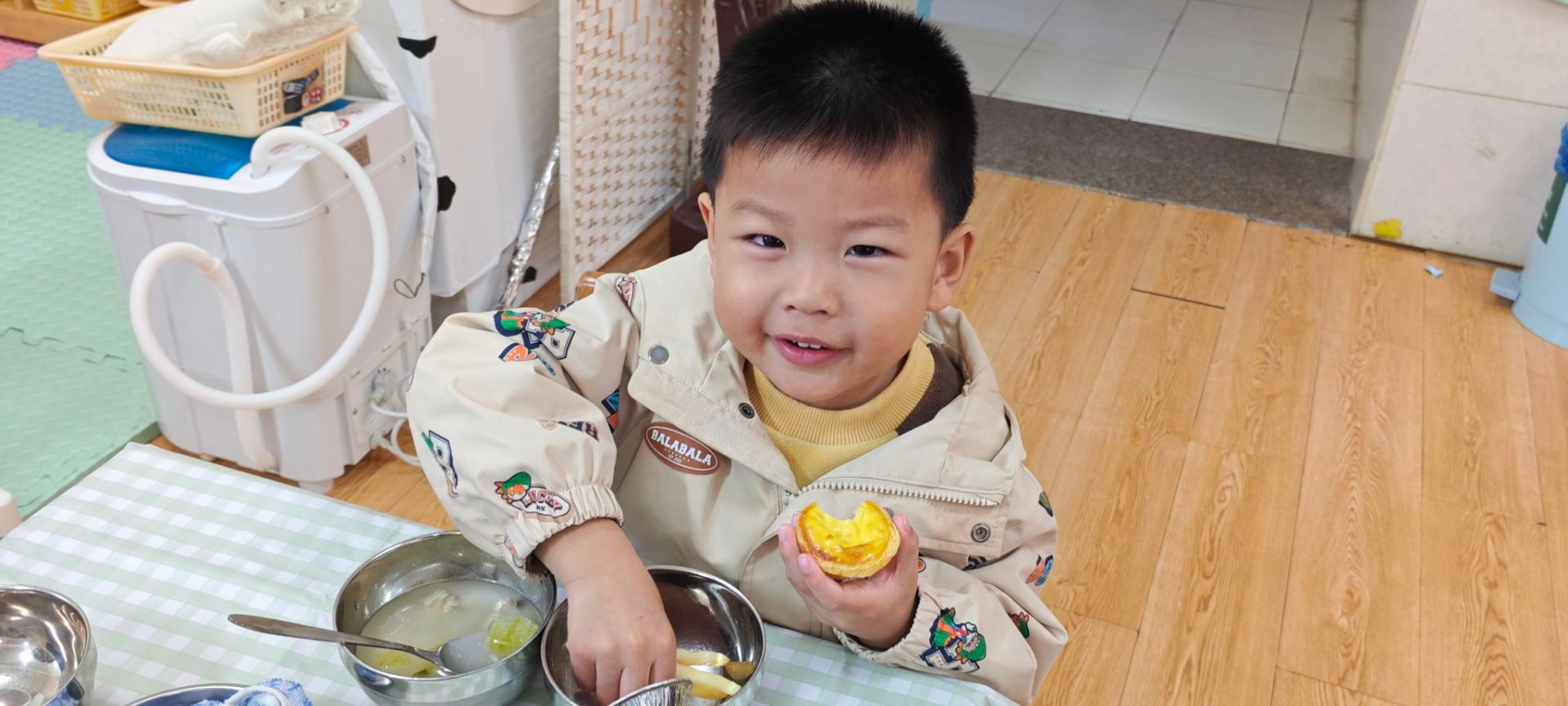 教室变身成了温馨的自助餐厅!瞧,宝贝们正端着小餐盘,化身为自主选择的“美味小当家”,认真地在美食前思考、挑选。有的小心夹起诱人的肉丸,有的仔细给自己添上蔬菜,每一步都充满了成长的仪式感。在分享美食的满足笑容里,他们不仅品尝到了美味的快乐,更在无形中学会了选择、排队与分享——原来,好好吃饭也能成为一场关于独立与礼仪的可爱课堂。