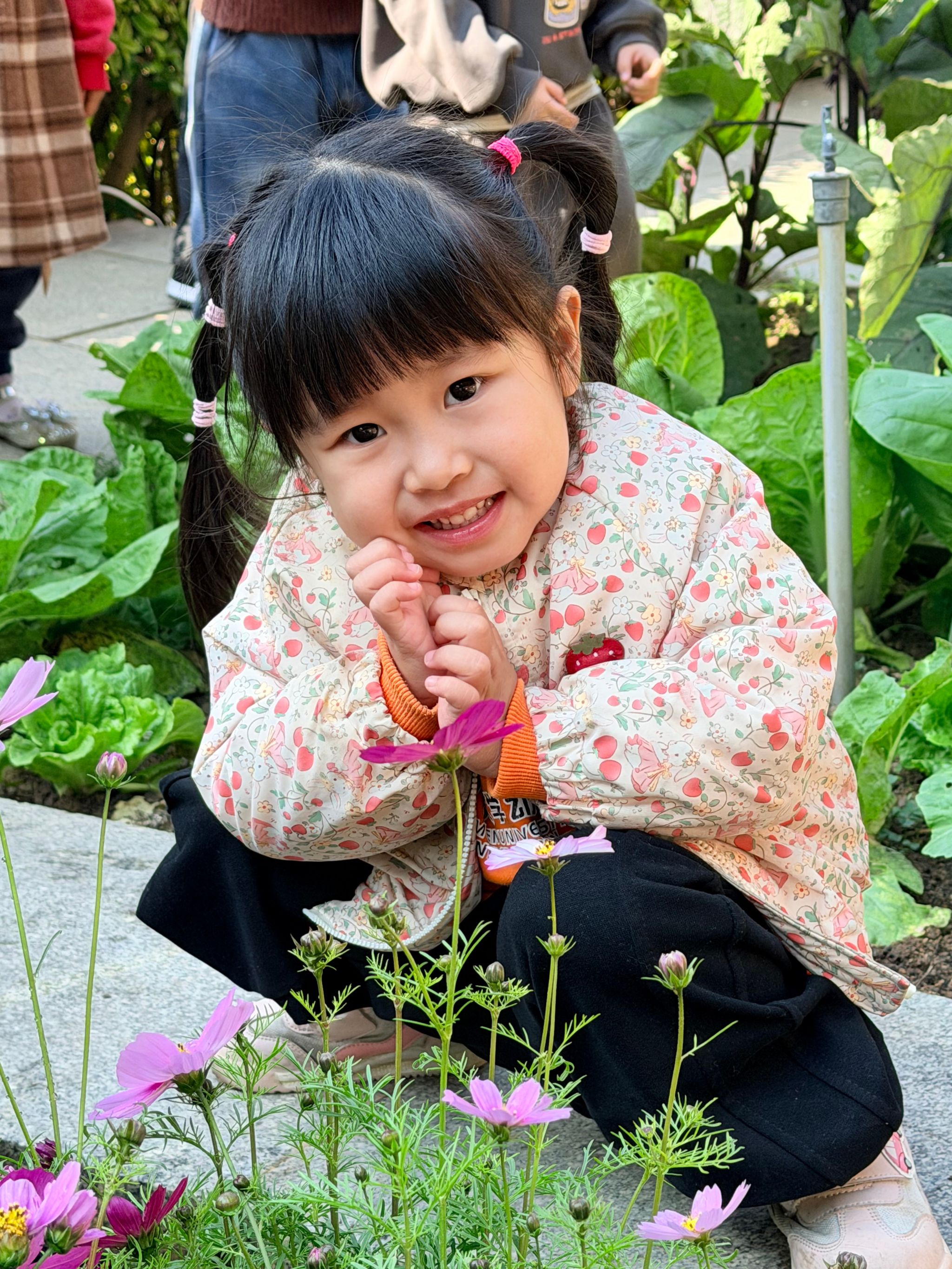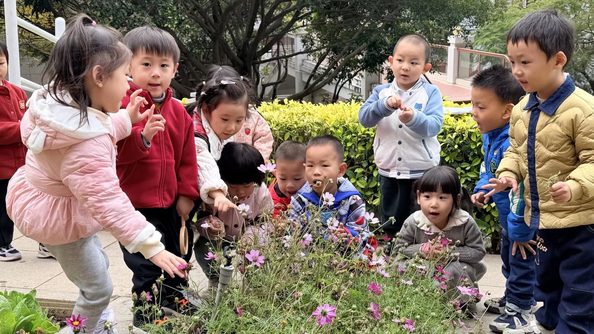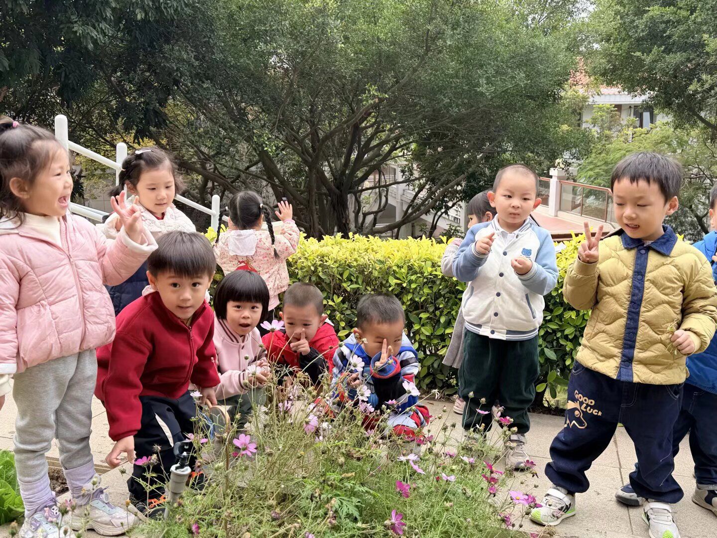 快看!我们菜地培育的格桑花开啦!粉的、紫的、白的、黄的,五颜六色的花朵在微风中轻轻摇曳,像一个个可爱的小喇叭,吹奏着冬日的赞歌。宝贝们兴奋地围在菜地边,仔细观察着每一朵格桑花。“这朵粉色的花好漂亮呀!”“我看到蜜蜂在花上采蜜呢!” 大家小心翼翼地凑近花朵,轻轻闻着花香,感受着花朵的柔软。在照料格桑花的过程中,宝贝们学会了观察植物的生长,懂得了珍惜劳动成果,更在心中种下了热爱自然的种子。