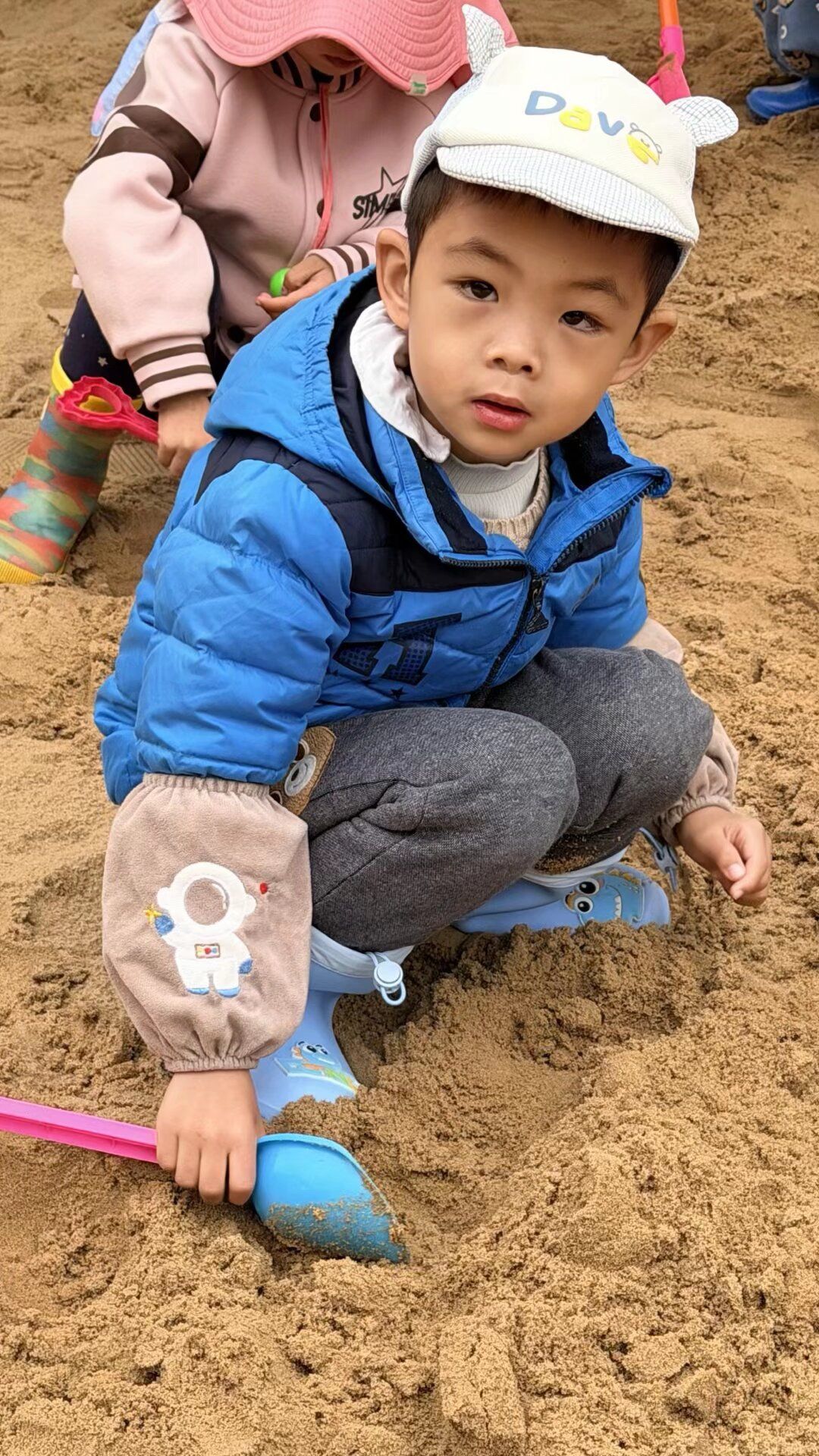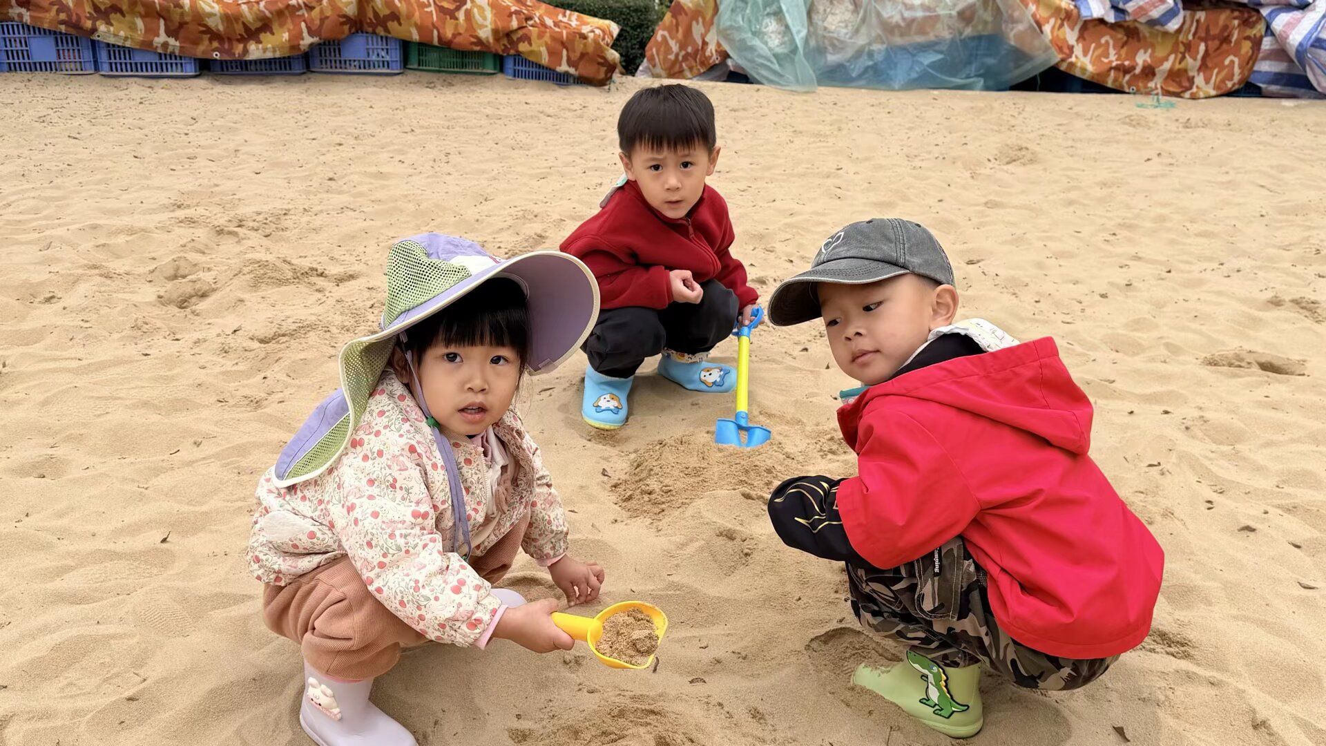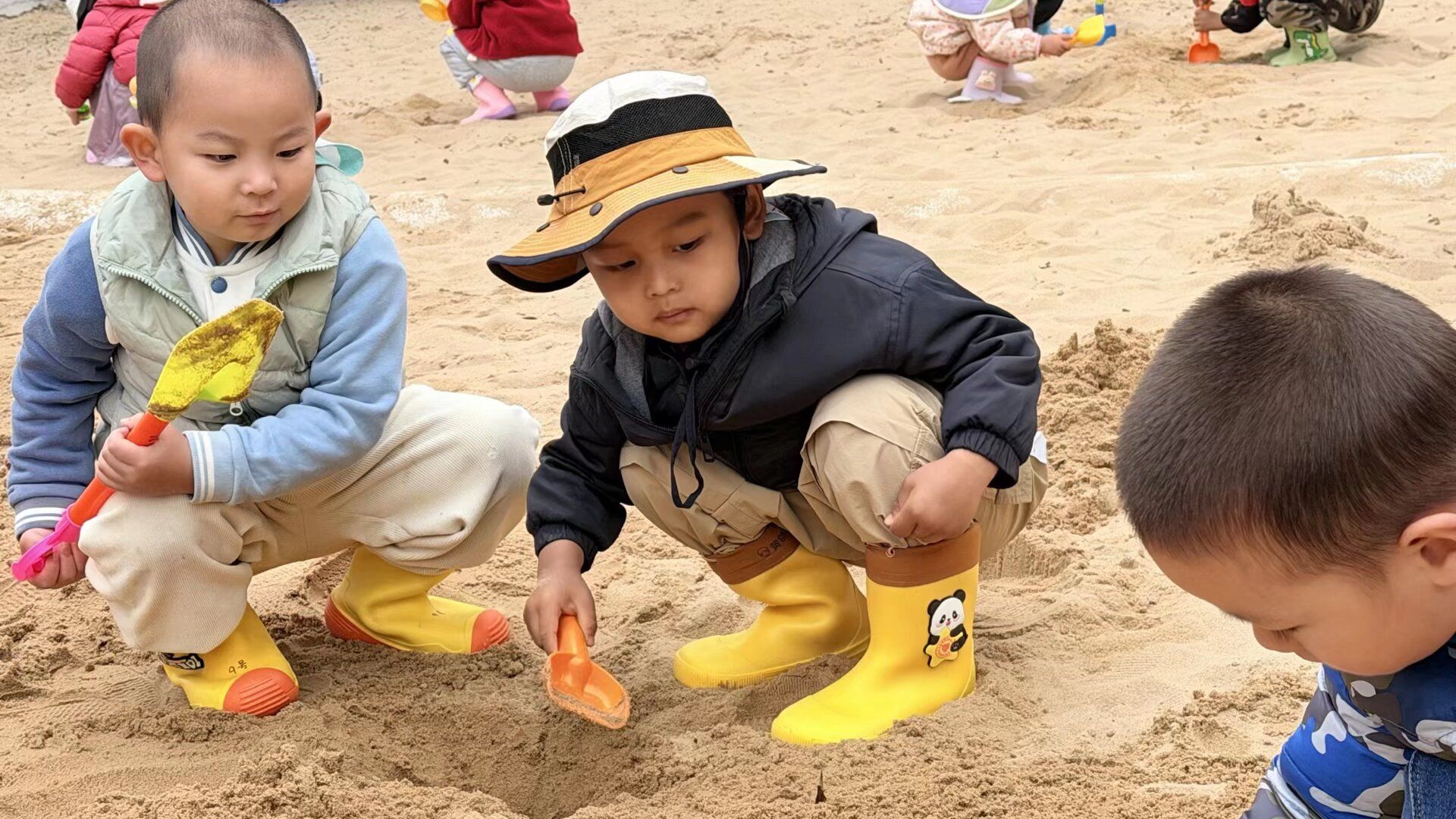 哇!终于轮到我们玩沙池啦!宝贝们兴奋地换上小靴子,拿着小铲子、小桶等工具,一头扎进了沙池的世界。“我要堆一个大大的沙堡!”“看,我挖了一条河” 沙池里,宝贝们尽情地挖沙、堆沙、运沙,忙得不亦乐乎。有的宝贝用沙子堆砌成小山,有的宝贝在沙地上画出可爱的图案,还有的宝贝合作挖了长长的 “小河”。细腻的沙子从指尖滑落,留下一串串快乐的笑声,宝贝们,尽情享受着与沙子亲密接触的乐趣。、