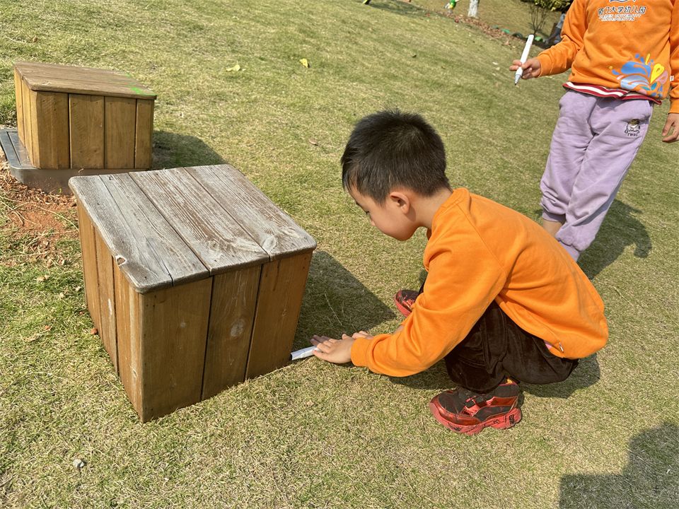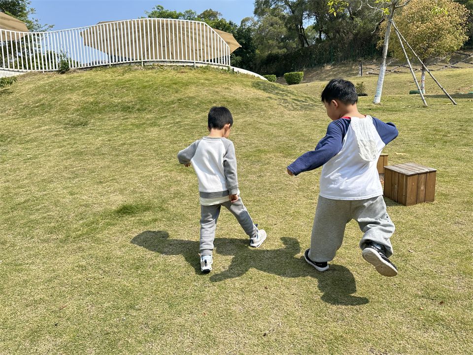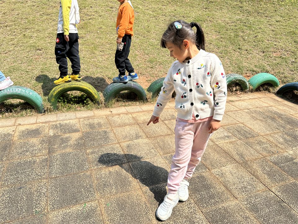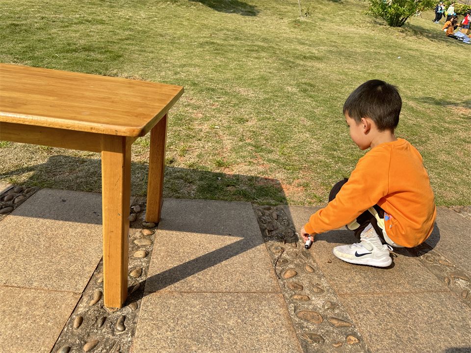那影子在哪里呢?孩子们立马四处寻找影子,有的蹲在草地上研究各种玩具器械的影子,有的去观察周围大树、木屋的影子。