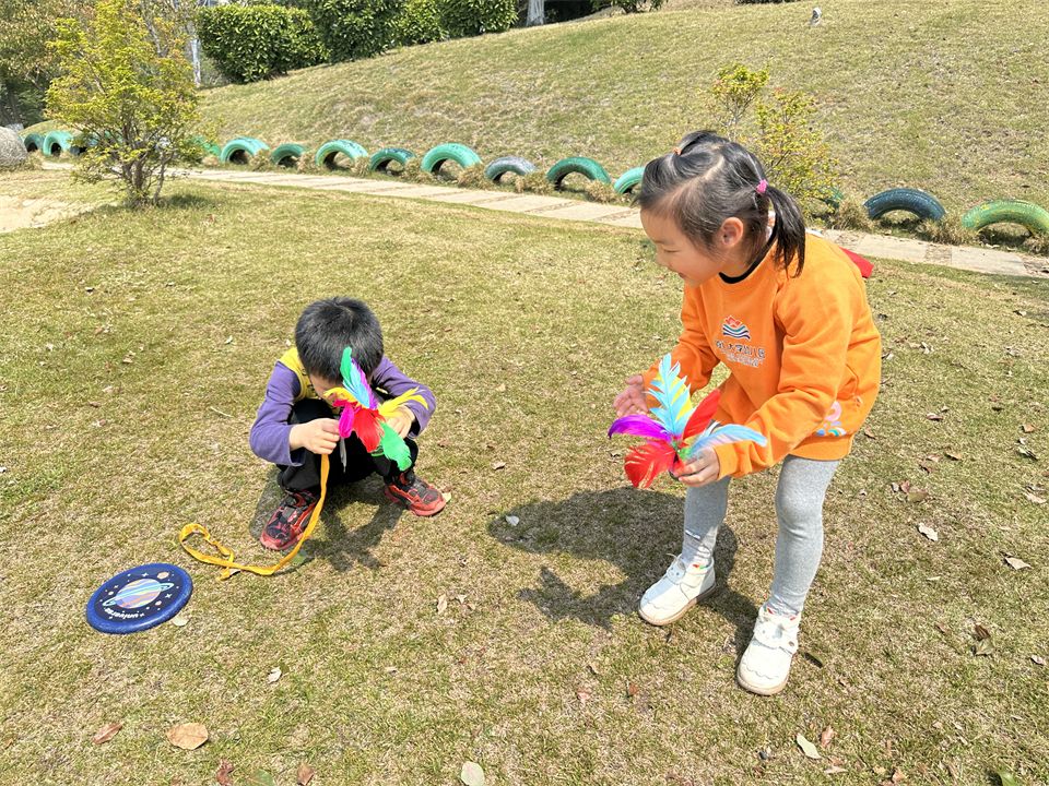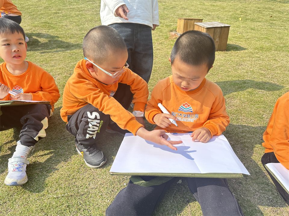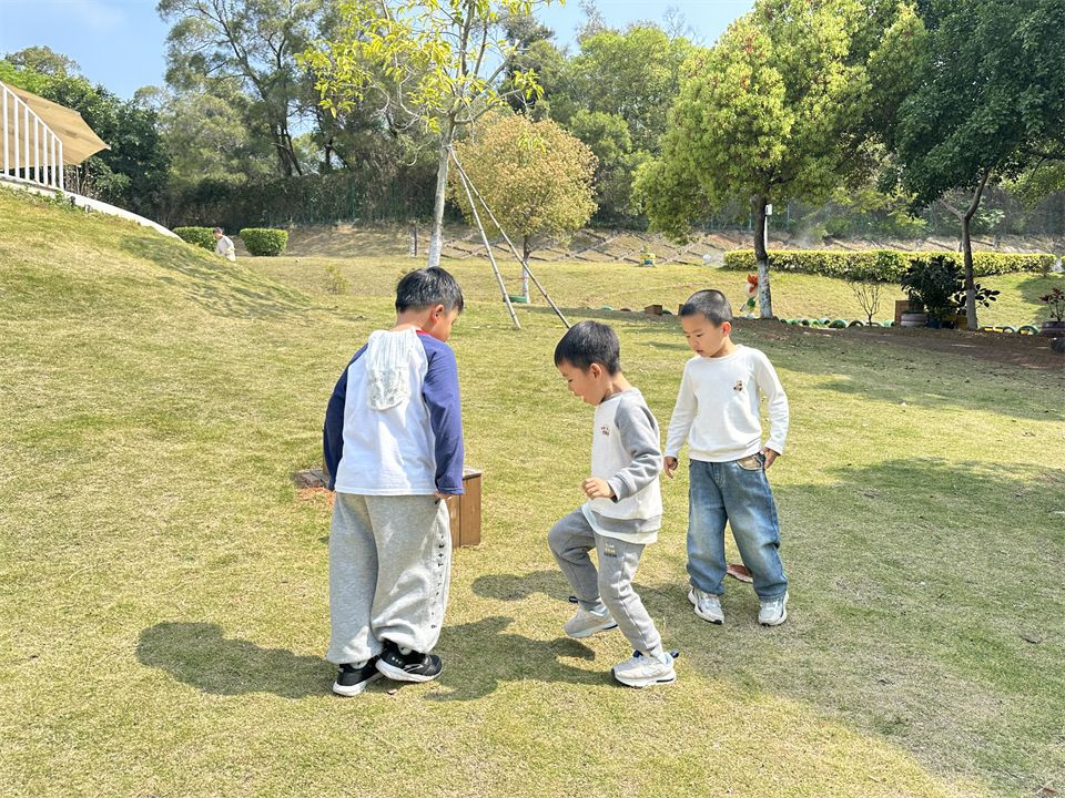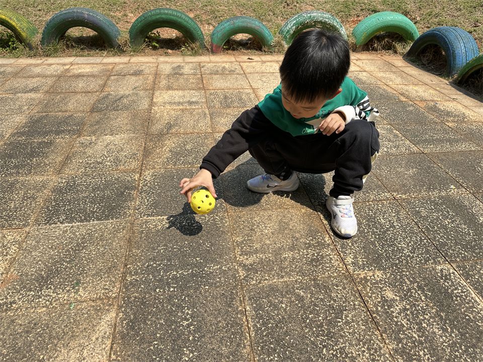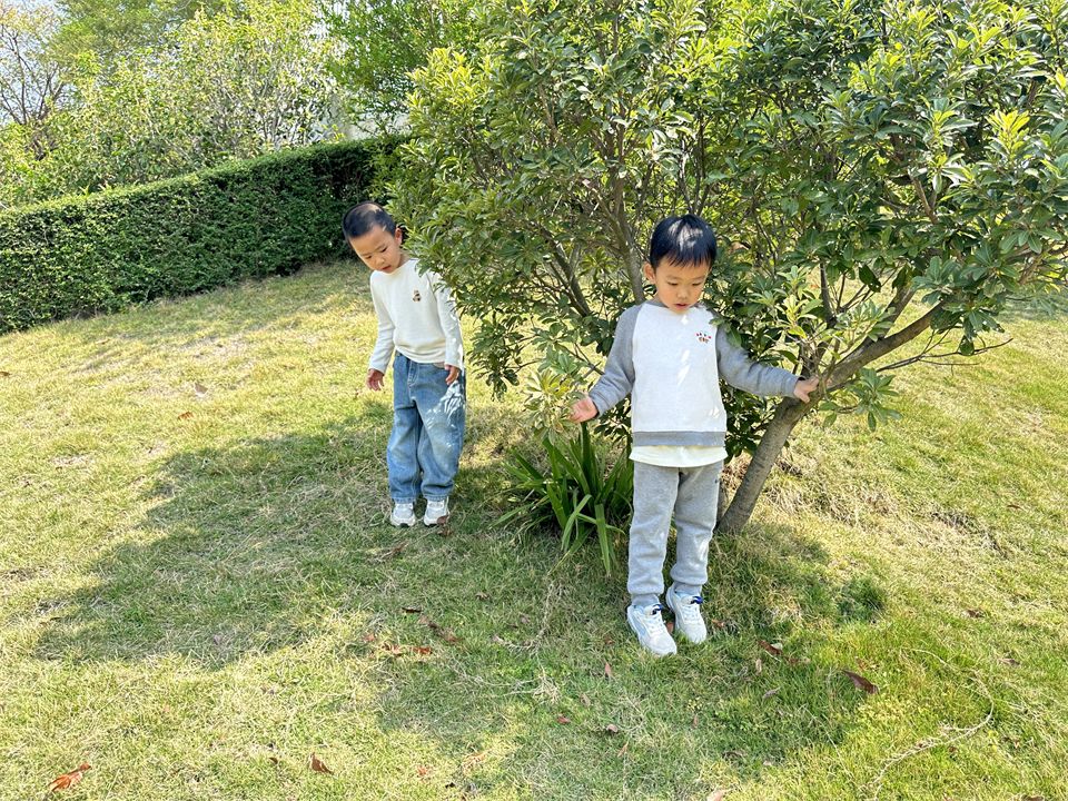 那影子在哪里呢?孩子们立马四处寻找影子,有的蹲在草地上研究各种玩具器械的影子,有的去观察周围大树、木屋的影子。