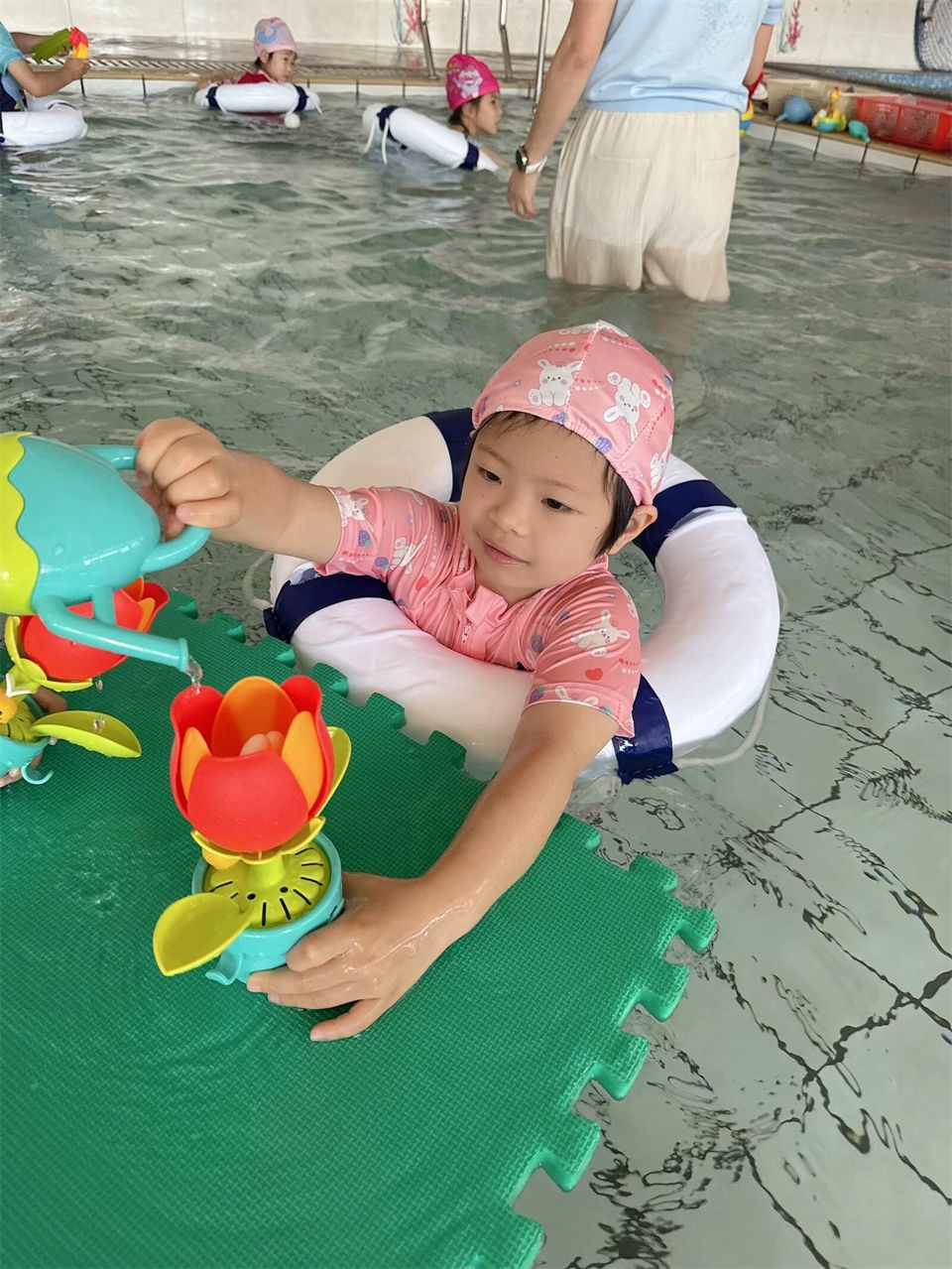围着摆满水枪、漏网、漏水玩具的场地,孩子们眼睛里闪烁着期待的光芒。水花在阳光下迸溅,一旁的和果果用漏网轻轻搅动水面。“海洋球像一条条小鱼,我抓到好多小鱼呀?”阳阳受启发,用“小花朵”在水面上画出弯弯扭扭的“河流”,还招呼同伴:“这是我们的秘密水道!”悦悦抱着泡沫浮板,像小海豚般漂浮在水面,遇到新朋友就热情分享:“你们看,我在坐小船!”几个孩子还突发奇想,用浮板搭建“水上城堡”,边搭边念叨:“这里是公主的宫殿,闲人免进!”