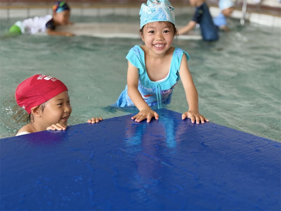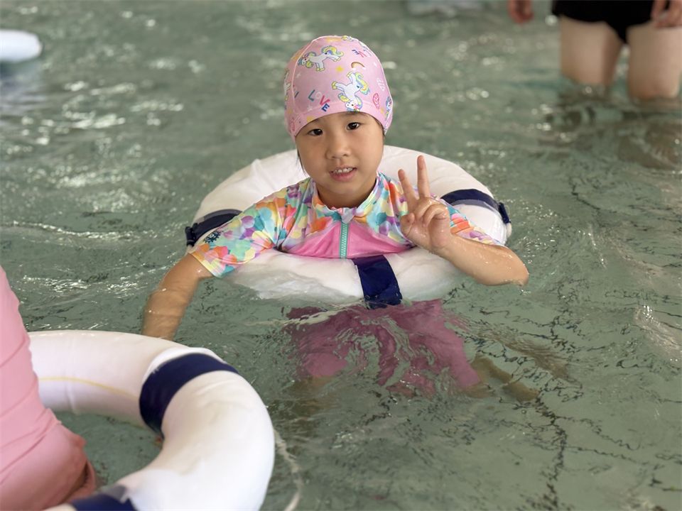 “我们在泳池里玩游戏、滑滑梯、运小球……”微热的天气被清凉的水冲刷出了夏意,水珠跳进池里、跑到木板上、溜进水枪里,把欢乐带给每一个宝贝。