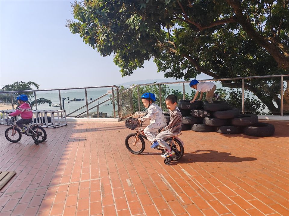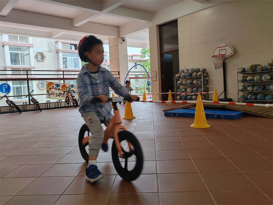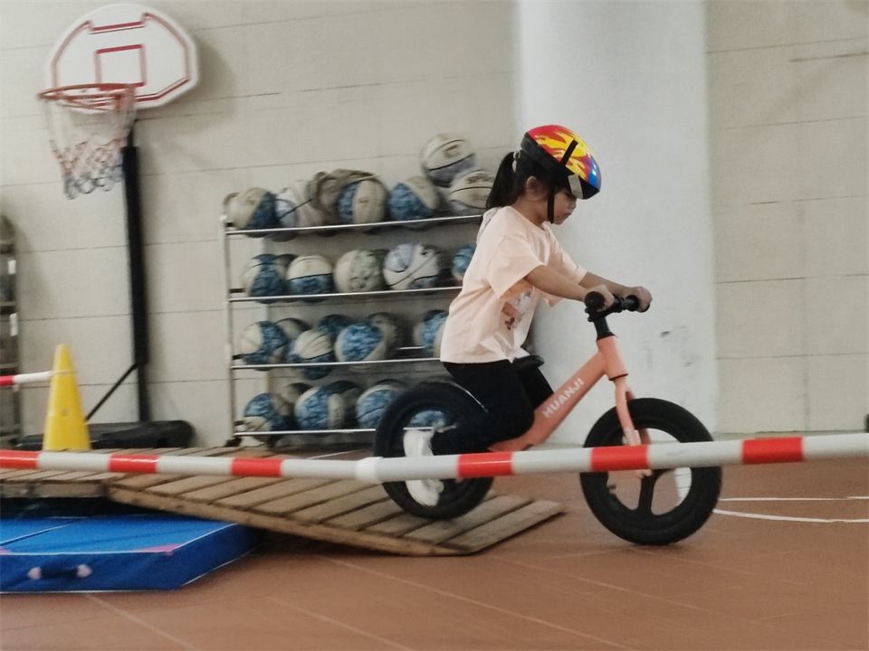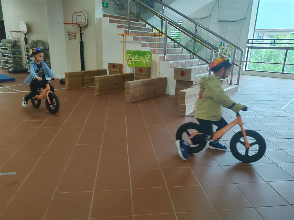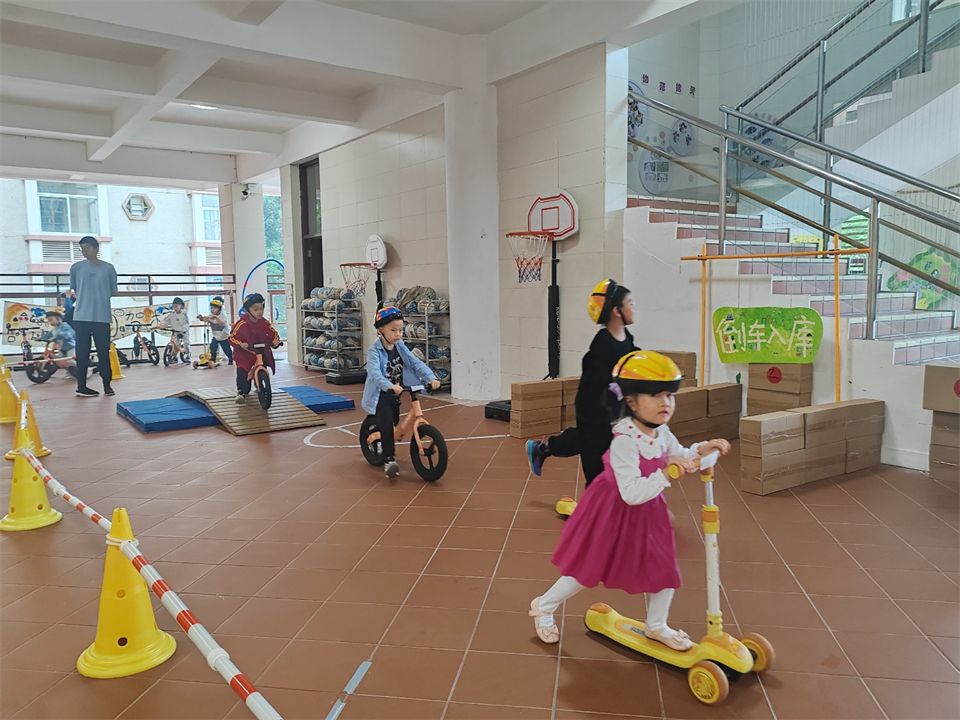 而最让人兴奋的当属户外活动啦!室内的运动场上,摆放着各种运动器械。孩子们戴着头盔,骑着小自行车、滑着滑板车,在黄色的锥形标志和红白相间的栏杆间穿梭,进行着有趣的骑行游戏。他们小小的身体里仿佛藏着无尽的能量,灵活地操控着车辆,时不时还会和小伙伴们比比赛,加油声、欢笑声此起彼伏。