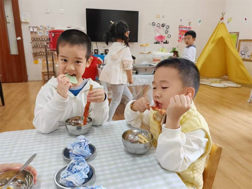 美味自助餐时间到了,孩子们围坐在整洁的餐桌旁。碗里装着美味的食物,有金黄的玉米、香喷喷的肉串,还有其他可口的菜肴。大家吃得津津有味,有的嘴巴鼓鼓的,像只可爱的小仓鼠,让人忍俊不禁。用餐不仅满足了他们的小肚肚,更在潜移默化中培养着他们良好的饮食习惯和分享精神。