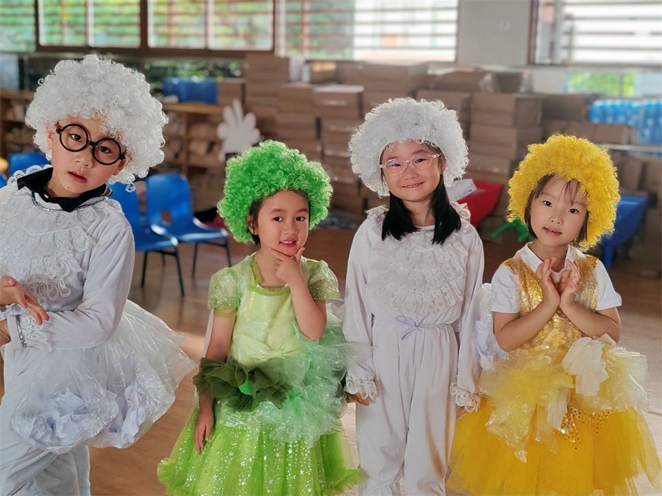 清晨,阳光透过窗户洒进教室,孩子们穿着色彩斑斓的衣服,像一群活泼的小鸟,叽叽喳喳地开始了新一天的生活。瞧,瀚瀚、陟誉、欣玥和米果正穿着精心制作的环保服装,像是参加一场特别的时尚秀。白色的塑料袋被巧妙地做成了蓬松的裙摆,彩色的皱纹纸变成了绚丽的装饰,他们戴着夸张的假发,脸上洋溢着自信的笑容,仿佛在向世界展示他们小小的创意和大大的快乐。