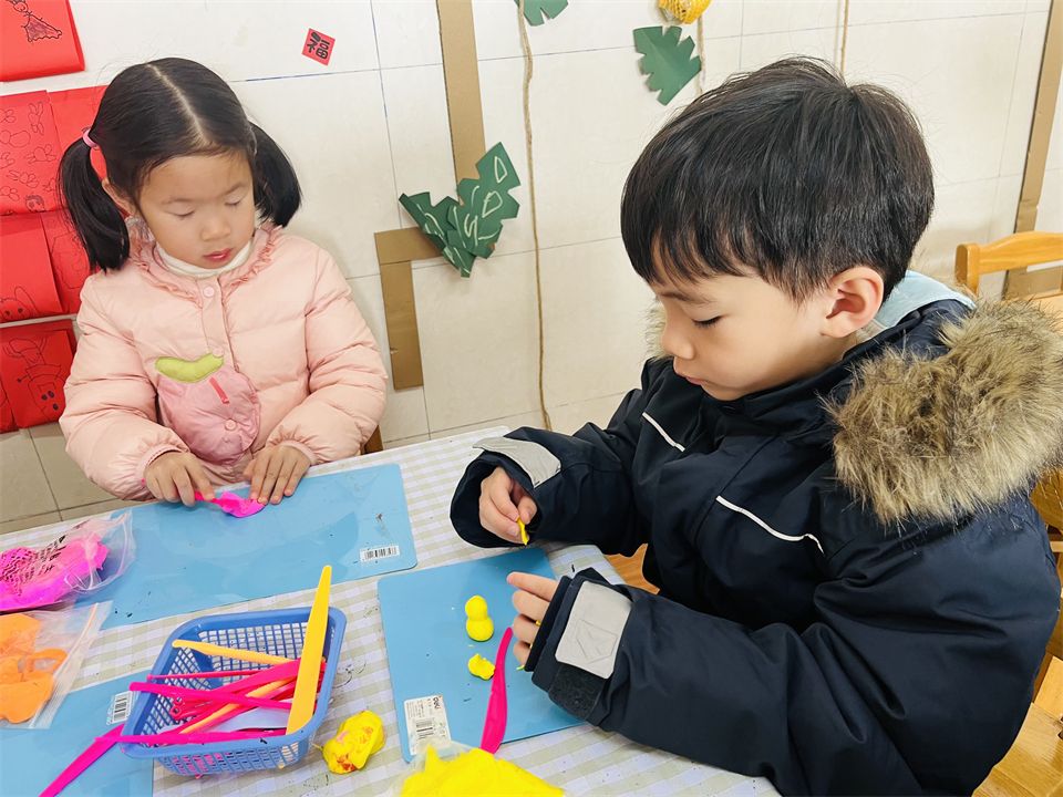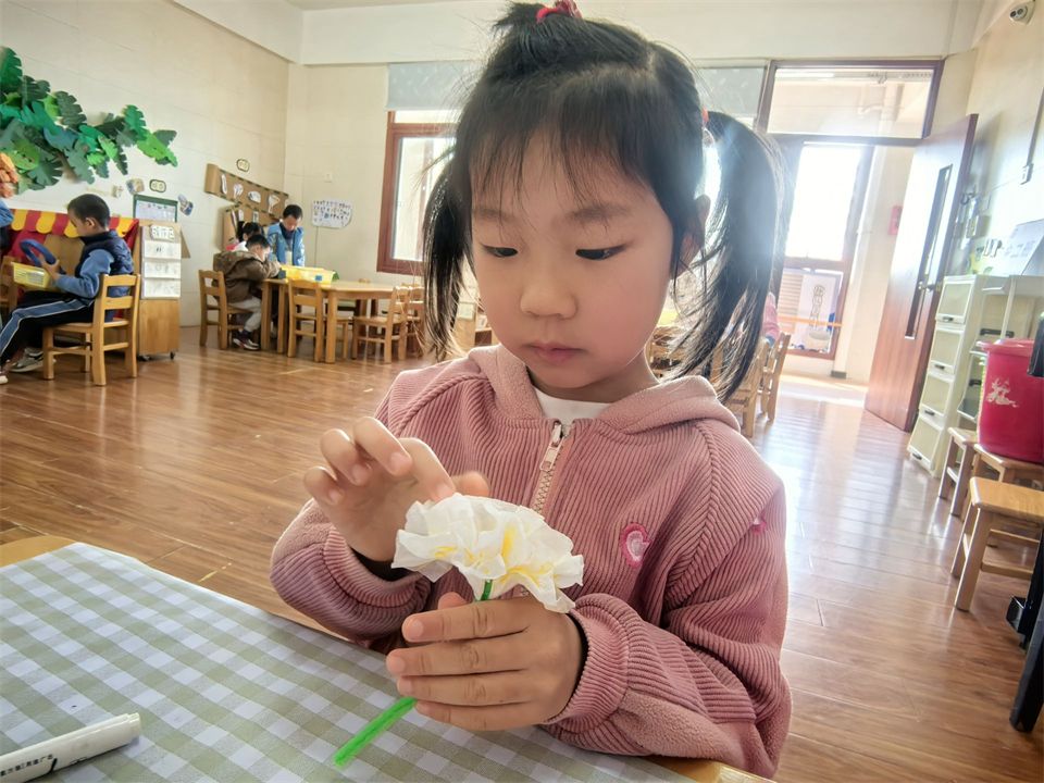 美工区则是一片创意的海洋。黏土、彩纸、剪刀……孩子们用这些工具制作出一幅幅色彩斑斓的作品。卓成正在用黏土做小鸡;小忻和语淇将春天的美景画下来;小罗用纸巾最美丽的花朵;思齐用手掌描线,画一只可爱的小鸟。通过这样的活动,孩子们不仅提升了动手能力,还在创作中体验到了成功的喜悦。