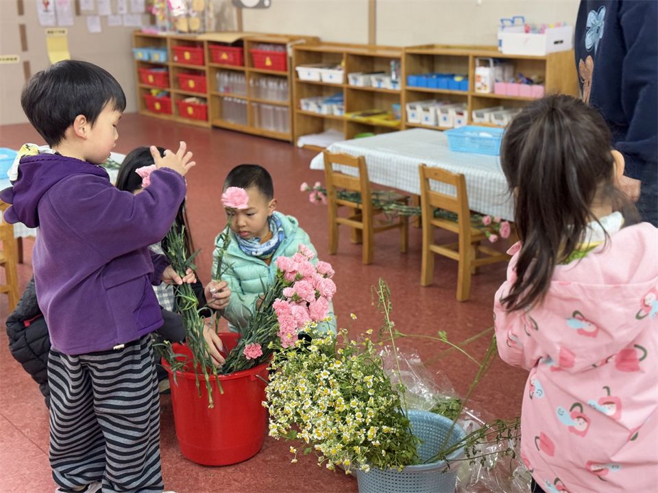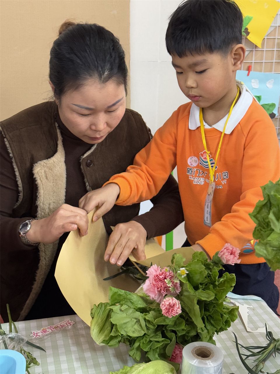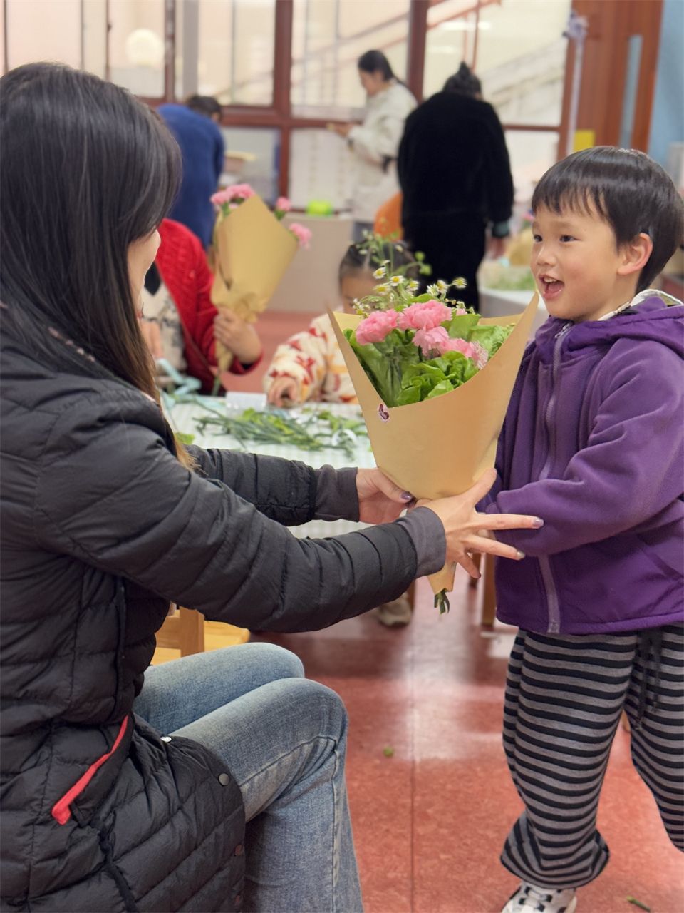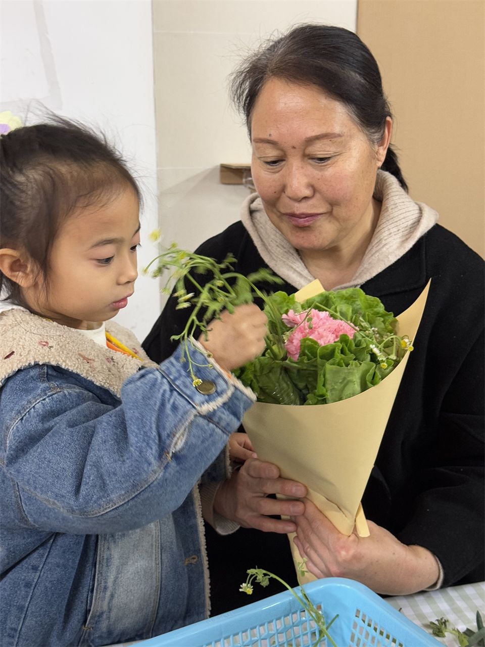 活动当天,妈妈、奶奶和外婆们如约而至,教室里洋溢着欢声笑语。宝贝们围着家长一起生菜、洋甘菊和康乃馨扎成了花束,用彩纸包起来绑上彩带,再贴上节日祝福贴纸,宝贝双手捧花送给最亲爱的家长,说一句节日快乐,永远年轻。