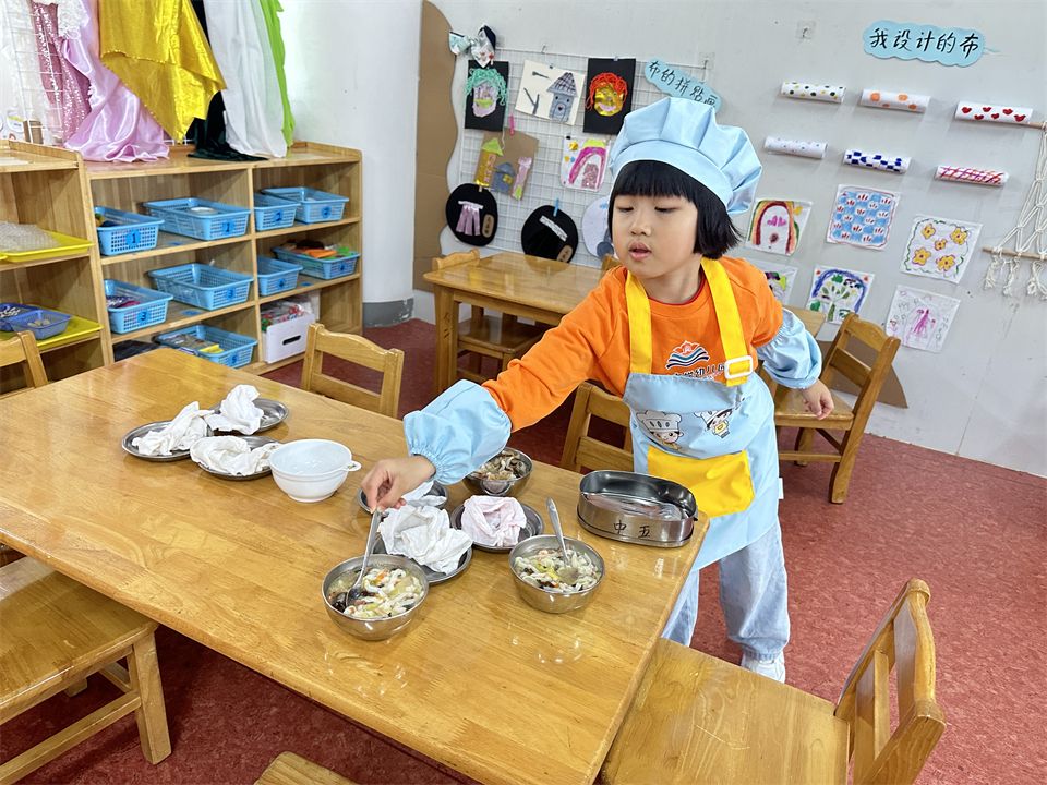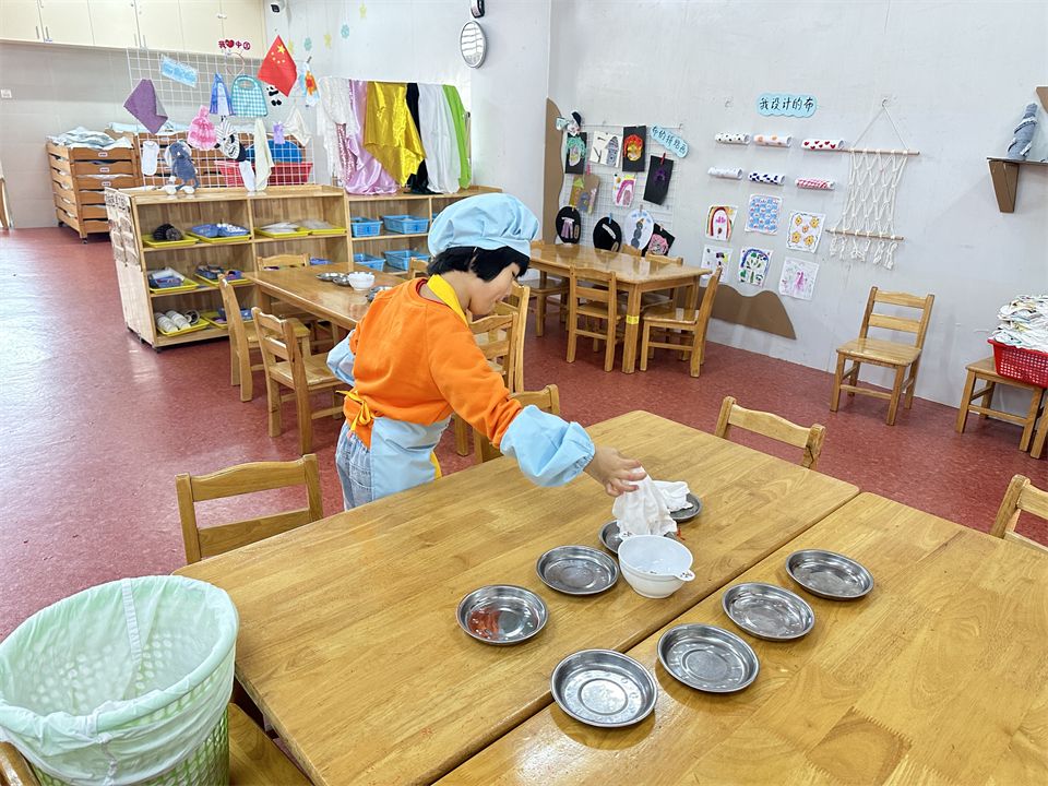 穿上小围裙,带上帽子和袖套,帮助老师分勺子,分毛巾,帮忙看洗手……每个小朋友工作都有模有样的。