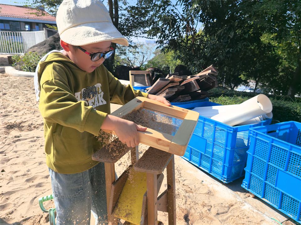 小手挥舞着铲子,把沙子堆积成山,用筛子筛沙,把细沙倒入塑料桶里,一点点填充成桥的基座,很快属于他们的“演武大桥”就大功告成。