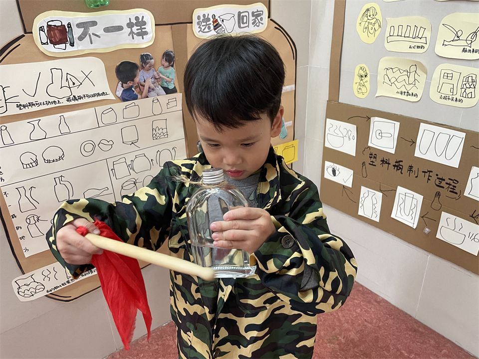 萌娃们还想到用班级里收集来的瓶瓶罐罐制作成乐器呢!听,瓶罐音乐会正演奏着欢快的音乐,“唱响”着环保的主旋律。