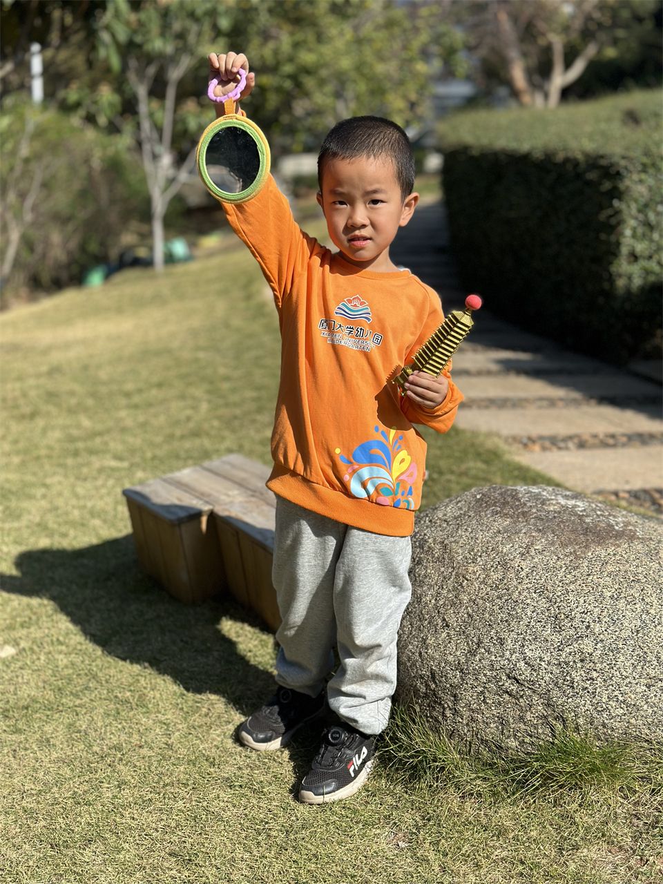 瞧!孩子们创造性地使用低结构材料,一条纱布、一根棍子、一张报纸都是孩子们表演的材料。