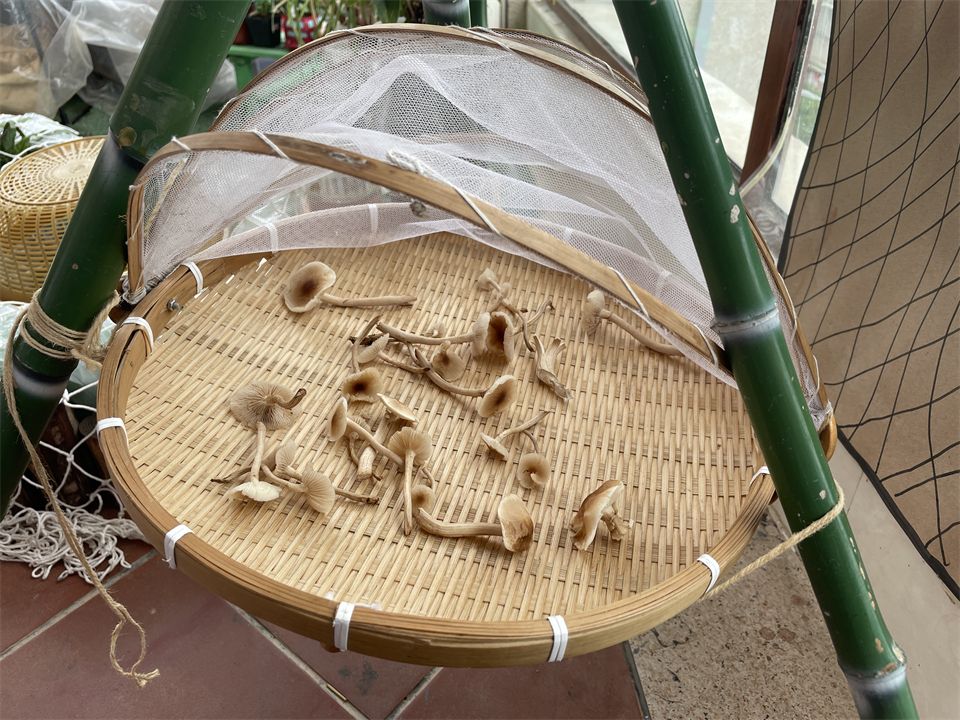 陶然说:老师,这本书有教我们怎么晒茶树菇,我们家的茶树菇就是干的,放很久都不会坏。我们也来晒吧?上学期我们在阳台晒过橘子干、陈皮,柿子干,孩子们都很有经验。老师说:我们一起来看看,晒茶树菇干需要什么条件吧?糖、水、盘子、新鲜茶树菇,看着书的步骤,一切准备就绪,用上夹子显示我们的专业程度。开始晒茶树菇了。把泡好的茶树菇放进箩筐,盖上纱罩,等待太阳公公的光临。耶!我们成功了!