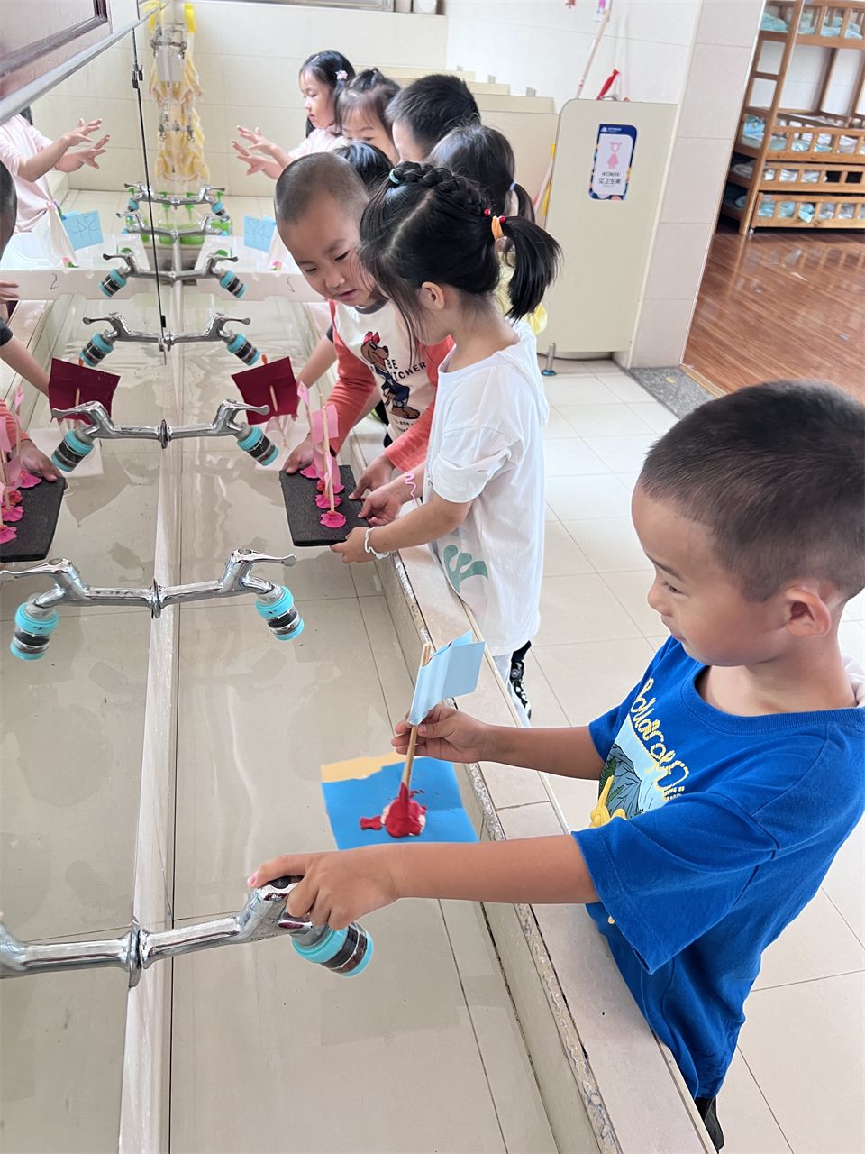 开始试航啦!孩子们把自制的纸船、泡沫船、塑料船、积木船、盒子船等慢慢地放入水池中,有的小朋友还兴奋地用手泼水,让自己的小船快快向前行驶。弟弟说:“我们来比赛看谁的船开得快吧!”其他小朋友都说“好哇”。于是,一场比赛开始了……只见小朋友们一边小心翼翼地将船放入水中,一边让同伴看自己的船在行驶着,此时孩子们尽情体验着成功的喜悦,彼此交流着心中的感受。