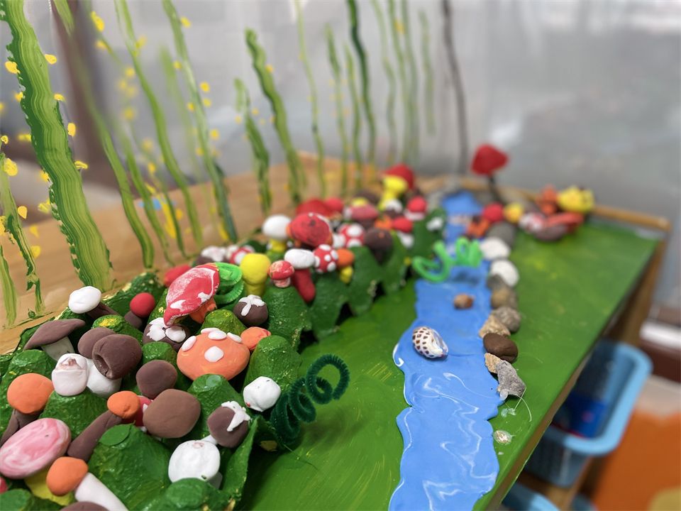 “老师,我们班能不能有一个蘑菇的秘密基地?”幼儿问。“什么是蘑菇基地?”“我姐姐去参观种菌菇的基地,她说很漂亮,有各种各样的菌菇。所以我想班级也有一个菌菇秘密基地。”真是一个好主意!在老师巧手布置下,绿芽新长的树枝将春天的美景带进了美工区。泥工活动中,幼儿根据自己见过的各种菌菇的外形、颜色,选择喜欢的超轻黏土,团圆、分泥、搓长、压坑,经过组合装饰,一朵朵菌菇绽放开来。如茵的绿草地随着菌菇的“生长”而变得栩栩如生。我们的“菌菇基地”诞生了!