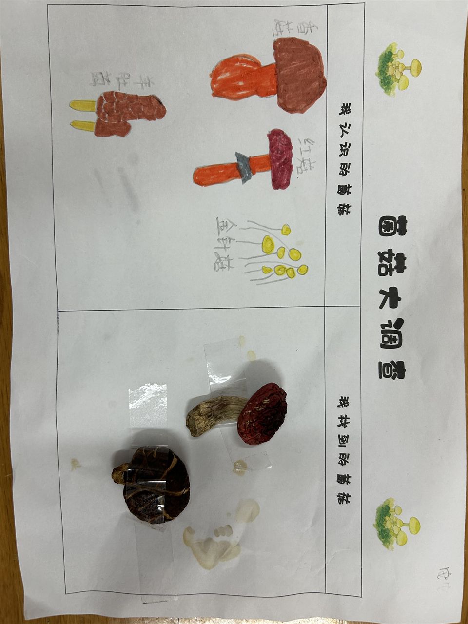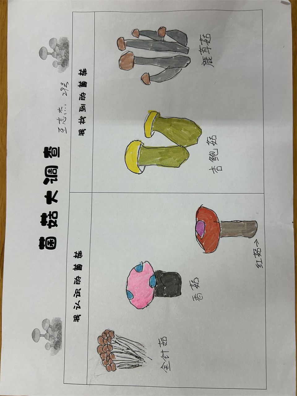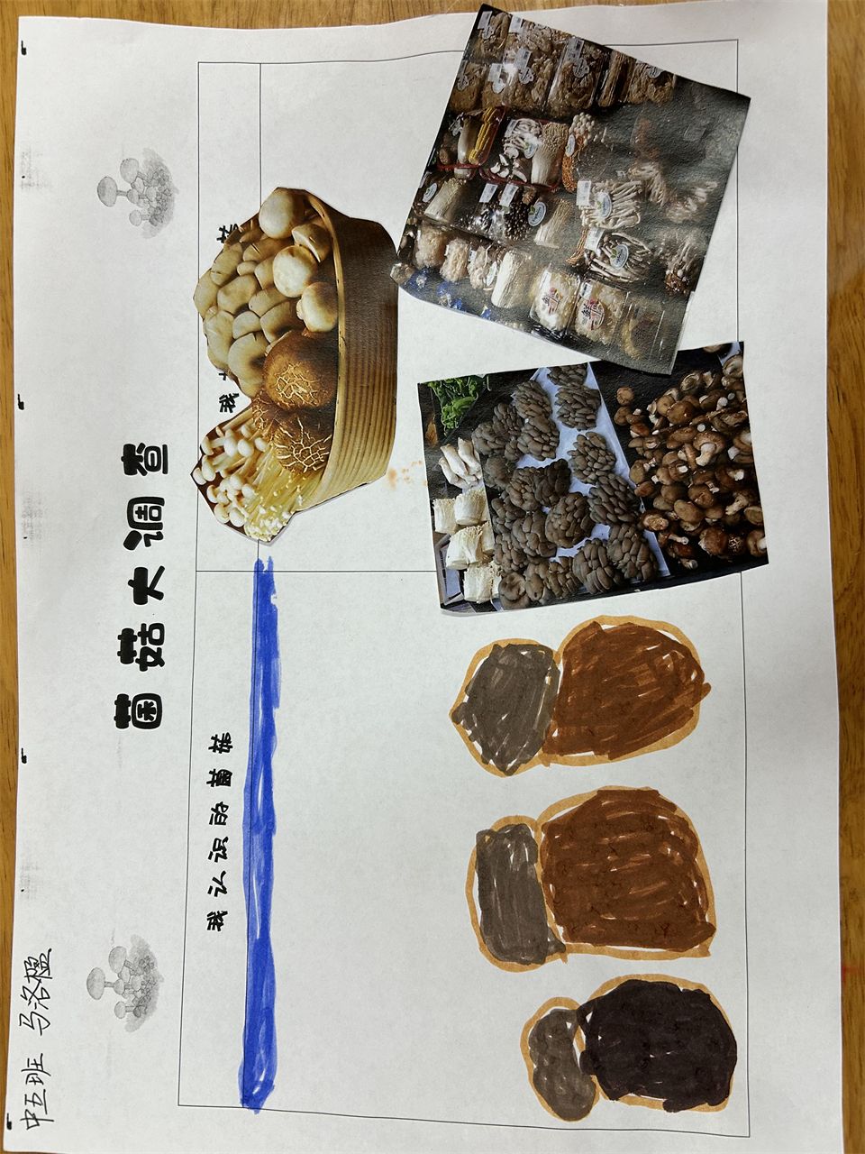 寻找菌菇,从调查表开始。周末,孩子们和爸爸妈妈搜索冰箱、到超市、菜市场寻找各种各样的菌菇并做下了记录。哇!原来菇类是一个大家族,有我们比较熟悉的香菇、松菇、草菇、平菇,还有羊肚菌、红菇、鸡枞菌等名贵的菇类。它们虽然外形特征不太一样,但都具有祛病保健、补充营养等功效。