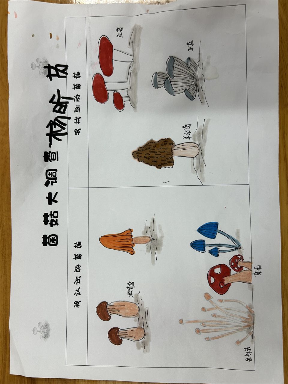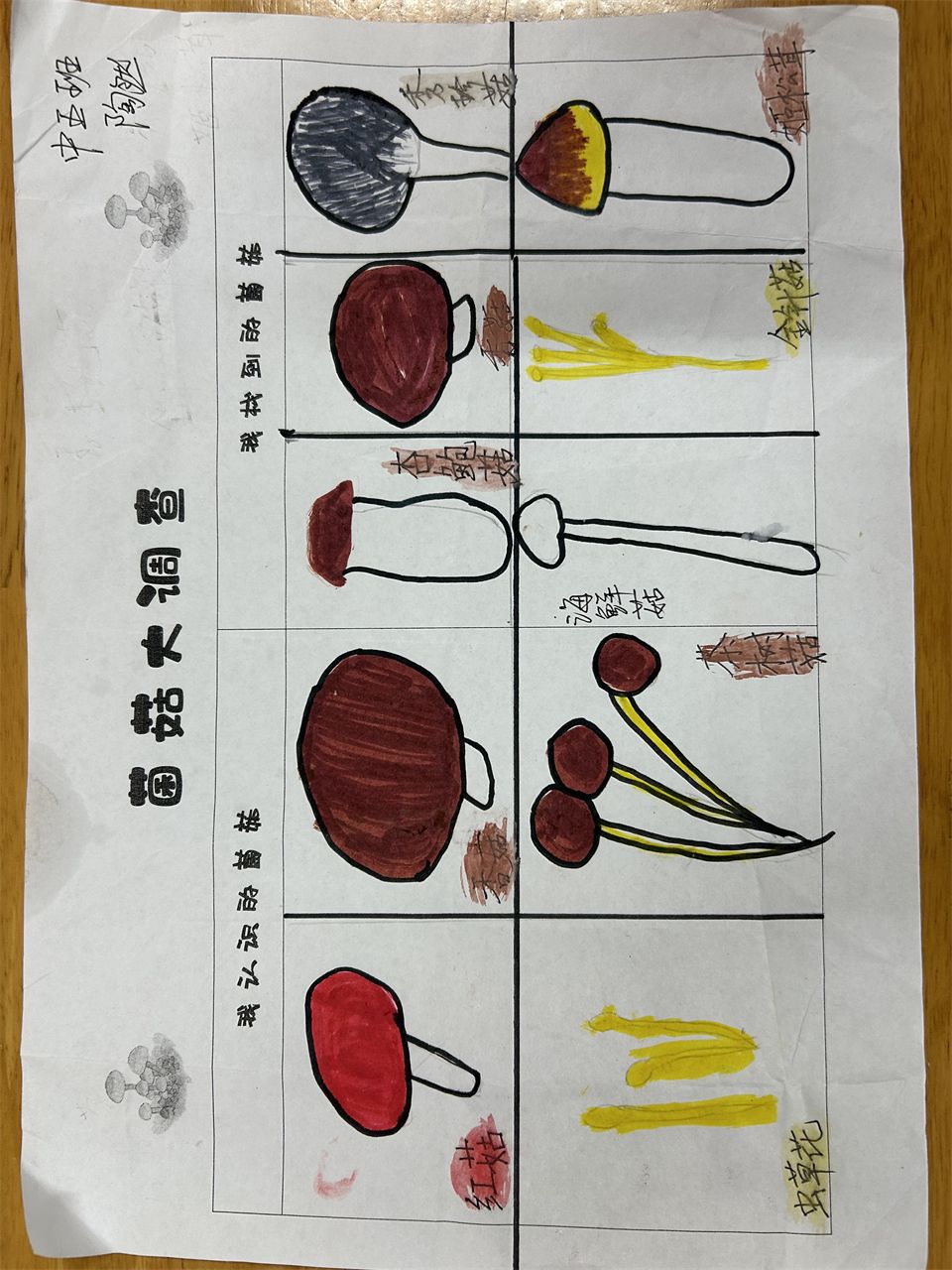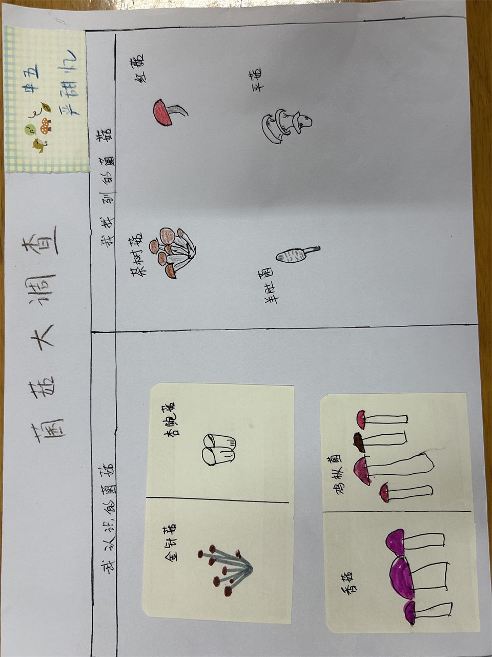寻找菌菇,从调查表开始。周末,孩子们和爸爸妈妈搜索冰箱、到超市、菜市场寻找各种各样的菌菇并做下了记录。哇!原来菇类是一个大家族,有我们比较熟悉的香菇、松菇、草菇、平菇,还有羊肚菌、红菇、鸡枞菌等名贵的菇类。它们虽然外形特征不太一样,但都具有祛病保健、补充营养等功效。