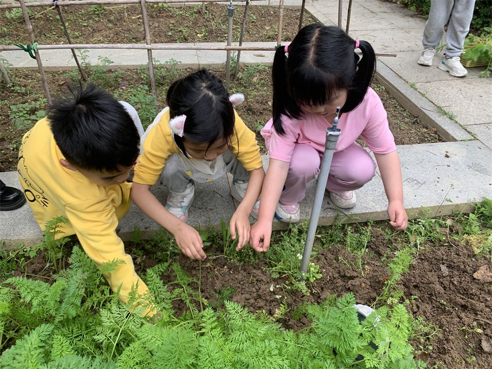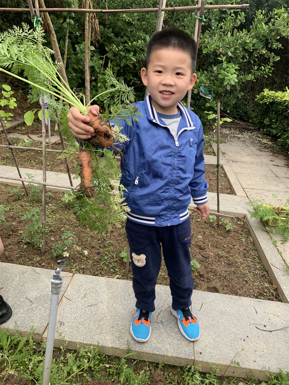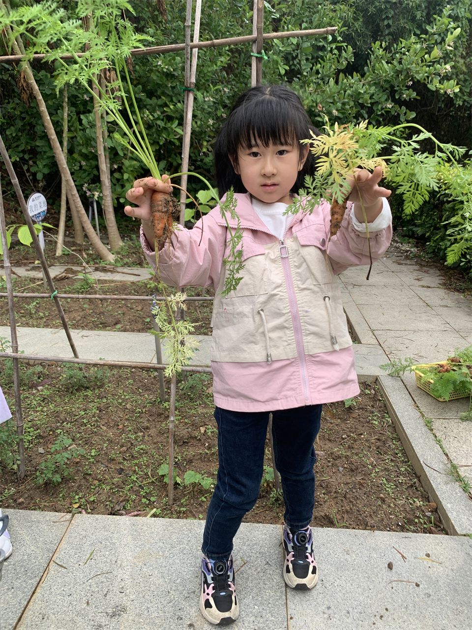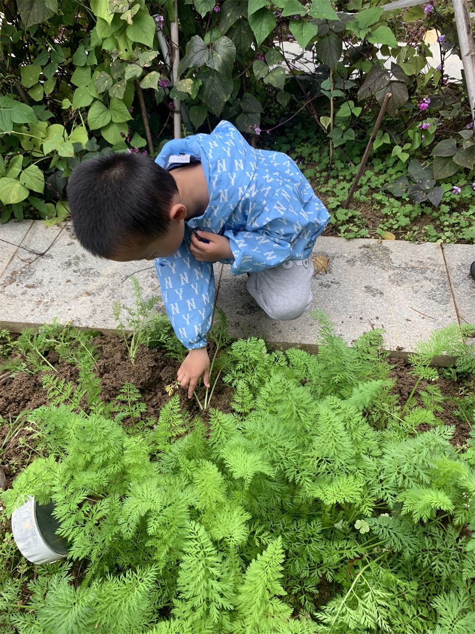 上学期期末,孩子们种下的胡萝卜终于要成熟。孩子们迫不及待地来到了开心农场,看到了绿油油的胡萝卜,个个跃跃欲试。在老师的指导下,孩子们蹲下身子,双手紧握胡萝卜的叶子,轻轻一拔,一颗颗新鲜的胡萝卜就出现在了他们面前。孩子们兴奋地挥舞着自己的成果,脸上洋溢着满满的成就感。孩子们将大胡萝卜带回家制成一道道美味的菜肴,品尝着收获的喜悦。