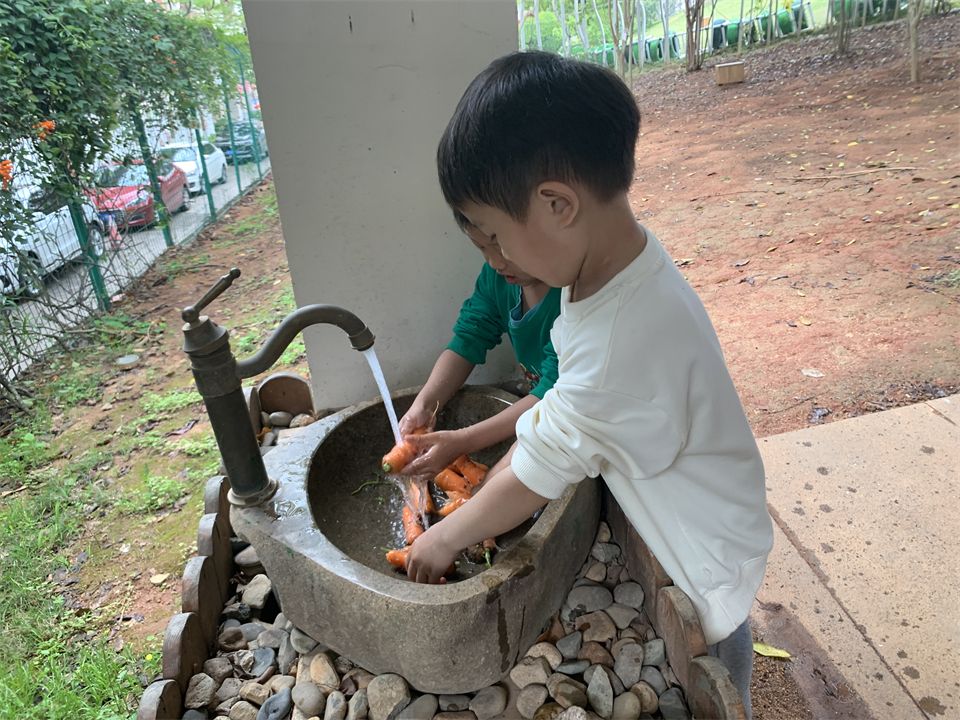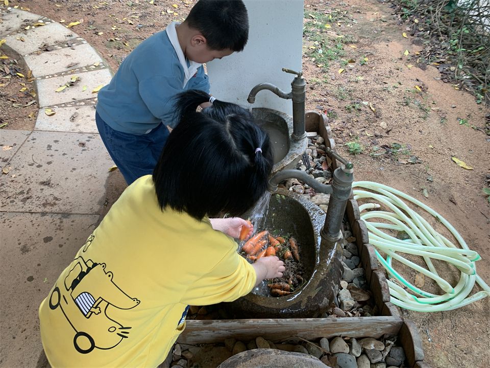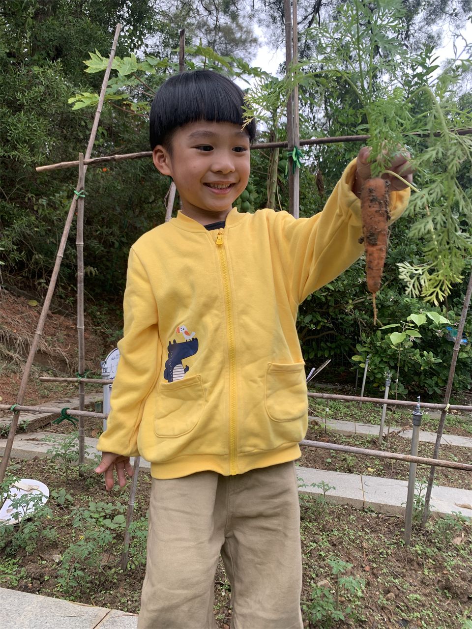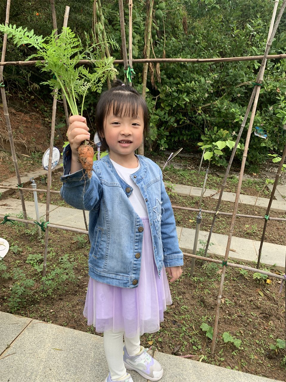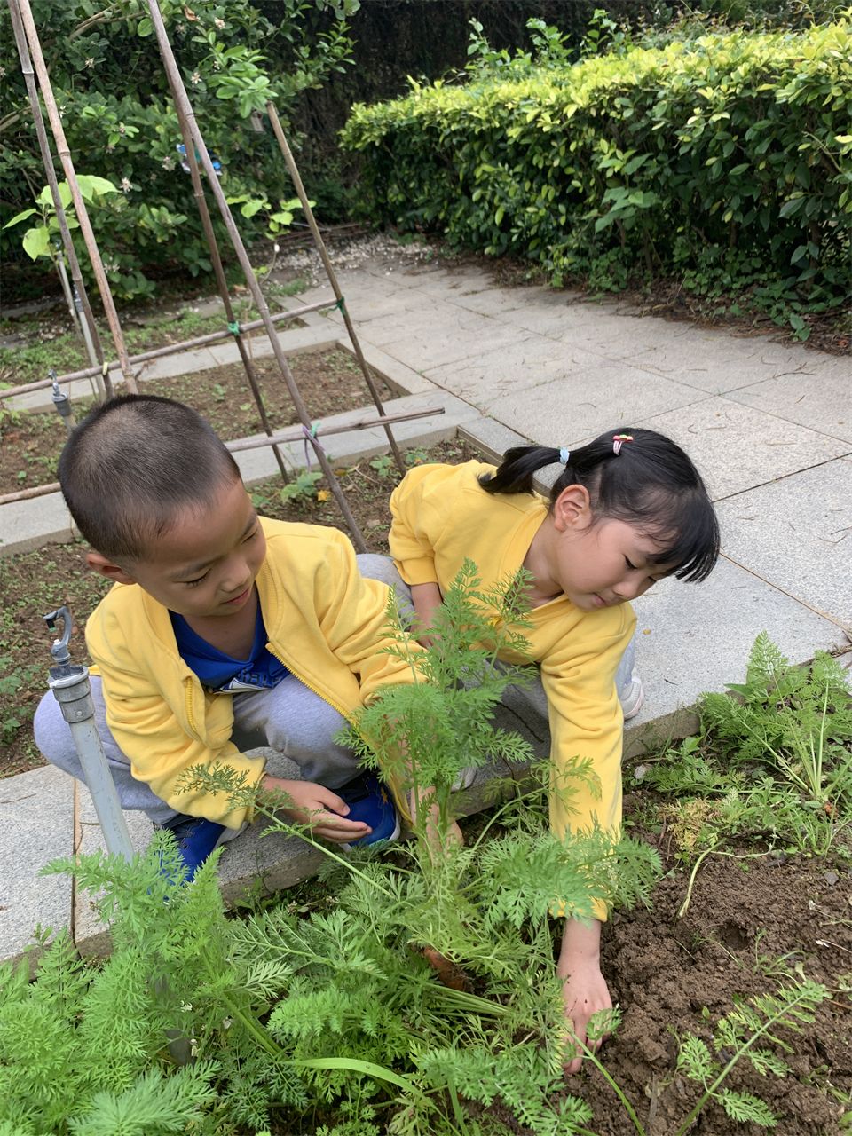 上学期期末,孩子们种下的胡萝卜终于要成熟。孩子们迫不及待地来到了开心农场,看到了绿油油的胡萝卜,个个跃跃欲试。在老师的指导下,孩子们蹲下身子,双手紧握胡萝卜的叶子,轻轻一拔,一颗颗新鲜的胡萝卜就出现在了他们面前。孩子们兴奋地挥舞着自己的成果,脸上洋溢着满满的成就感。孩子们将大胡萝卜带回家制成一道道美味的菜肴,品尝着收获的喜悦。