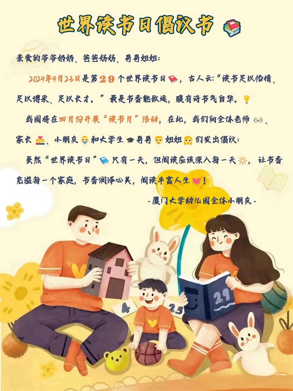 2024年4月23日是第29个世界读书日,在温暖的人间四月天,我园拉开了“读书月”活动的序幕。中五班的小红帽在美丽的厦大校园分发读书月倡议书,倡议校园内的幼儿、家长、大学生哥哥姐姐读好书、享书香。