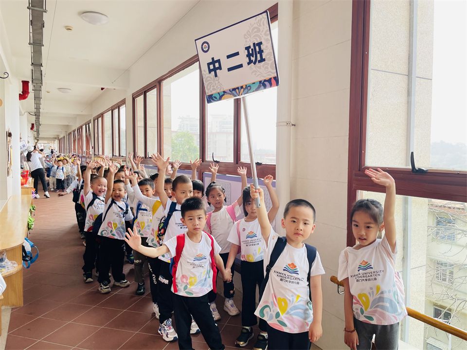 背上小水壶。小手拉大手,我们出发咯!呼吸着清新的空气,沐浴在春日的暖阳里,感受着春天清爽的风。一路上,孩子们说说笑笑,灿烂的笑容洋溢在一张张脸。