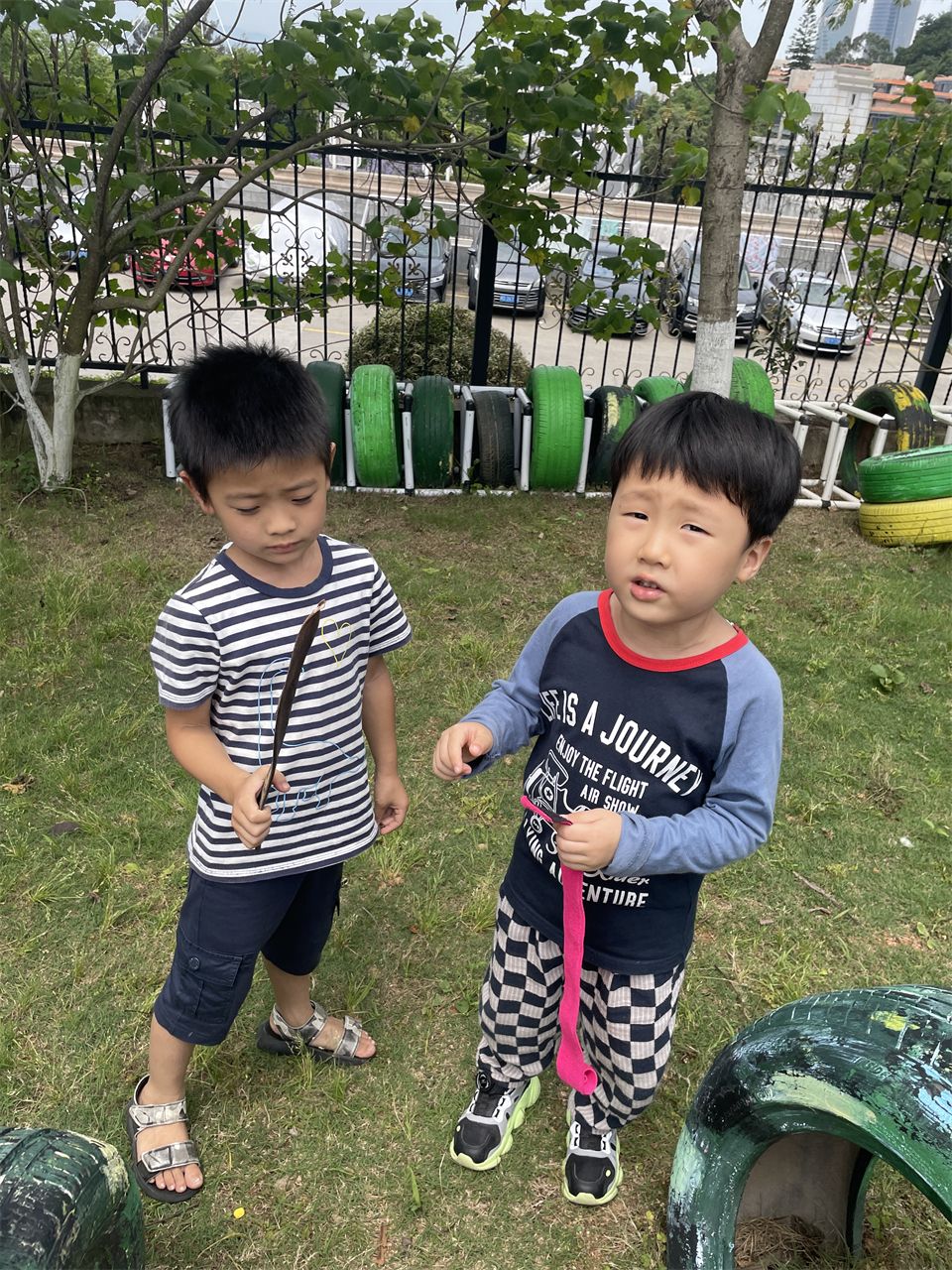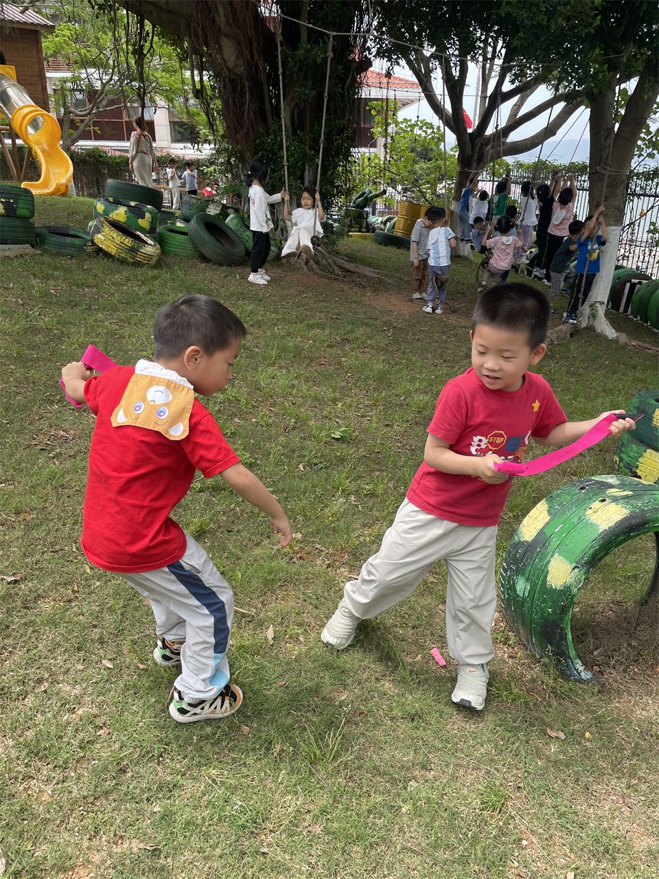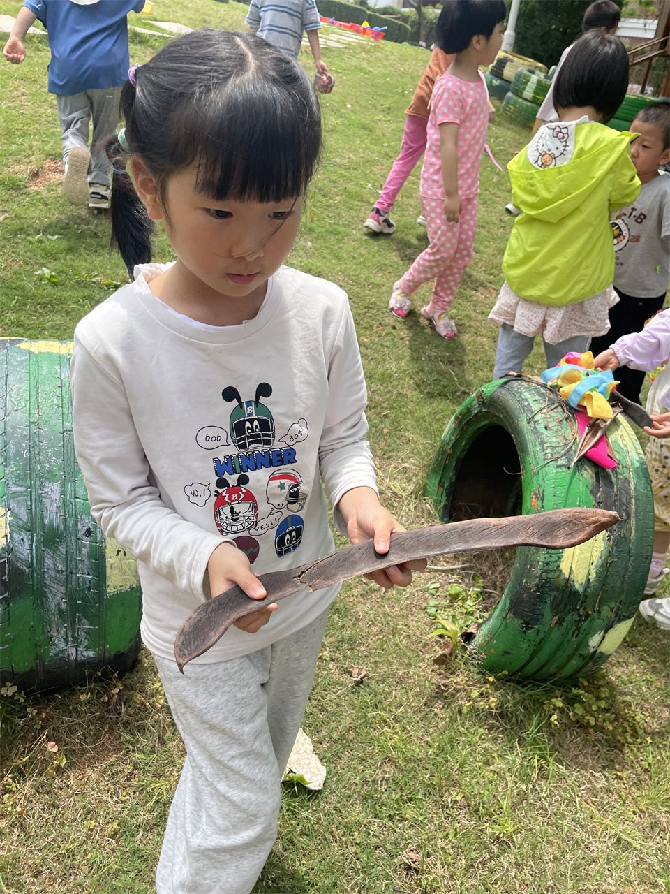 在山坡上,孩子们还进行了一系列户外活动。他们奔跑着、欢笑着,尽情释放着童年的活力。偶然间,孩子们发现草地上散落着一些凤凰树的豆荚。这些豆荚形状奇特,有的孩子说它们像一把刀,纷纷比划着动作,玩得不亦乐乎。这种发现让孩子们对自然世界充满了好奇和探索的欲望,他们纷纷捡起地上的豆荚,仔细观察、讨论,享受着探索的乐趣。
