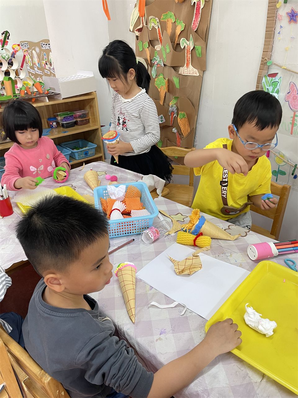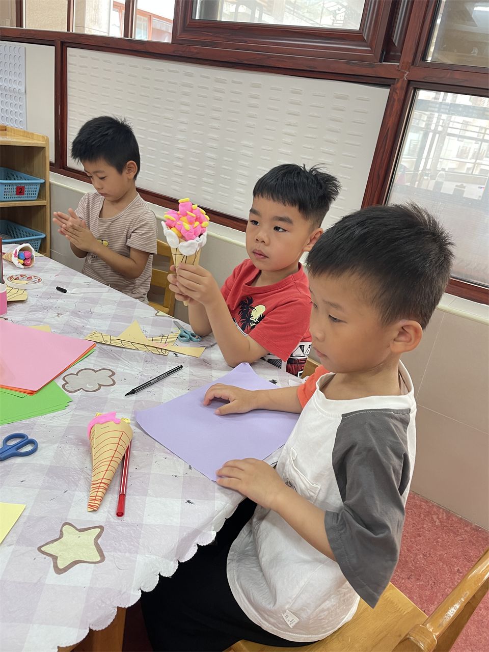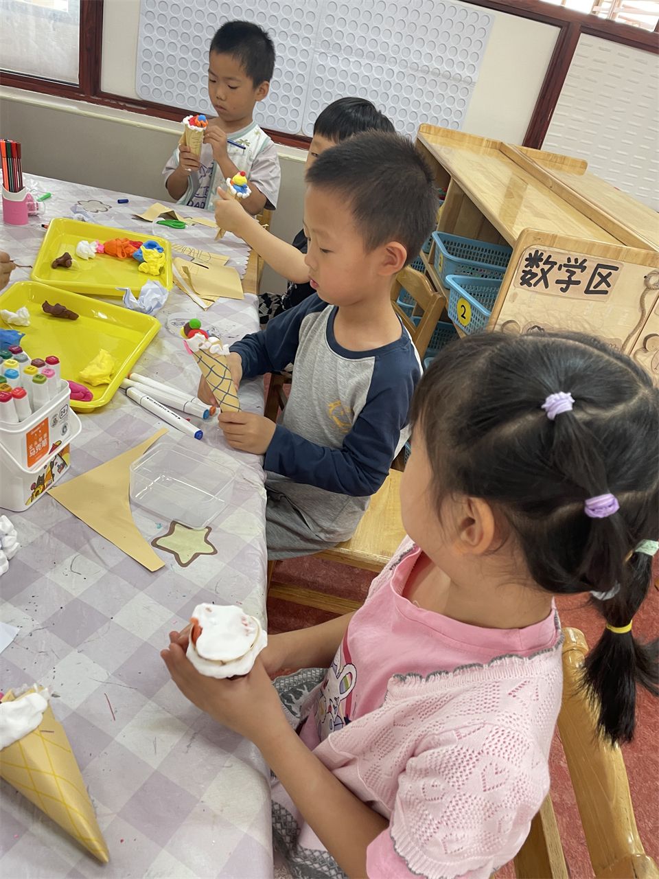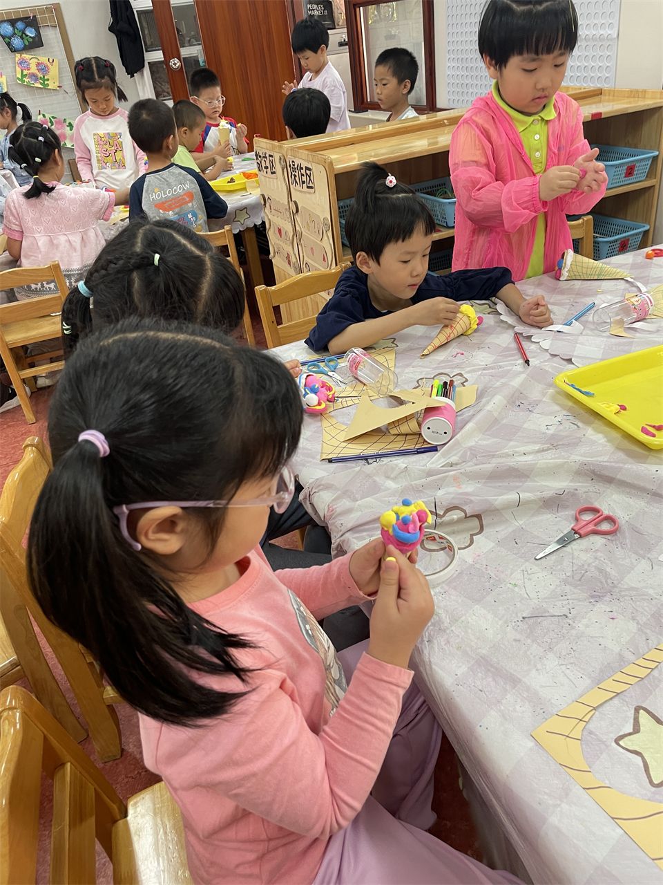 在手工活动中,孩子们运用各种手工材料,如卡纸、水果网套、超轻粘土等,精心制作着属于自己的冰激凌。有的孩子制作了色彩斑斓的水果冰激凌,有的孩子则制作了造型独特的动物冰激凌。在制作过程中,孩子们充分发挥了自己的想象力和创造力,也锻炼了手部精细动作的能力。