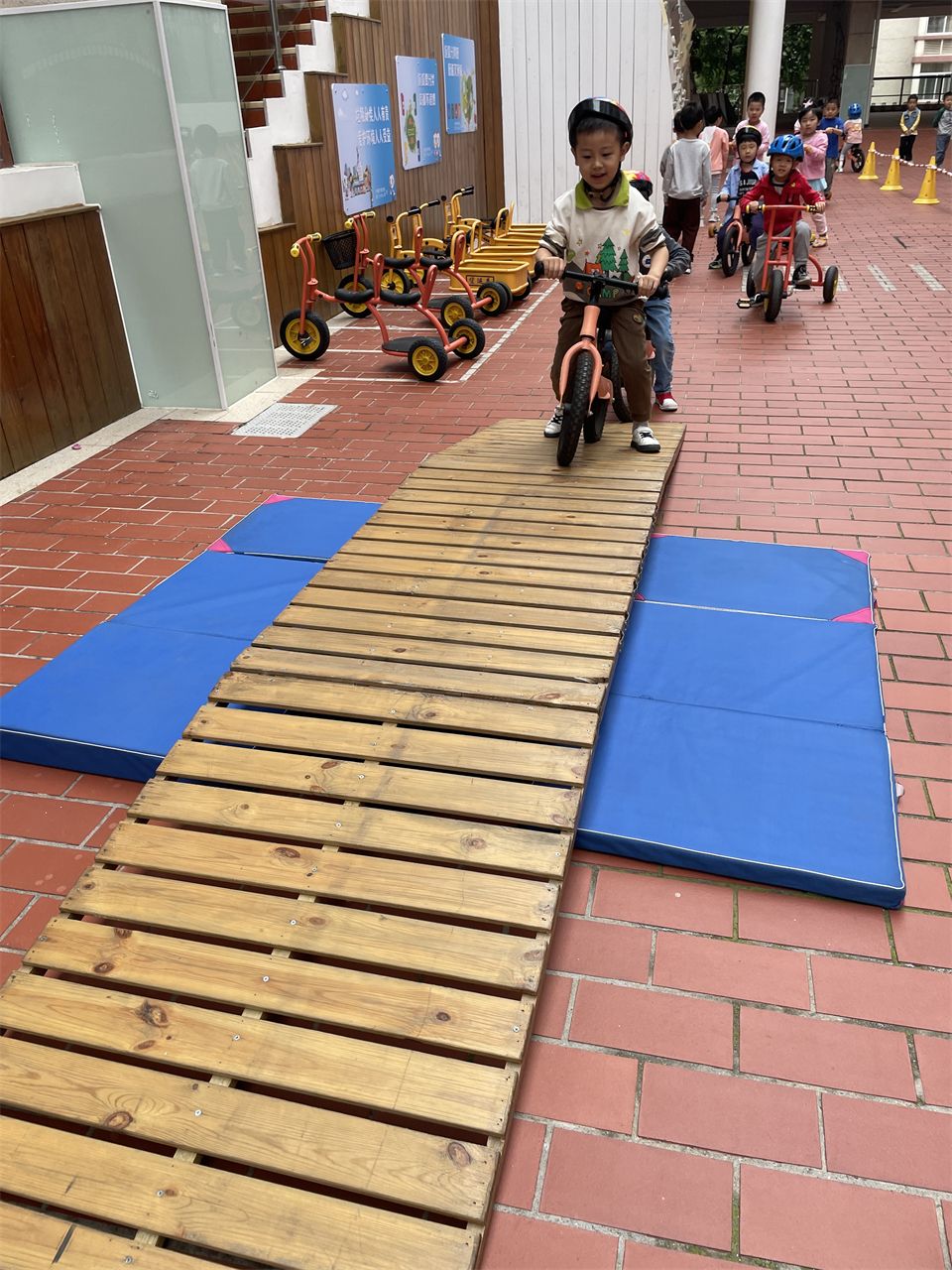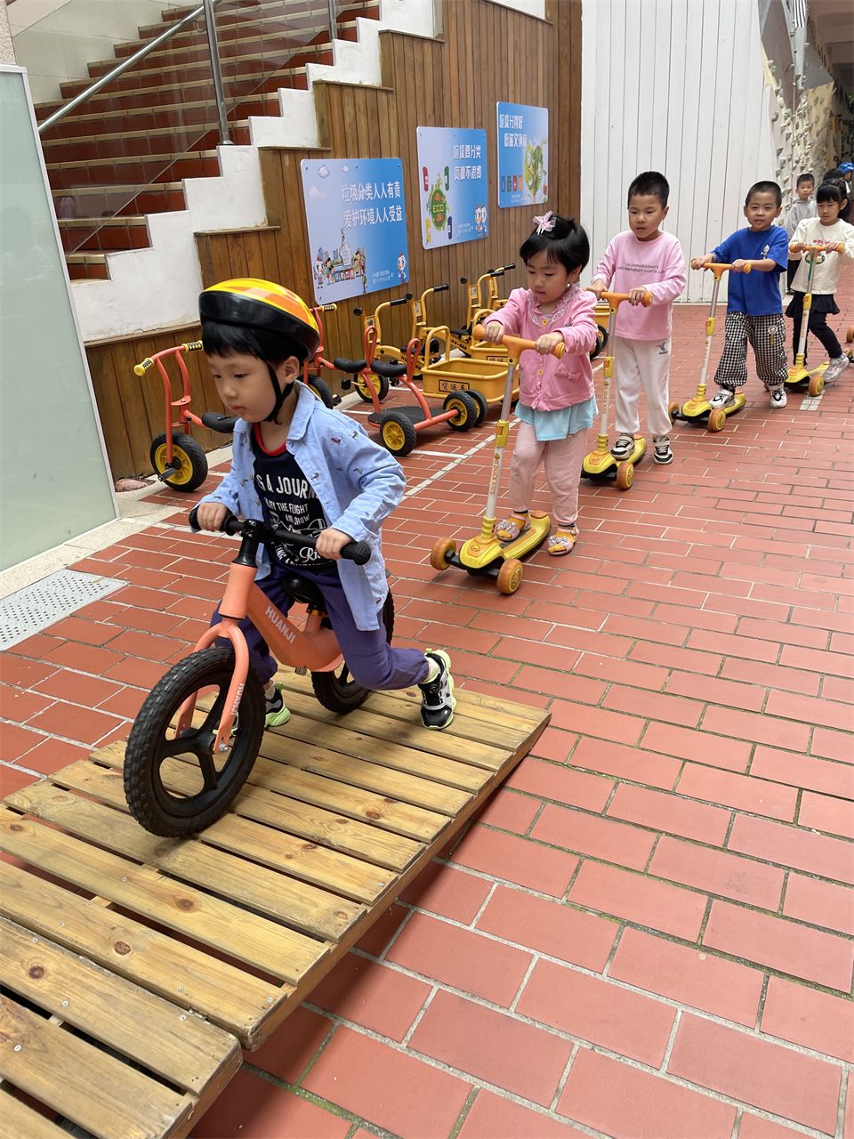 清晨,孩子们骑上三轮车、滑板车,在一楼的活动场地上自由驰骋。孩子们自行设计骑行路线,增加了上下坡等难度设置,挑战自己的骑行技能。他们的笑声和欢呼声此起彼伏,充满了童年的欢乐和纯真。