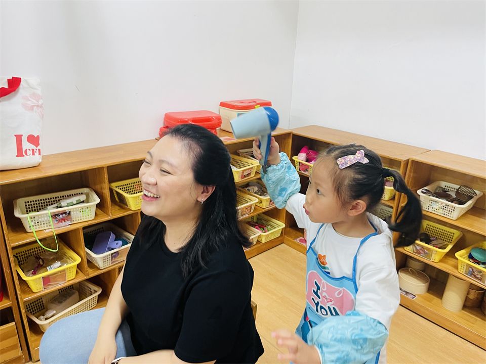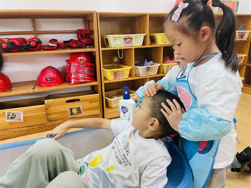“欢迎光临我们的理发店!”理发店里的美发师热情地招待着大家。洗发师忙着给小顾客洗头发,理发师挥舞着手中的小剪刀,争取给客人做出一个满意的发型,还有小朋友想烫头发,正美滋滋的享受呢!理发店还推出了全新的美甲服务,快来一起体验吧~