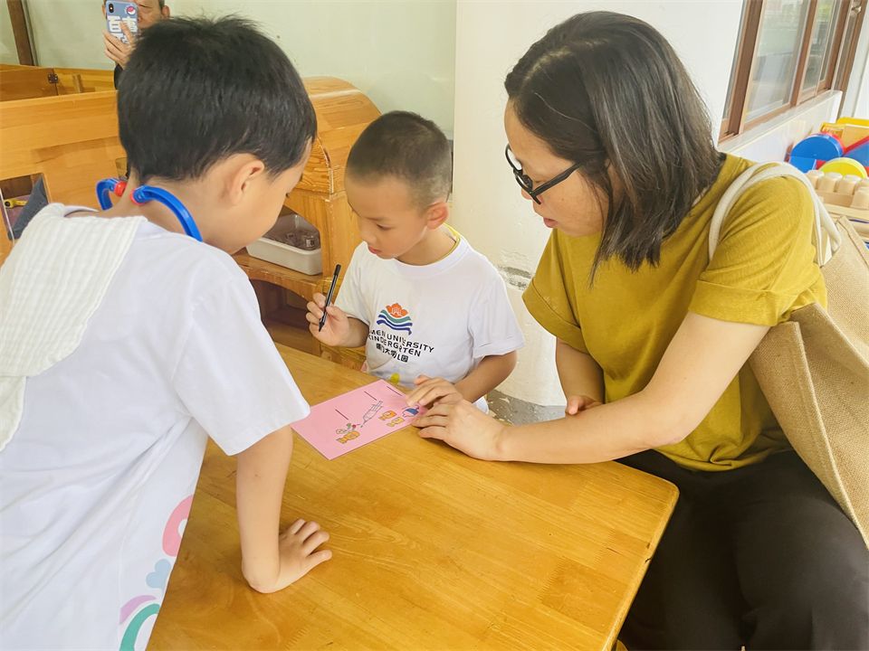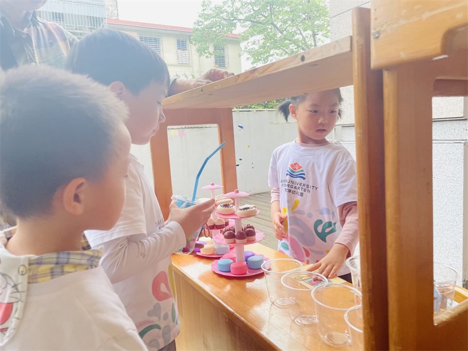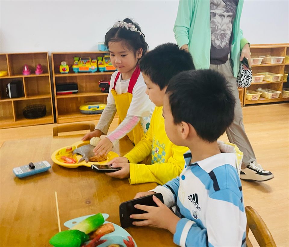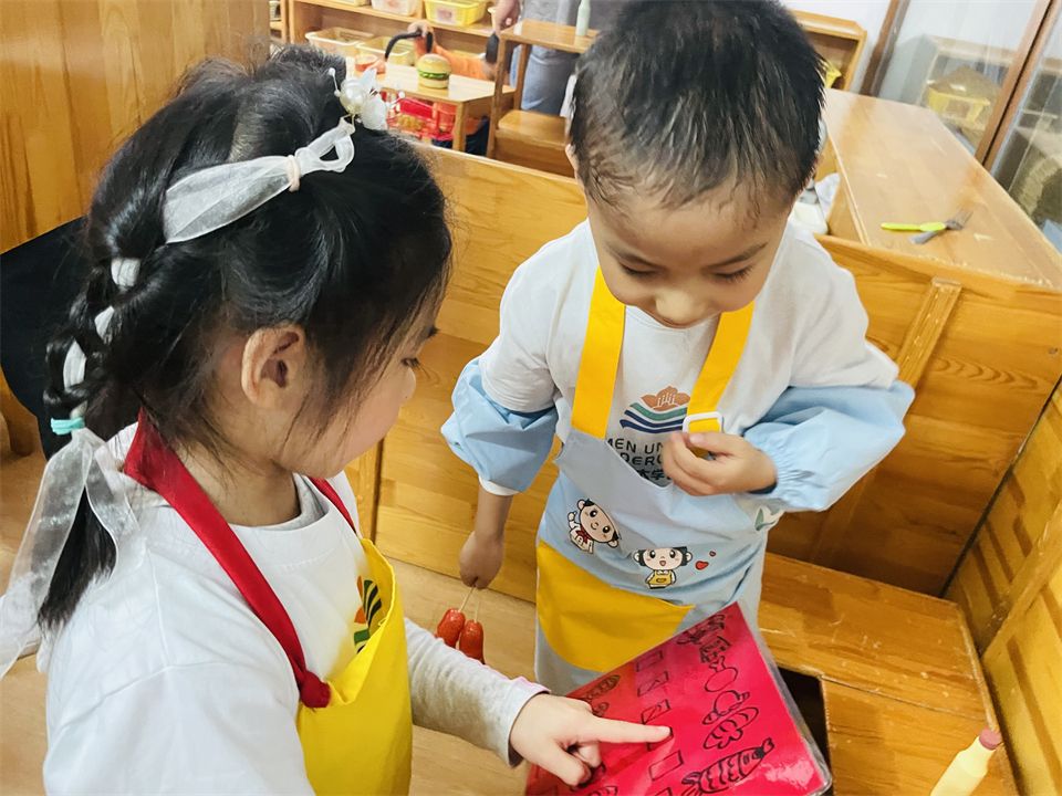“饭店”游戏,他们制作的菜单上有鱼、蛋、虾、汉堡……好吃的美食应有尽有,服务员服务周到,厨师用心烹饪,吸引大家争相排队……