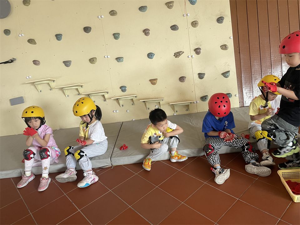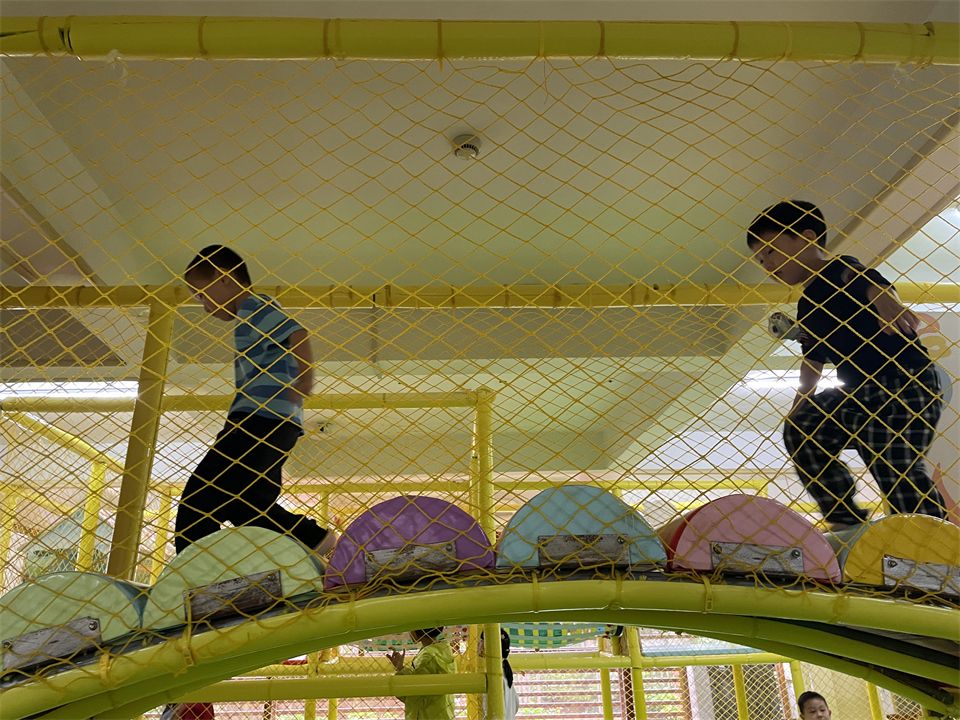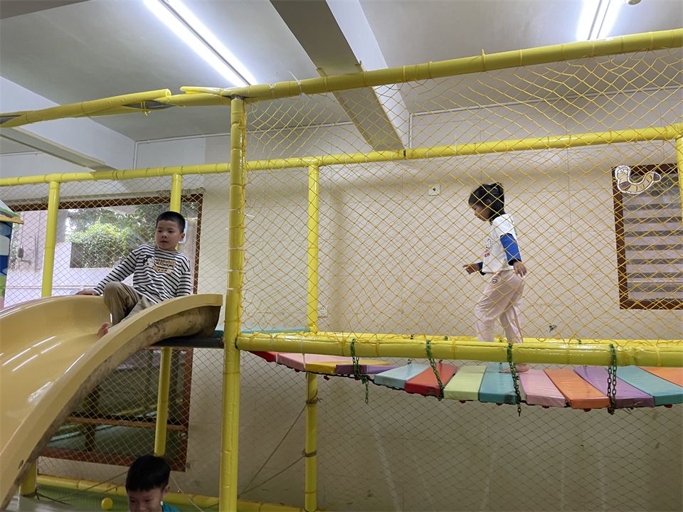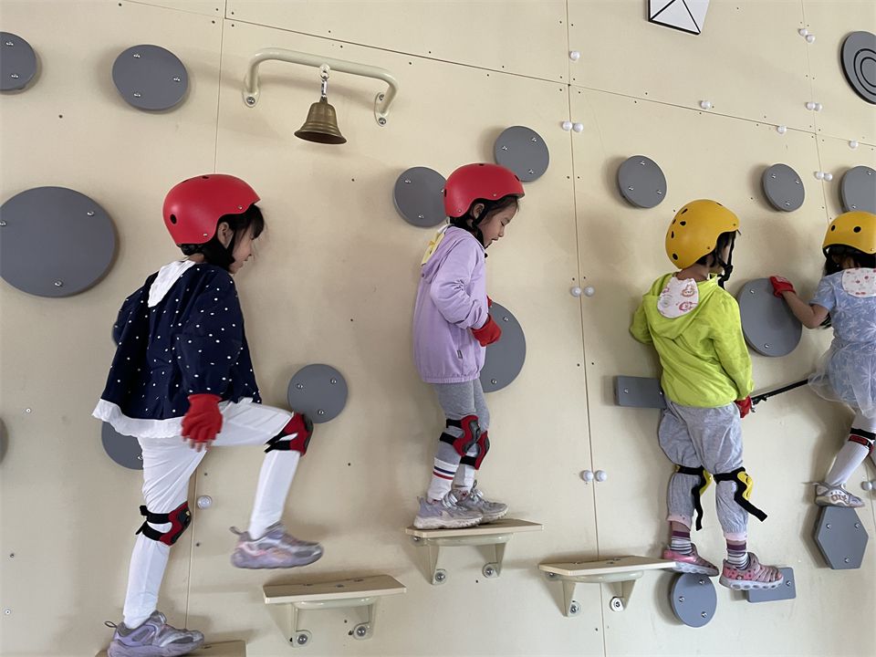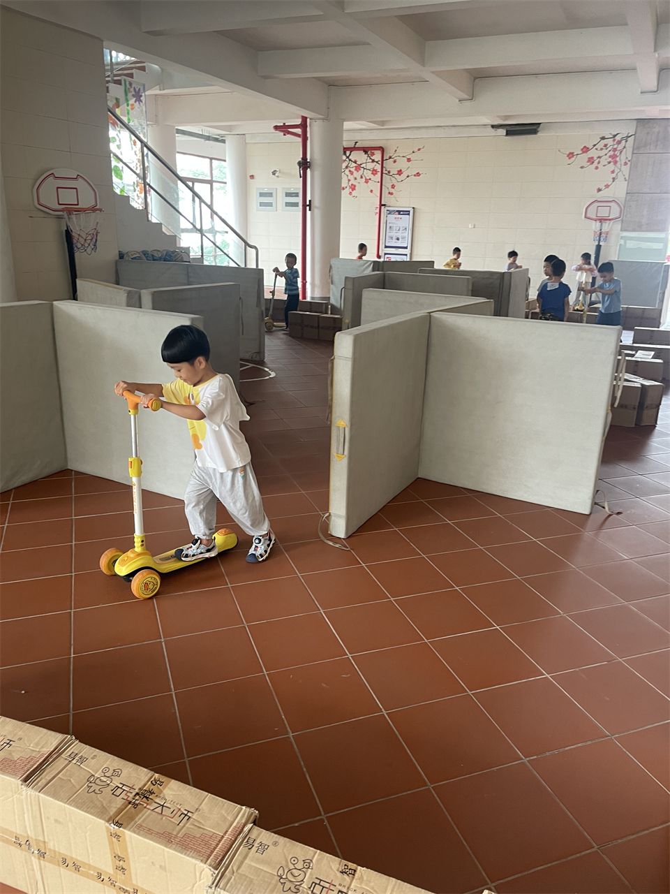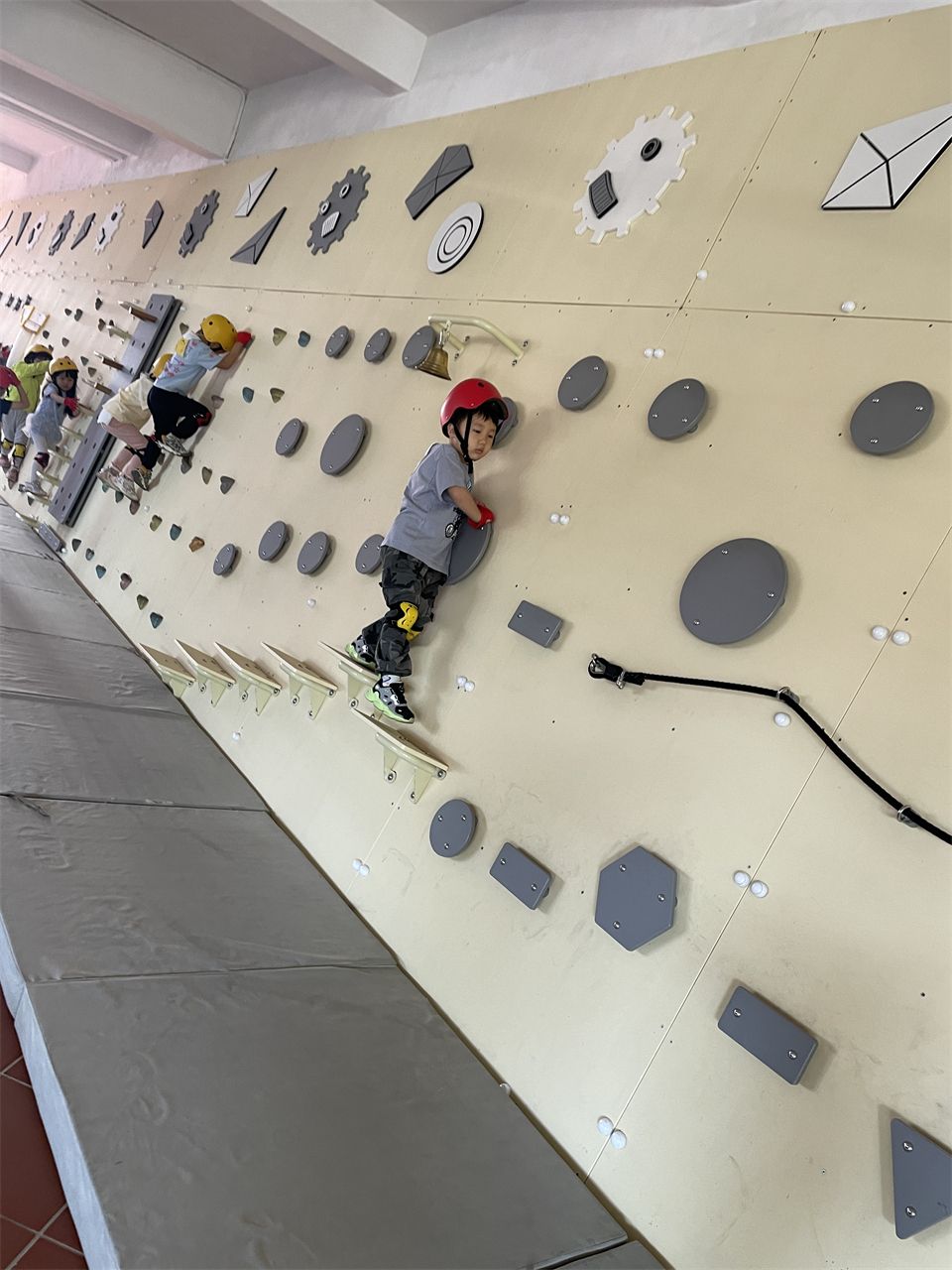 在攀爬墙前,一群孩子兴致勃勃地挑战着自己的勇气和力量。他们小手紧抓绳索,小脚蹬着墙面,一步步向上攀爬。每当成功登顶,孩子们的脸上都洋溢着胜利的喜悦和自豪。而在另一边,另一些孩子们则将多余的垫子和纸箱巧妙地摆成了一条滑板车赛道。他们骑着滑板车在赛道上飞驰,享受着速度与激情带来的快乐。