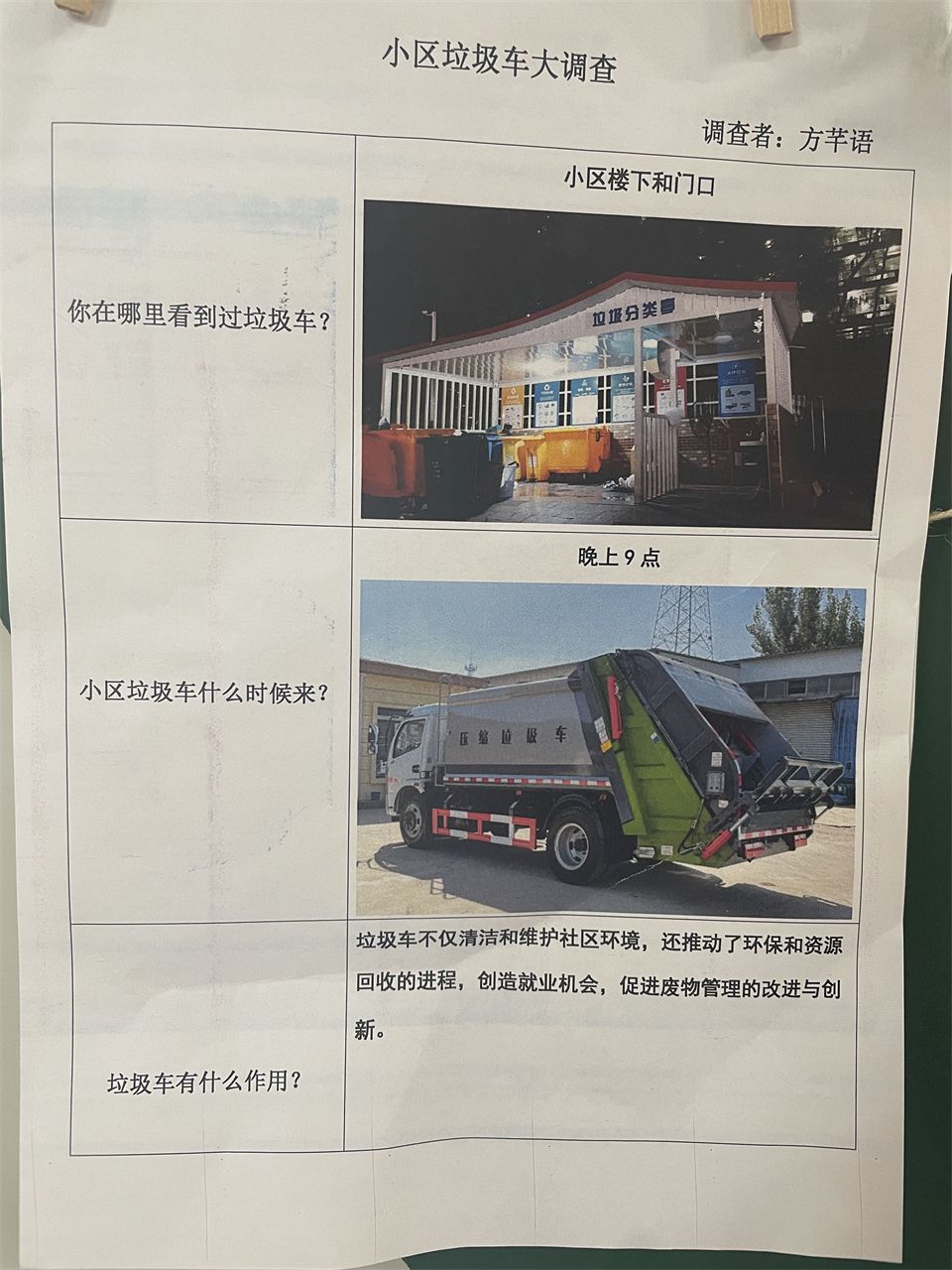 故事还得从孩子们餐后的谈话开始说起。小潘:“我每天晚上都帮阿姨清理厨余垃圾,还去倒垃圾。我看到厨余垃圾车是绿色的,我最喜欢的颜色。”小游说:“那是厨余垃圾转运车。”它是什么样子的?是怎么运垃圾的?大家七嘴八舌地讨论起来。中班的孩子开始对身边的事物好奇并喜欢观察。“小区垃圾车的调查表”帮助孩子们展开了观察的第一步。