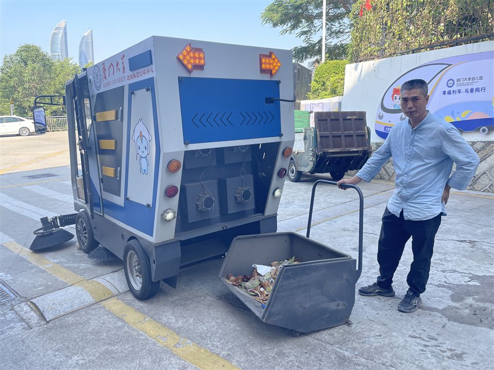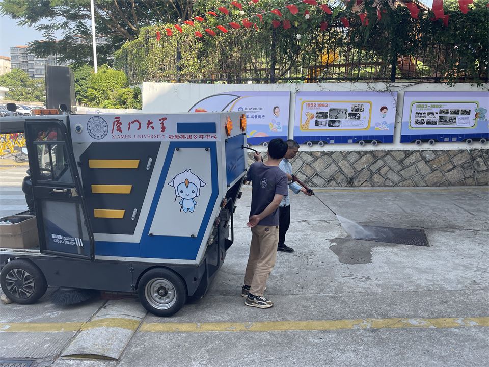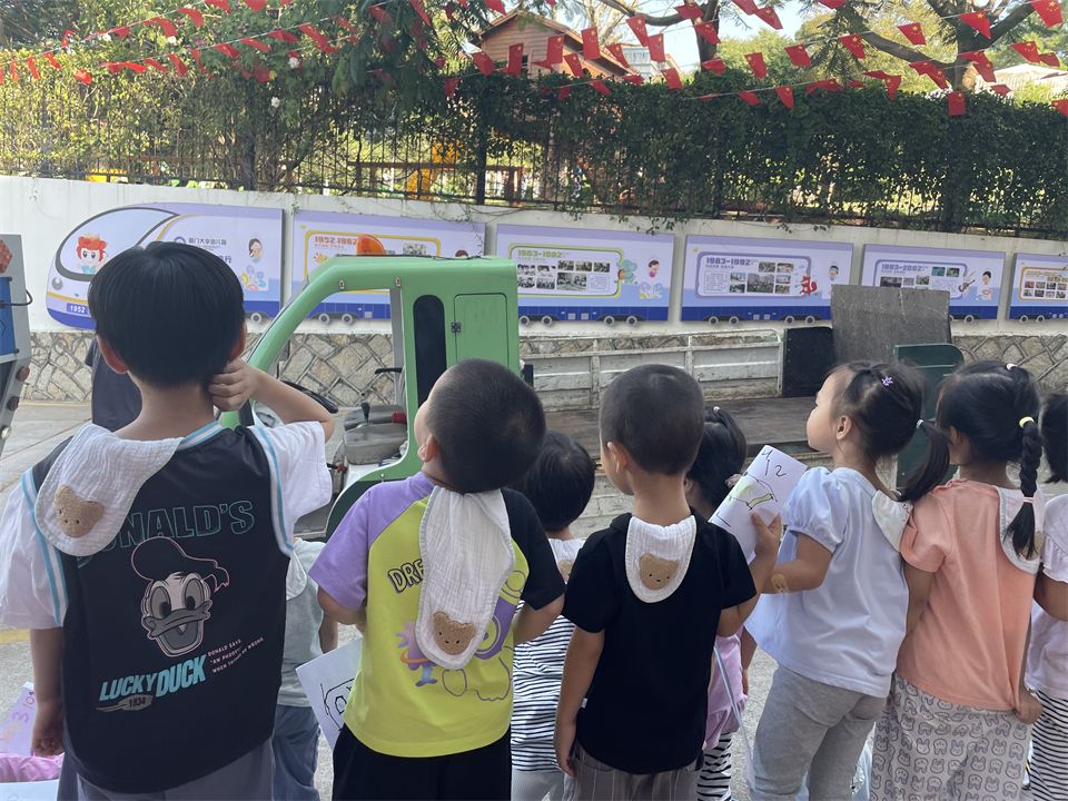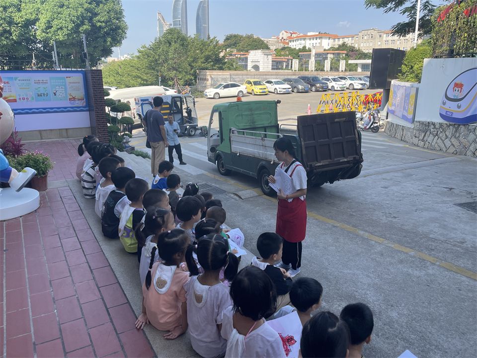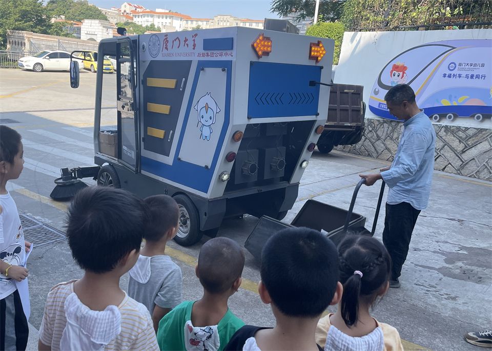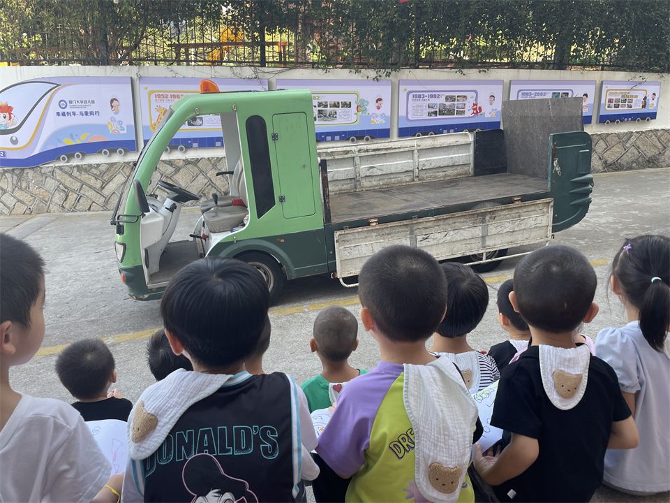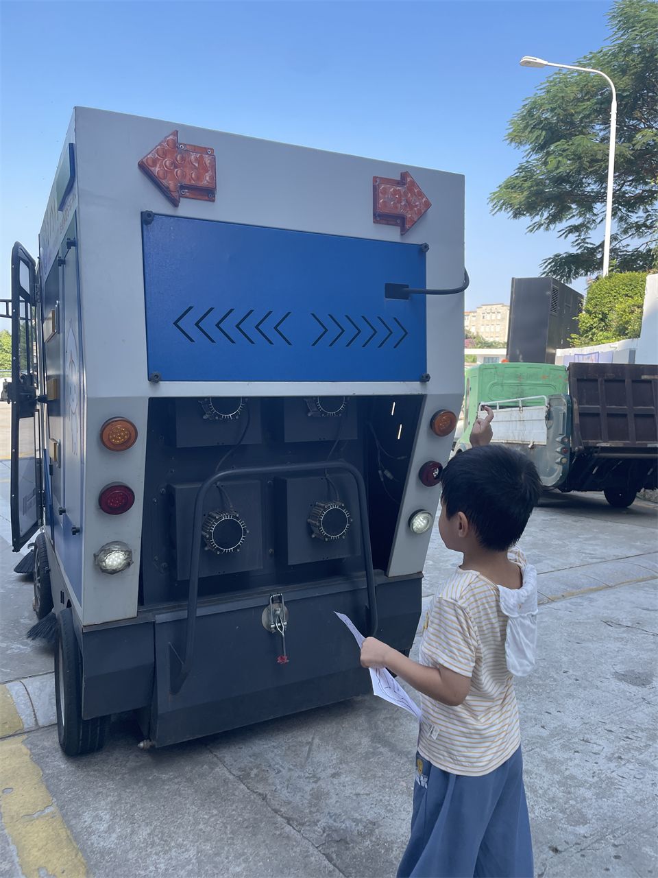 在湉言妈妈的支持下,我们联系了厦大学生公寓与环境服务中心,帮助中五班小朋友实现了愿望——近距离地观察了解了校园里道路清扫车、厨余垃圾转运车以及清洁车。瞧!它们来到了幼儿园门口。
