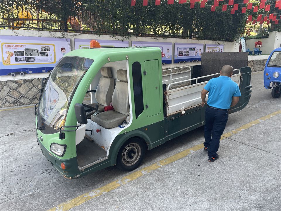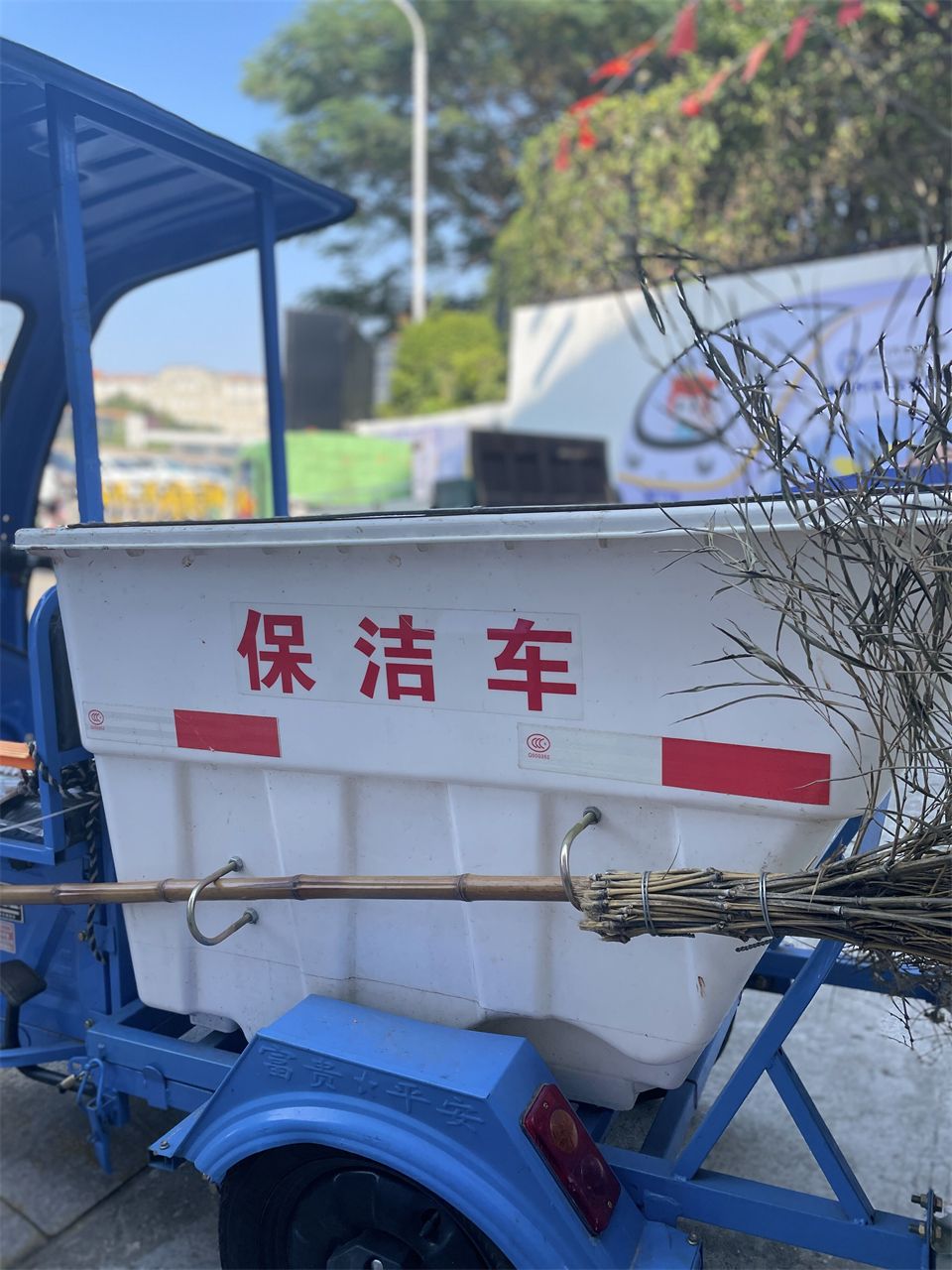 最后登场的是小巧的保洁车。车斗里的秘密由叔叔揭开了。车旁的大竹扫把能把垃圾扫起来,再用小扫地扫把扫到畚斗里,这个车也是即走即停,非常方便。