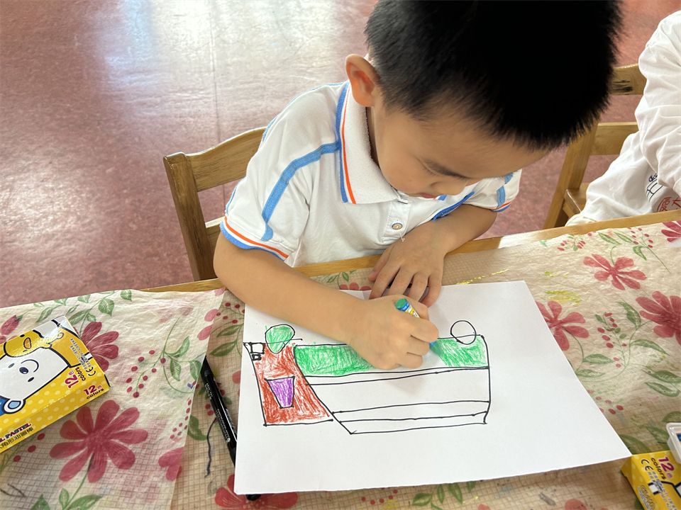 在班级里,我们让幼儿画出“眼中的垃圾车”,有的选择画清扫车,有的画垃圾转运车,五颜六色的卡通垃圾车在孩子稚嫩的笔下显得尤为可爱。这些画我们是要带着和真正的垃圾车比较的哦,我要认真点画。