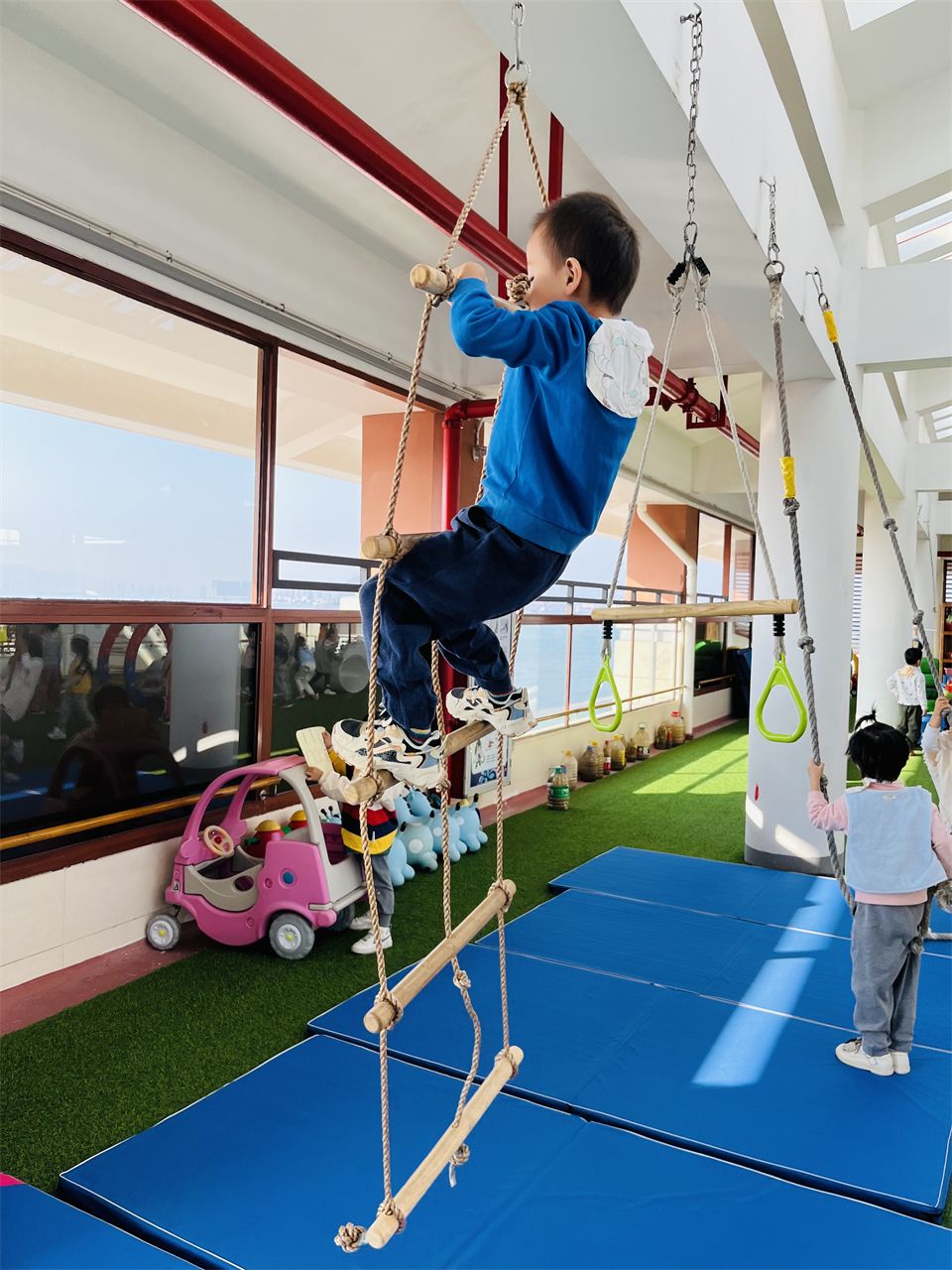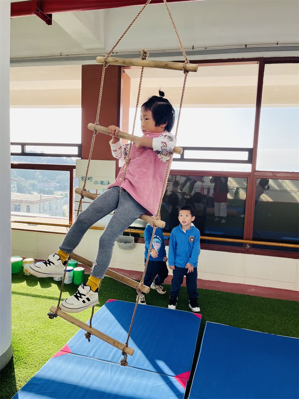 攀爬区的进阶版,天台攀爬绳和攀爬梯。刚开始孩子们还不知道怎么玩,将攀爬梯当秋千来玩,慢慢地胆大的孩子多了,敢顺着梯子继续往上爬,往上爬一格再爬一格,可真勇敢呀。