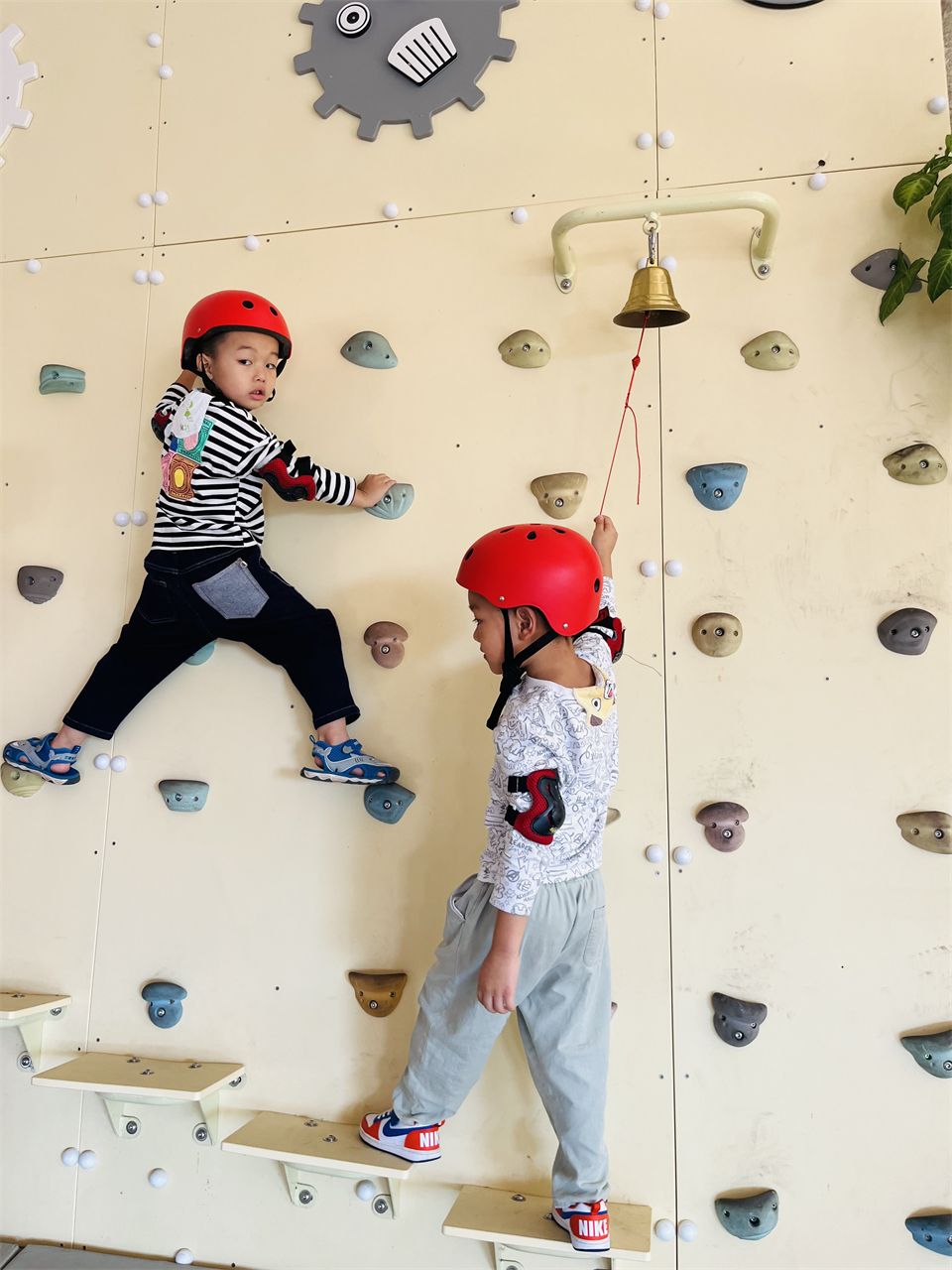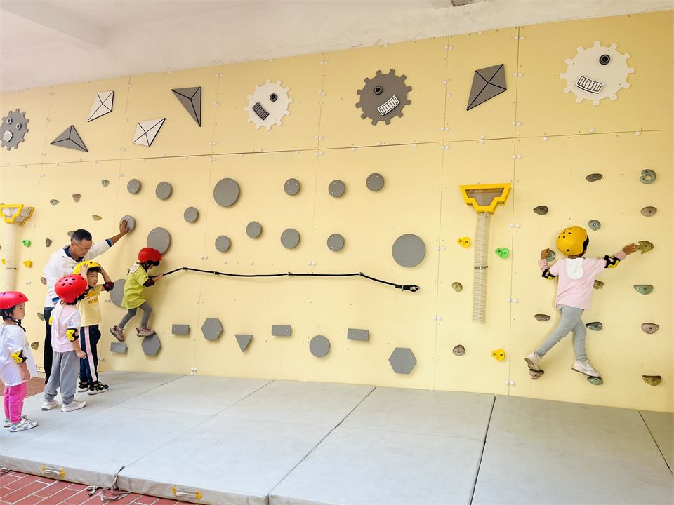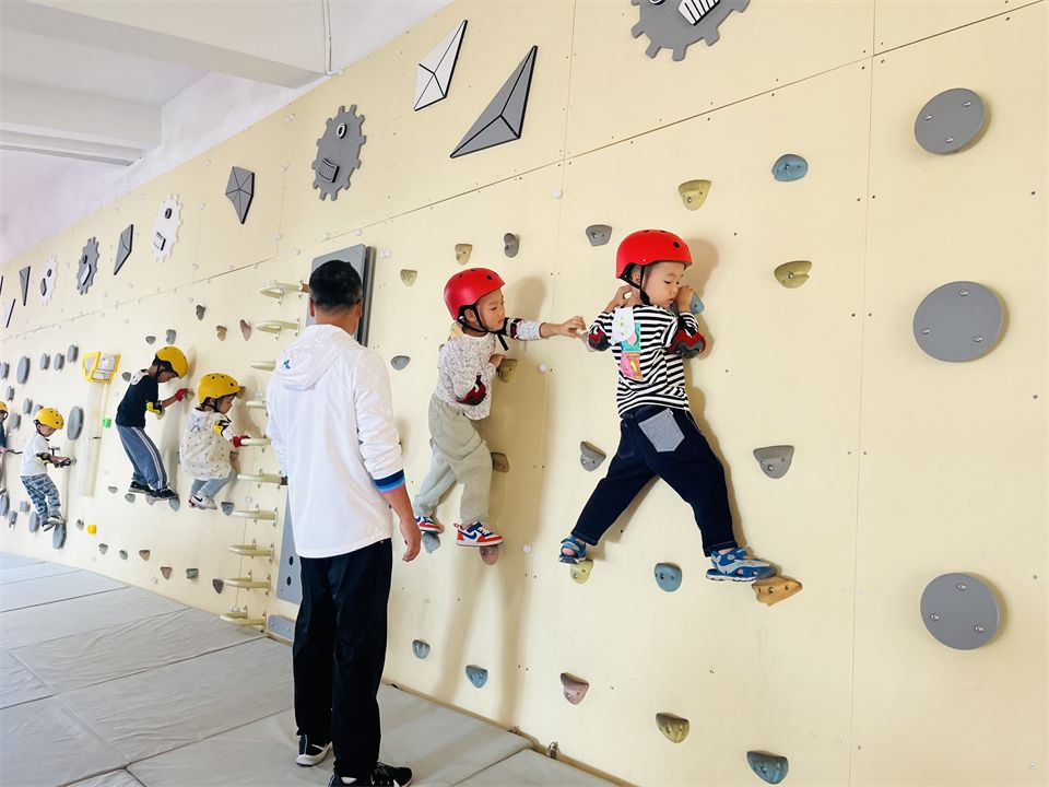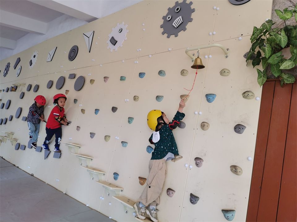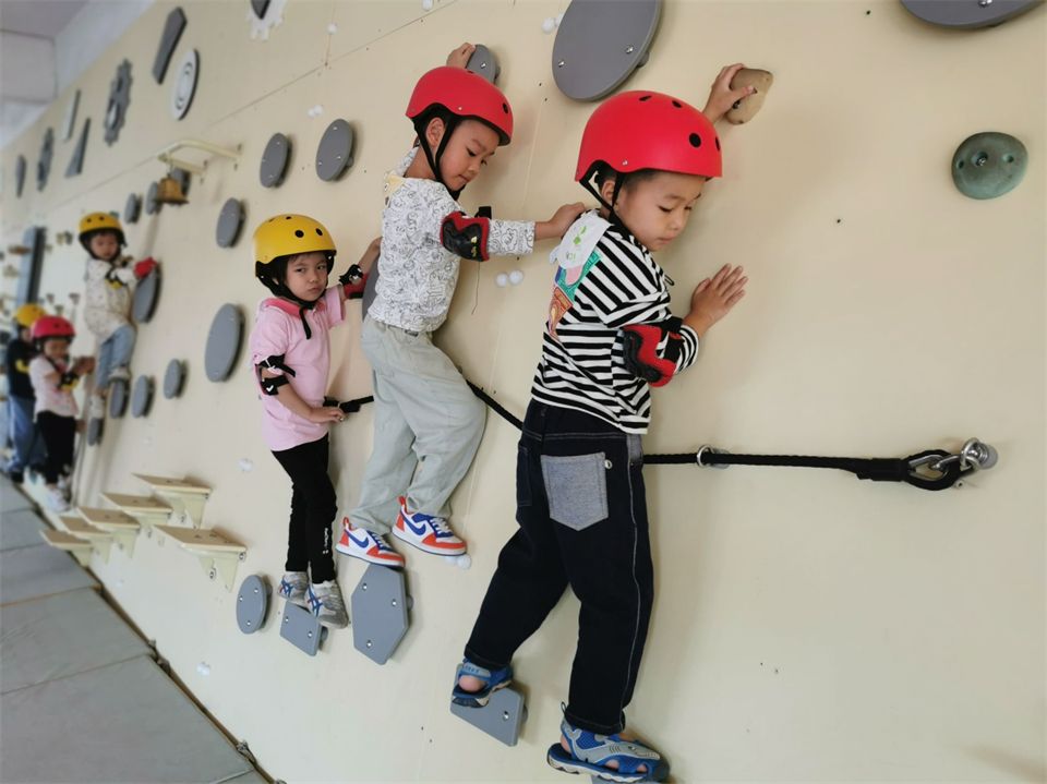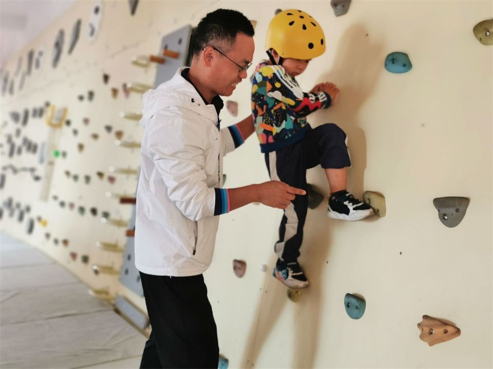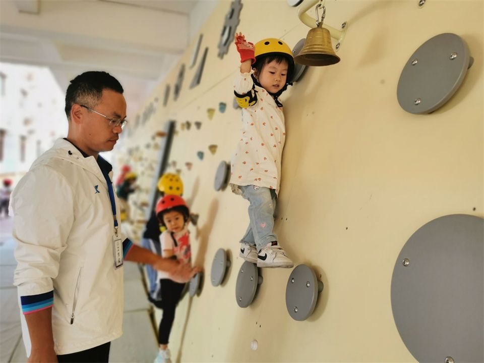 看着孩子们对攀爬类游戏如此感兴趣,幼儿园又有着各式各样的攀爬墙、攀石墙,甚至还有大片的攀岩墙。老师们邀请厦门大学体育部的徐老师和骆老师带孩子们玩转攀岩墙。