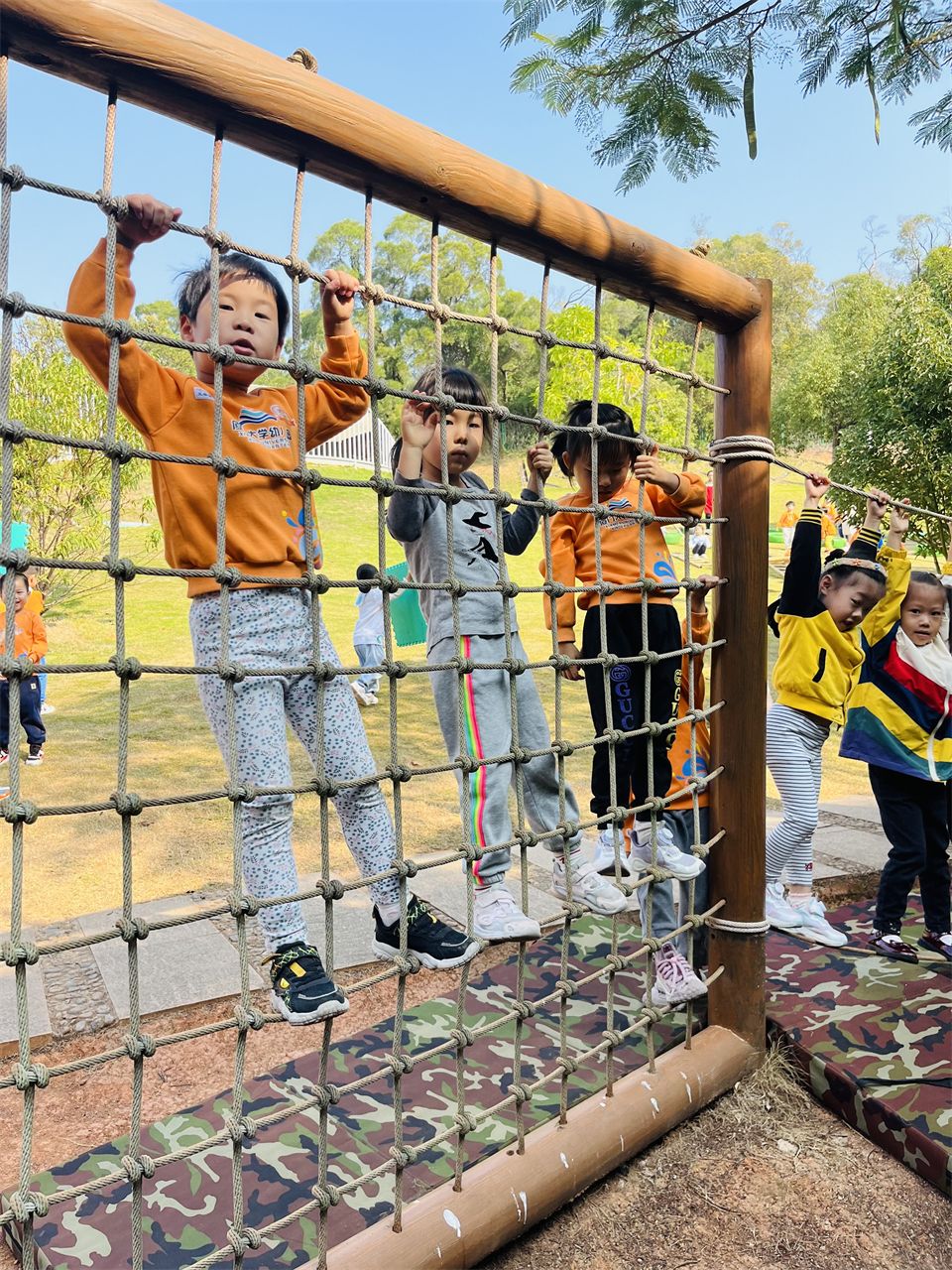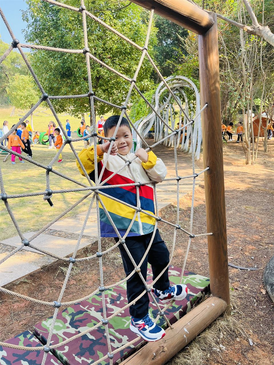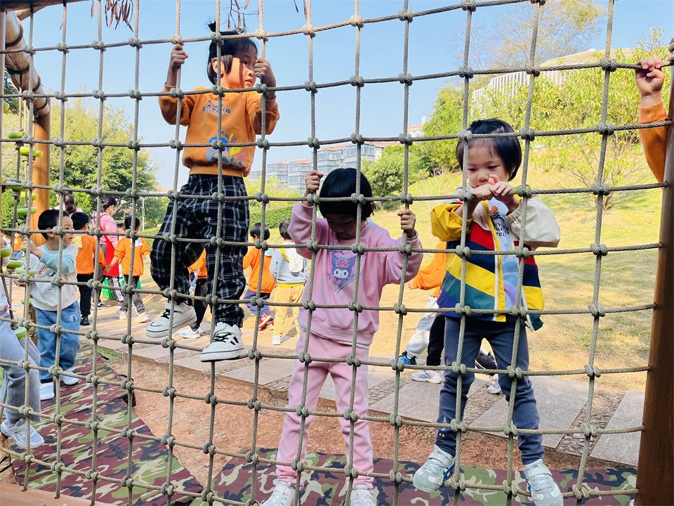 小山坡的攀爬组合是孩子们最爱玩的地方,这里有“蜘蛛网”、“梅花桩”、“攀爬网”等等,难度系数较低,孩子们很快能在攀爬区爬上爬下了。