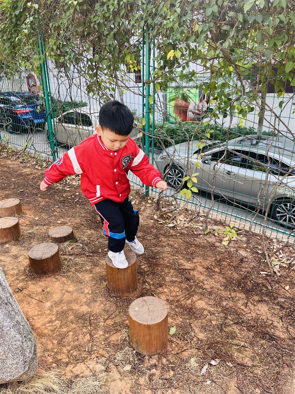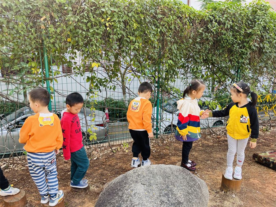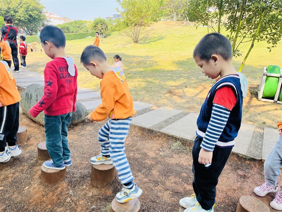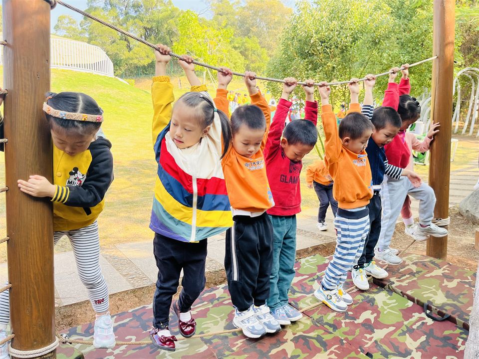 小山坡的攀爬组合是孩子们最爱玩的地方,这里有“蜘蛛网”、“梅花桩”、“攀爬网”等等,难度系数较低,孩子们很快能在攀爬区爬上爬下了。