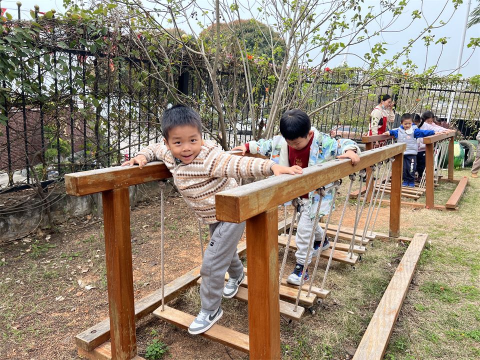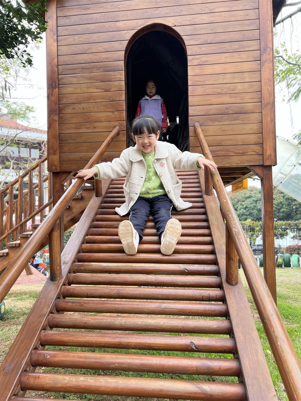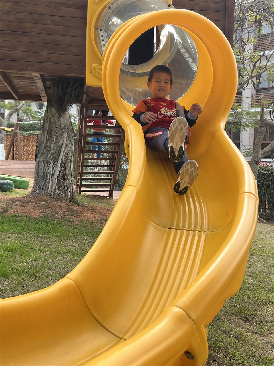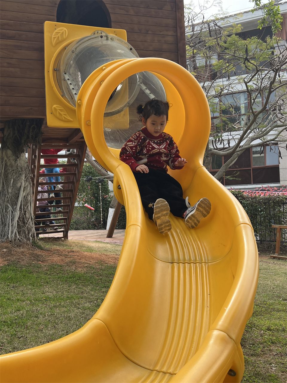 绿油油的山坡总是深受孩子们的喜爱,“我喜欢在小山坡玩降落伞的游戏。”“我们来比一比谁的降落伞飞得高!”;有的宝贝从小树屋的滑滑梯上“咻”的一下,滑了下来,开心极了!还有的宝贝正在索桥上通行,小心谨慎地扶着把手,顺利闯关。还有的宝贝甚至就是那么简单地迎风奔跑而下,满脸的灿烂笑容,他们一起找寻着山坡的秘密……