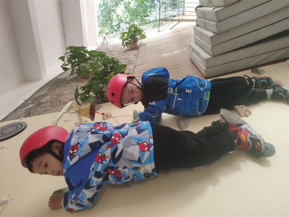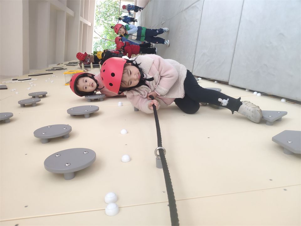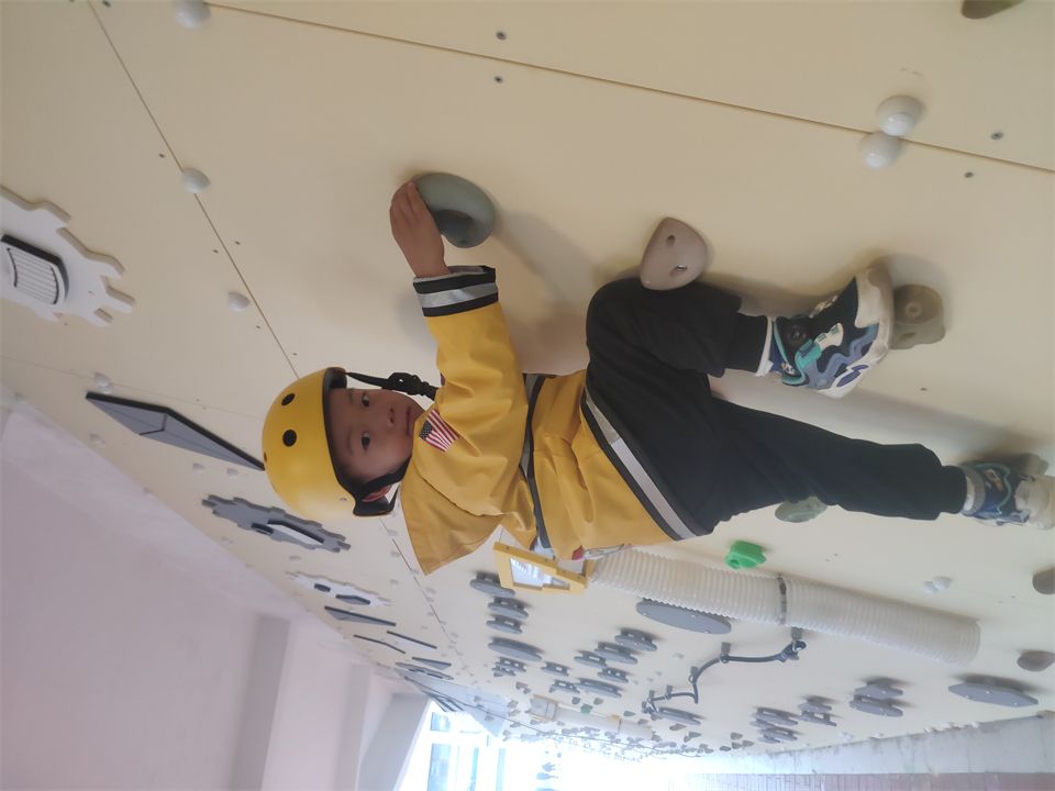 快看!孩子们戴上了安全头盔和护具,正玩着攀爬墙,各种闯关,是不是很厉害呀?!